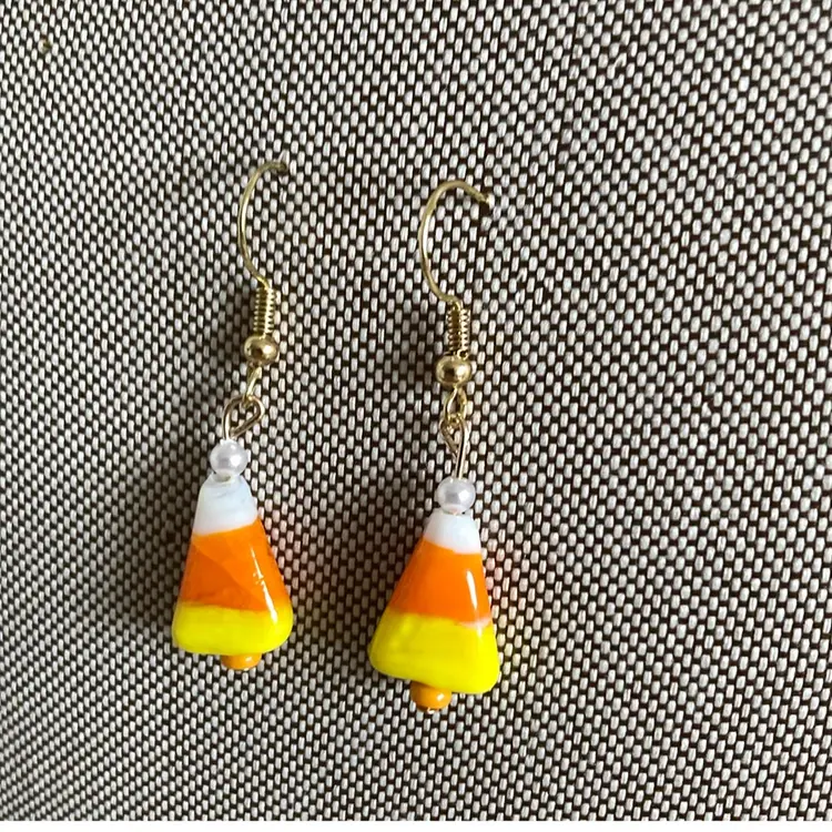 Vintage lampwork glass Halloween candy corn drop earrings. Each bead is handmade so will have natural variation in tgem. The earrings measure 1/2” x 1 3/4”.