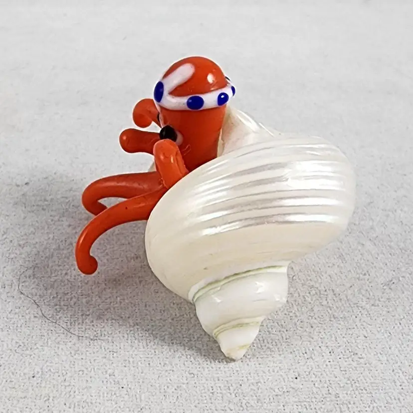 Colorful lampworked art glass octopus sitting inside a real, conch seashell. The octopus is a bright orange color with white, blue, and black details around the head. The shell is a luminous, polished off-white color.