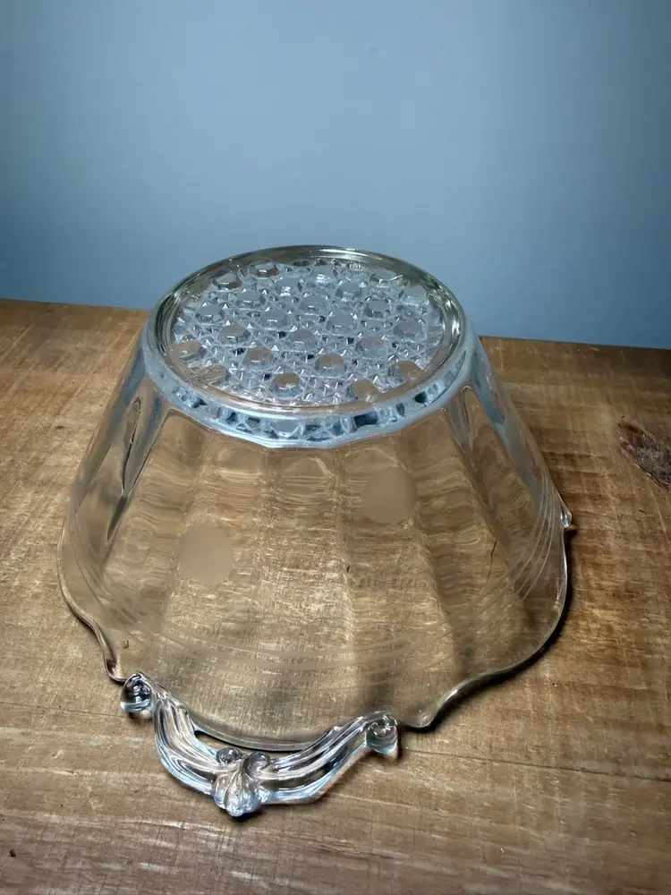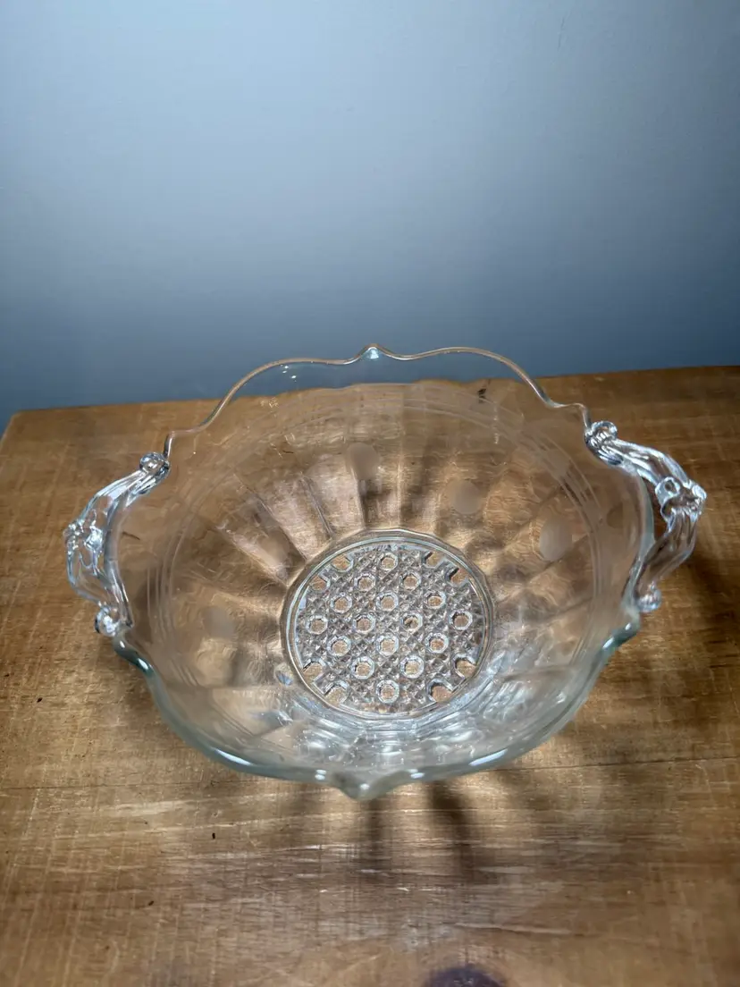 Vintage Clear Glass Landrum Handled Bowl, featuring an etched polka dot design and a detailed cane pattern bottom. This elegant piece includes a ruffled/scalloped rim and decorative dual handles. Perfect for serving or as a decorative centerpiece. Excellent vintage condition with no chips or cracks. Clear glass with frosted etched details.