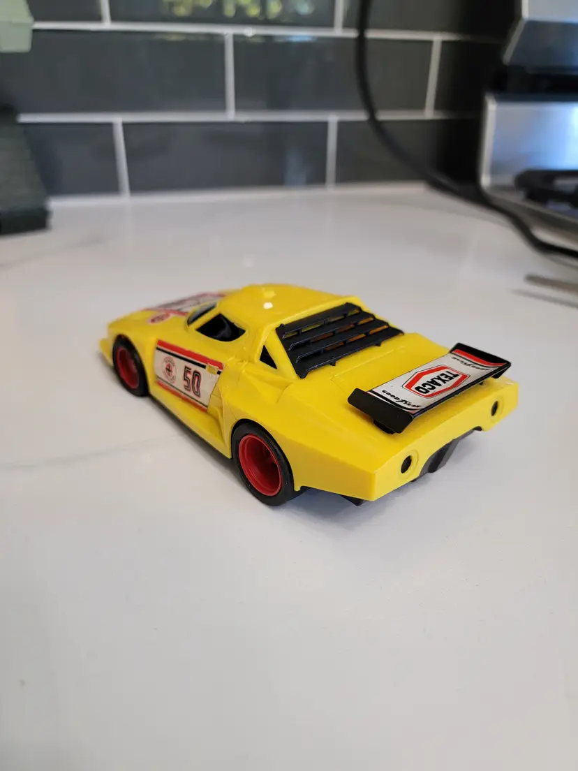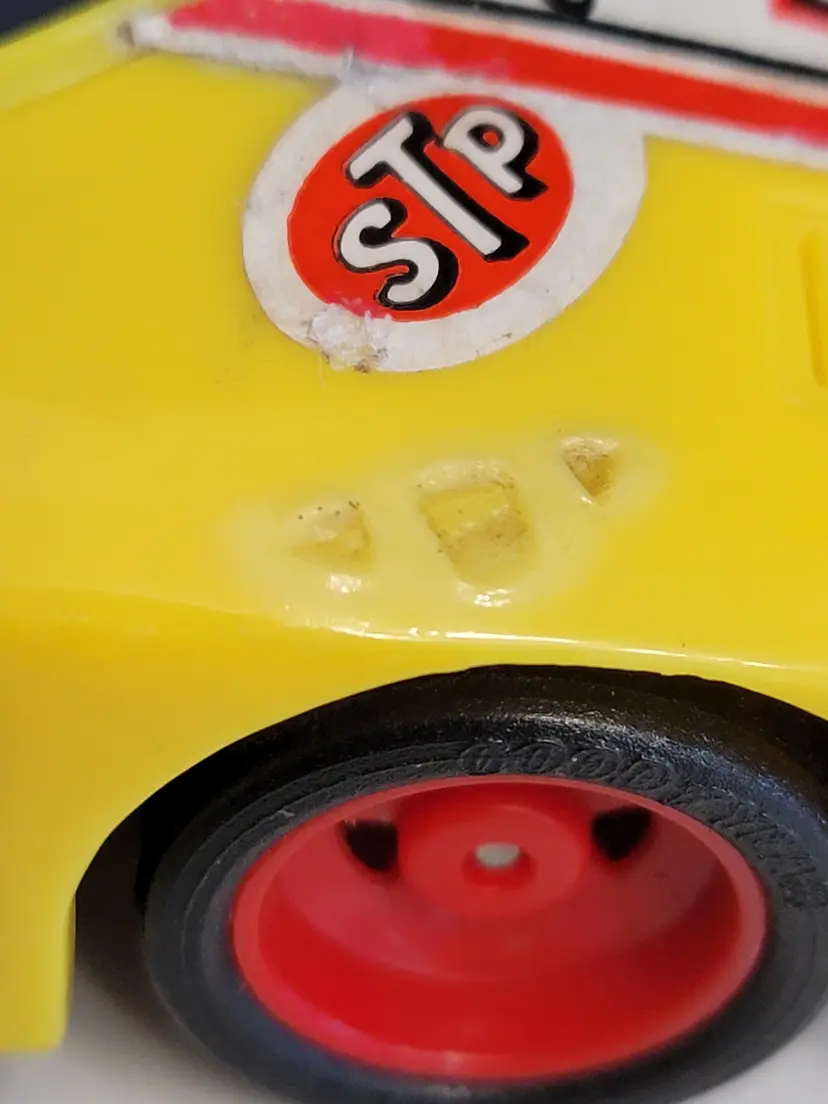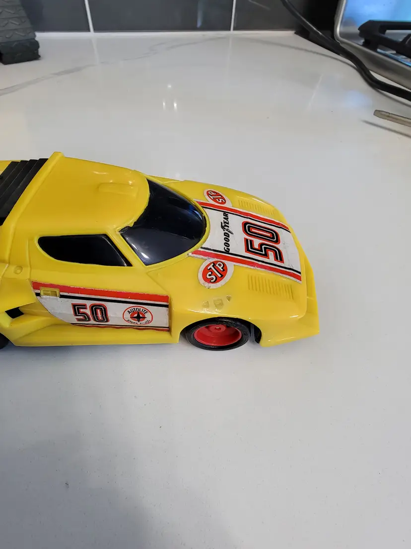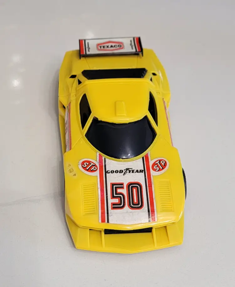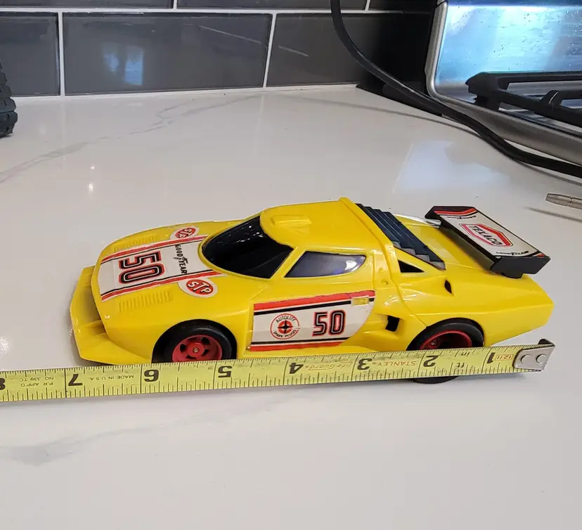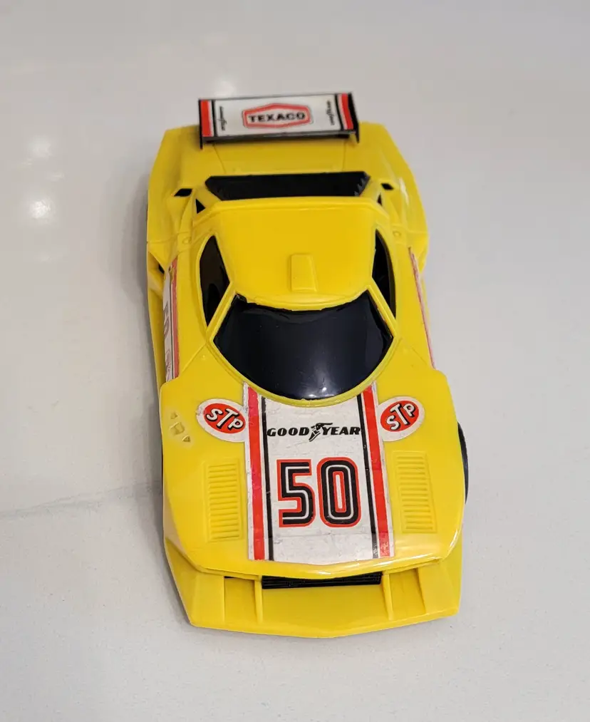 This Lancia Stratos Group 5 toy originally had a pull cord but that is now missing. It can still be wound by pulling the car backwards. The mechanism is fine and a pull cord can be reinstalled. The top of the right fender appears to have heat damage as seen in photos. Car is plastic with metal workings.