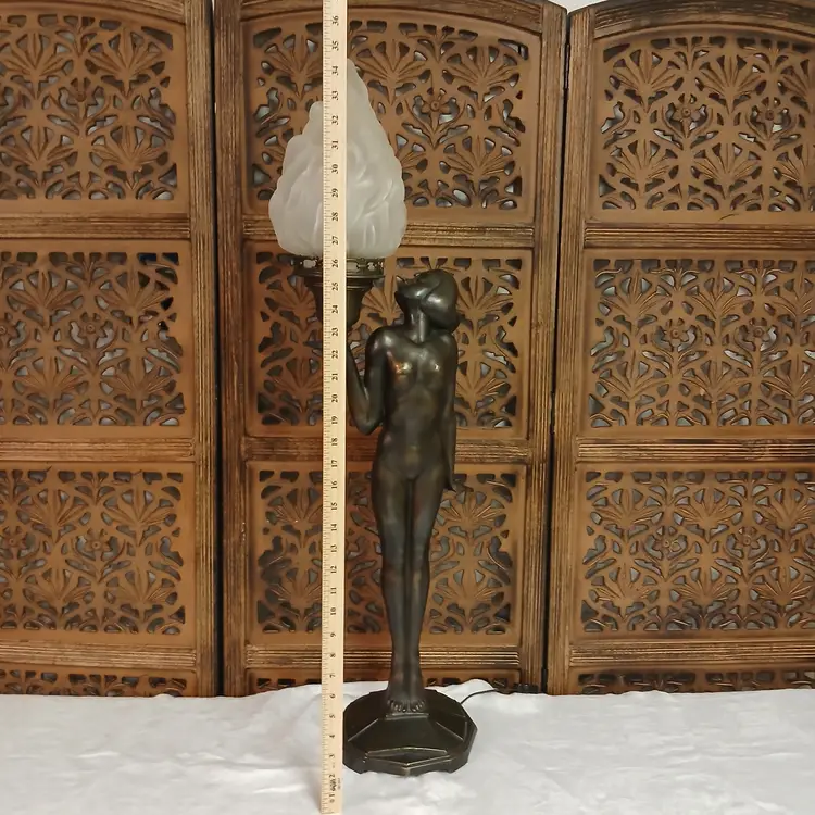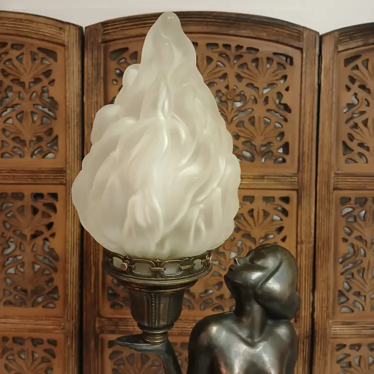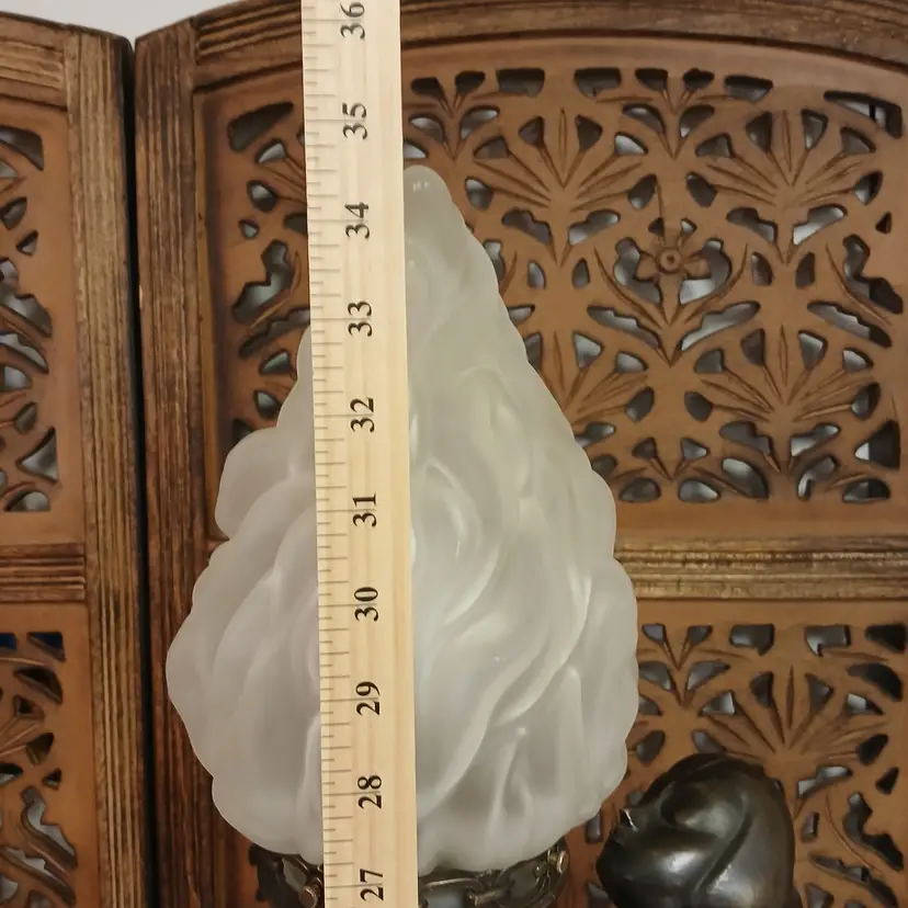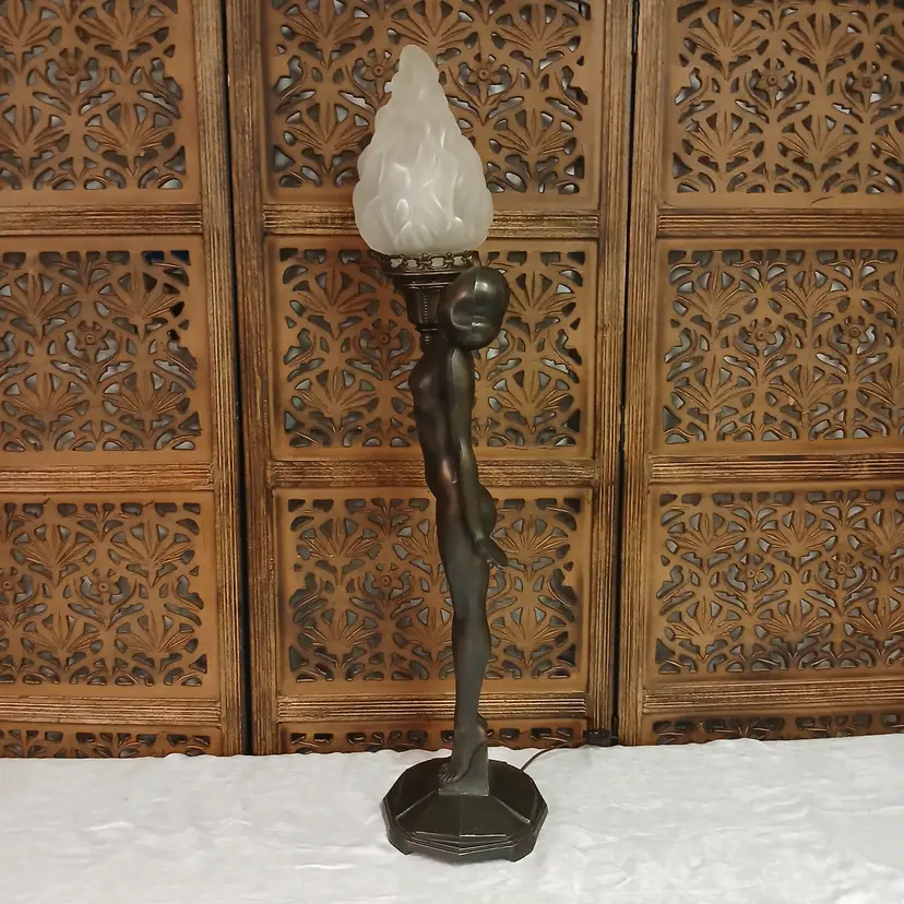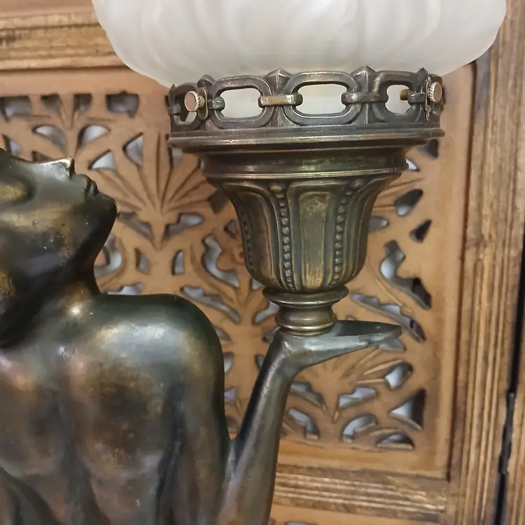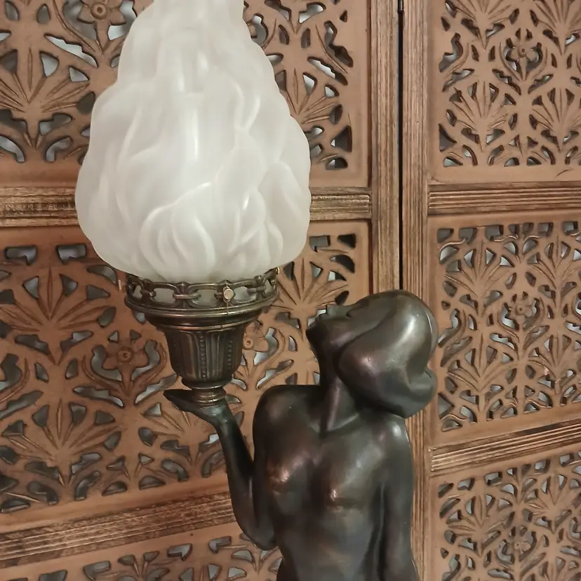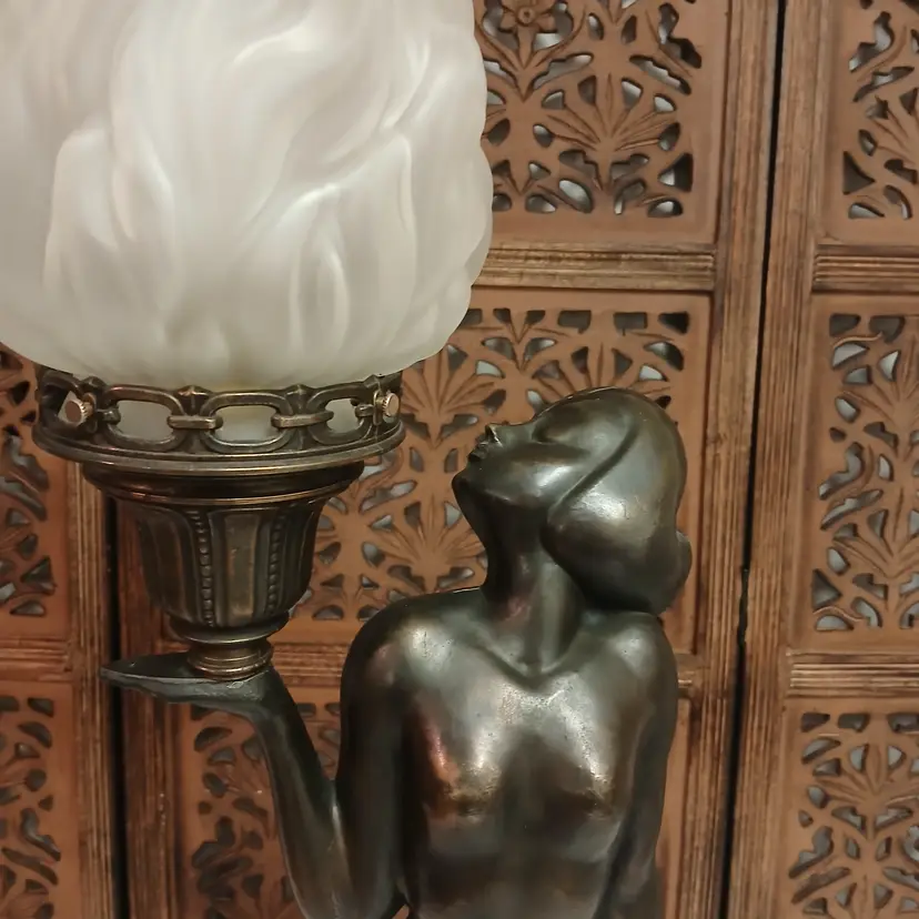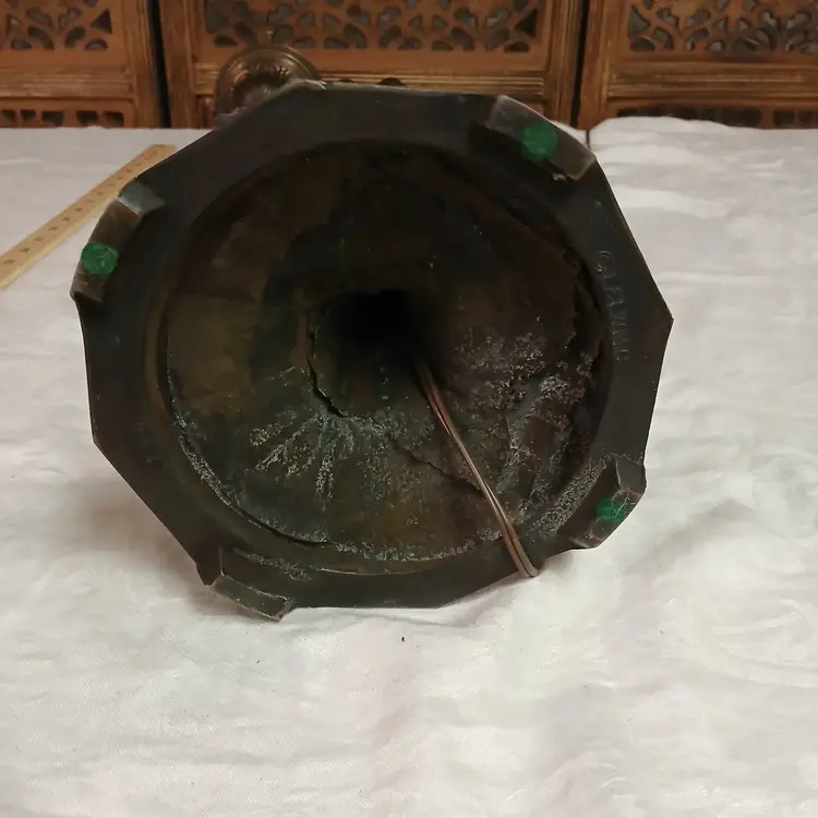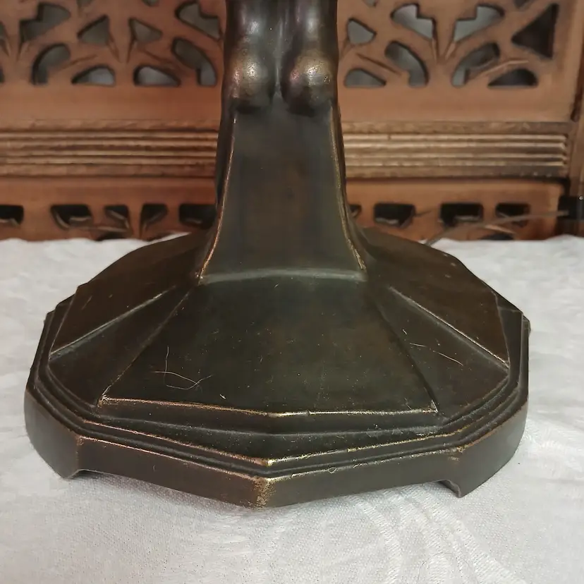 This lamp is stunningly beautiful! I was told by a lamp collector that she likely began as an ashtray and was converted at some point into a lamp based on the flat palm. It makes sense to me. The holder for the bulb and glass shade will turn. Not tighten but turn, also pointing toward a conversion. Regardless of her beginnings, she is a beauty at almost 3 feet tall and over 10 pounds. The photos give you an idea of how gorgeous this lamp is, but ou really have to see it in person to get the whole effect! Please let me know if you have questions or need additional photos.