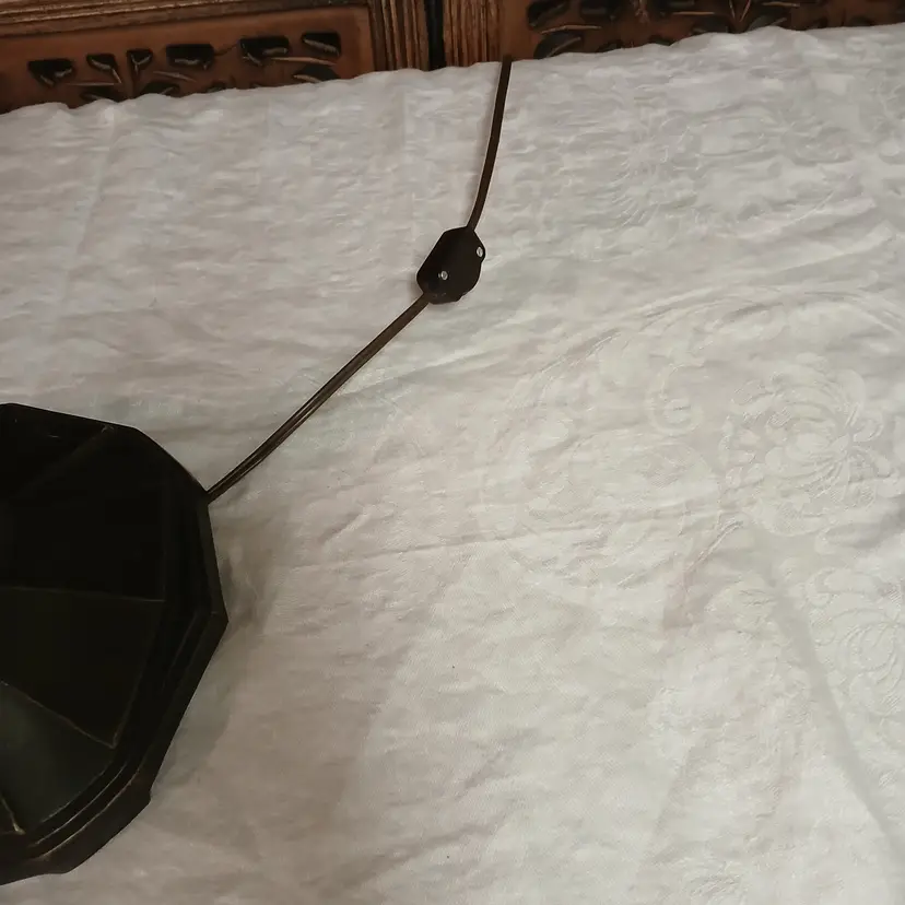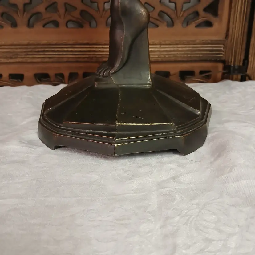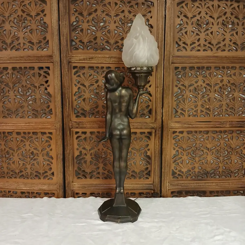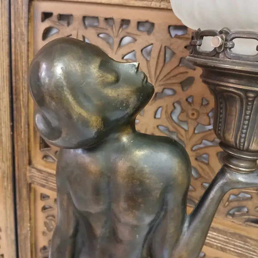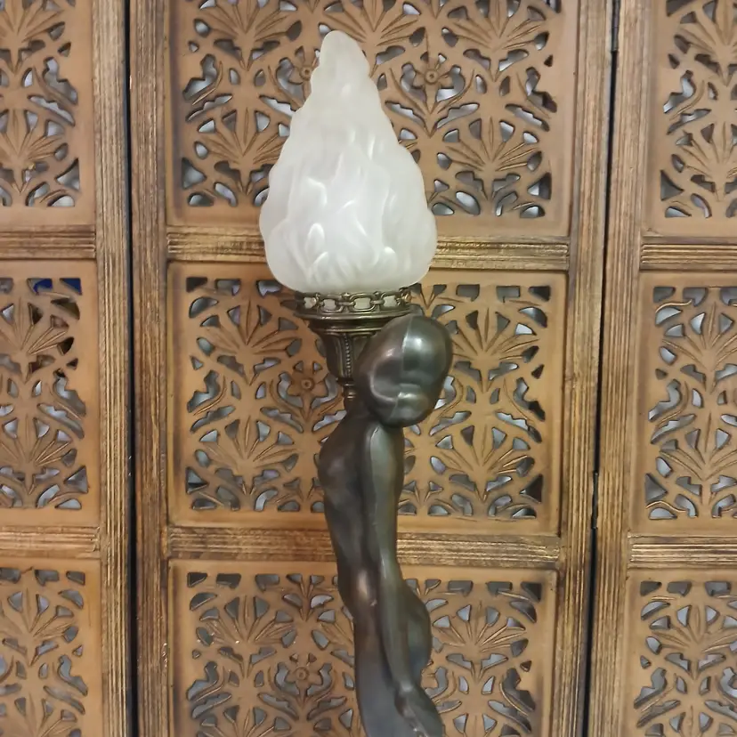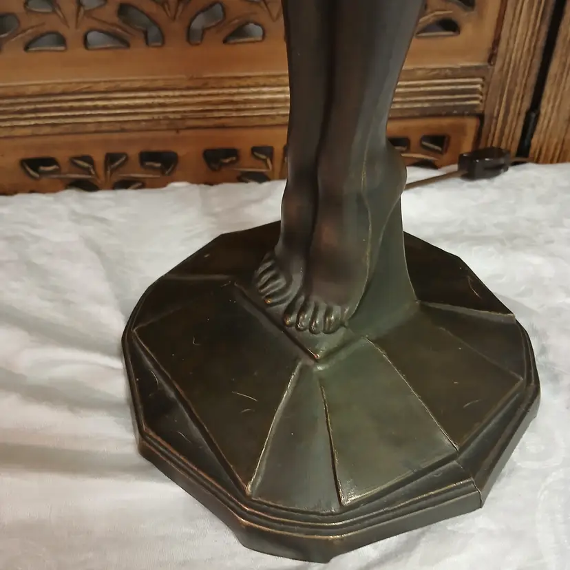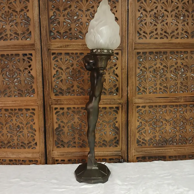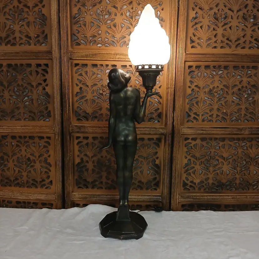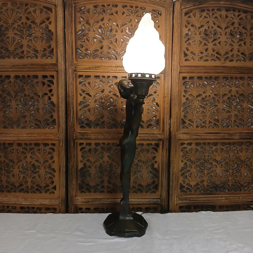 This lamp is stunningly beautiful! I was told by a lamp collector that she likely began as an ashtray and was converted at some point into a lamp based on the flat palm. It makes sense to me. The holder for the bulb and glass shade will turn. Not tighten but turn, also pointing toward a conversion. Regardless of her beginnings, she is a beauty at almost 3 feet tall and over 10 pounds. The photos give you an idea of how gorgeous this lamp is, but ou really have to see it in person to get the whole effect! Please let me know if you have questions or need additional photos.