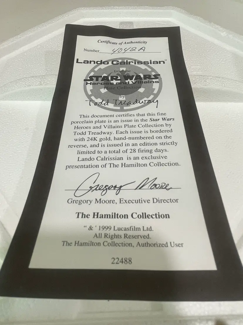 Lando Calrissian plate of Star Wars from Heroes and Villians collection of Hamilton. All plates are New in original styrofoam and has CoA a shown.