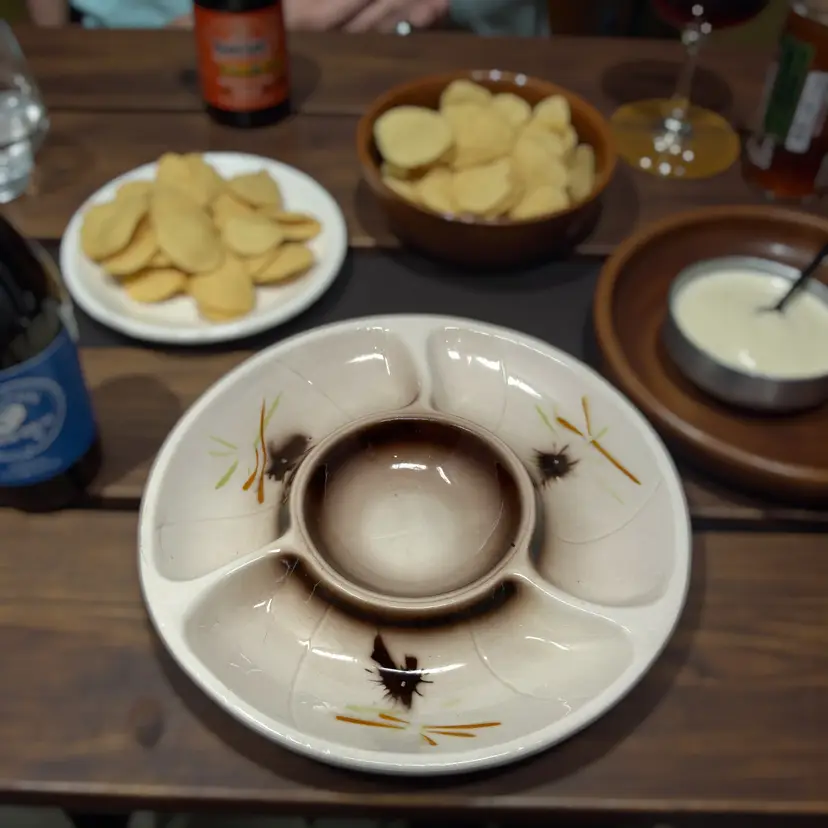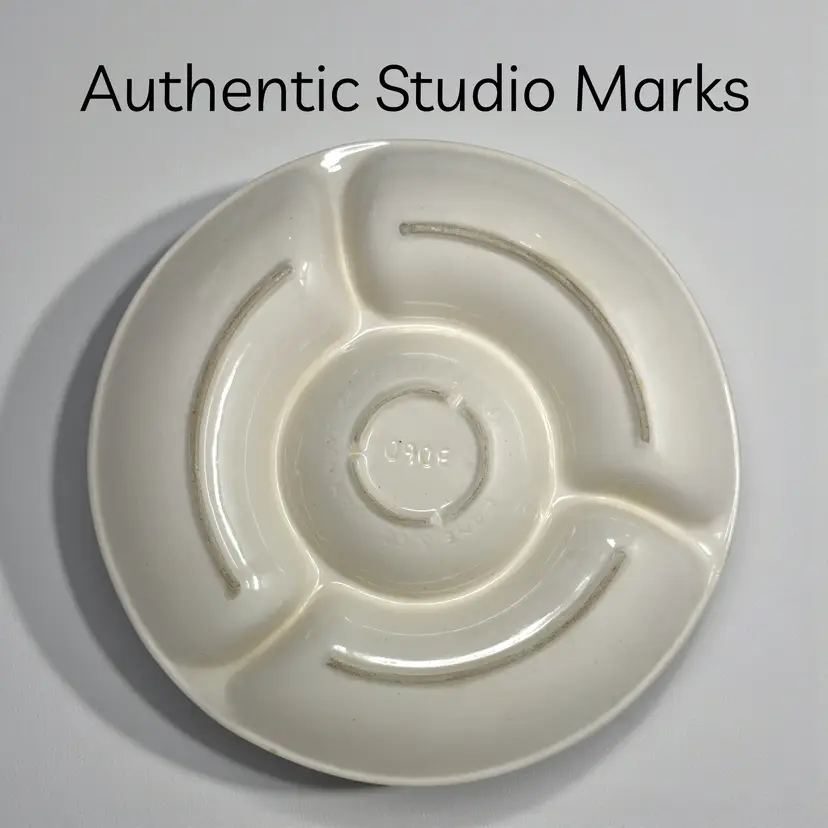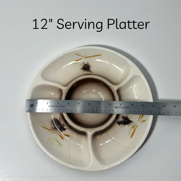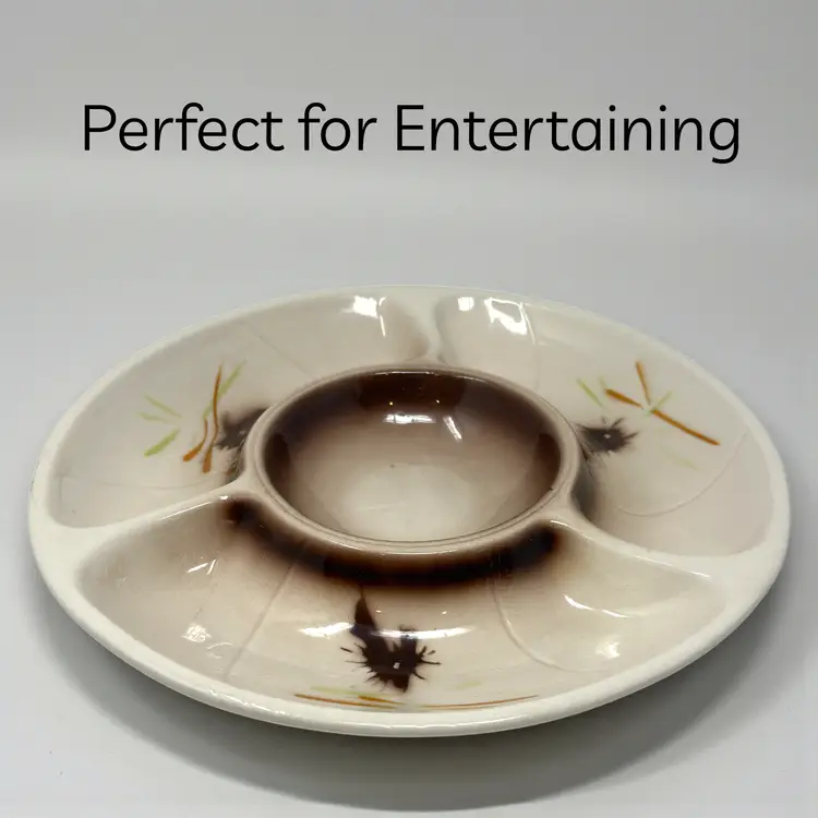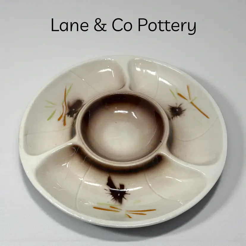 This Lane & Co serving plate was made in Van Nuys, California during the height of mid-century entertaining culture. Designed with a central dip well and four surrounding compartments, it reflects the casual yet stylish hosting trends of the 1950s–1960s.