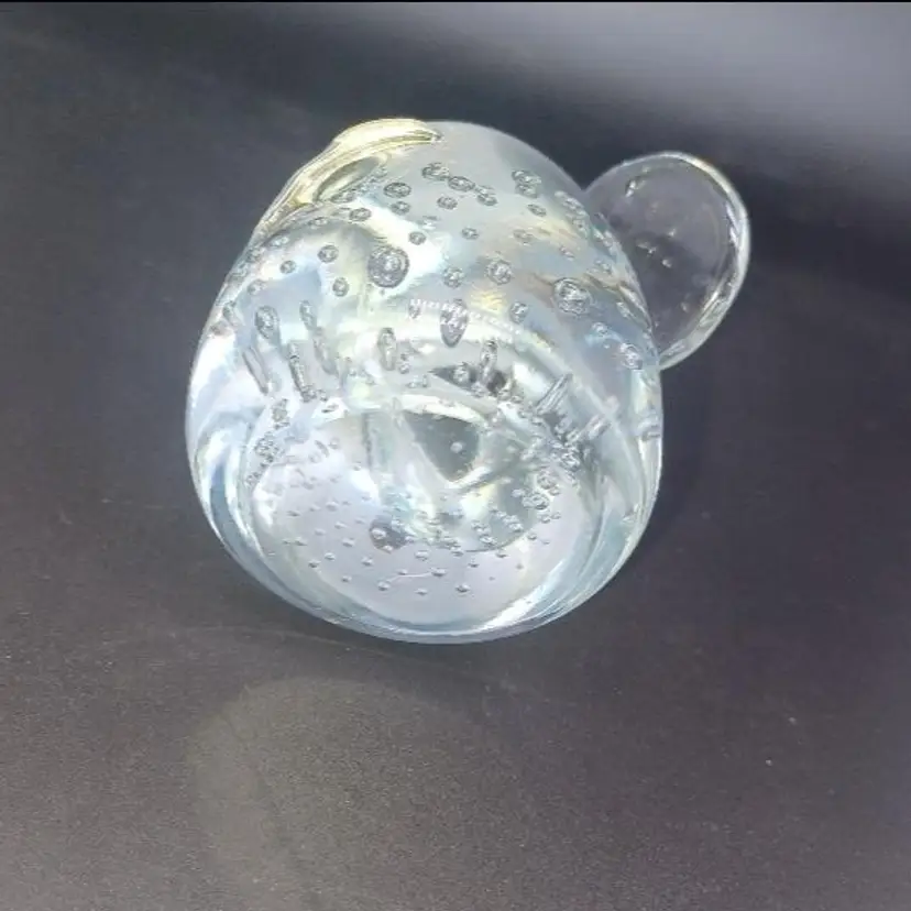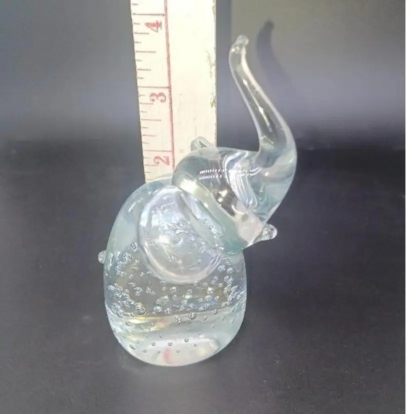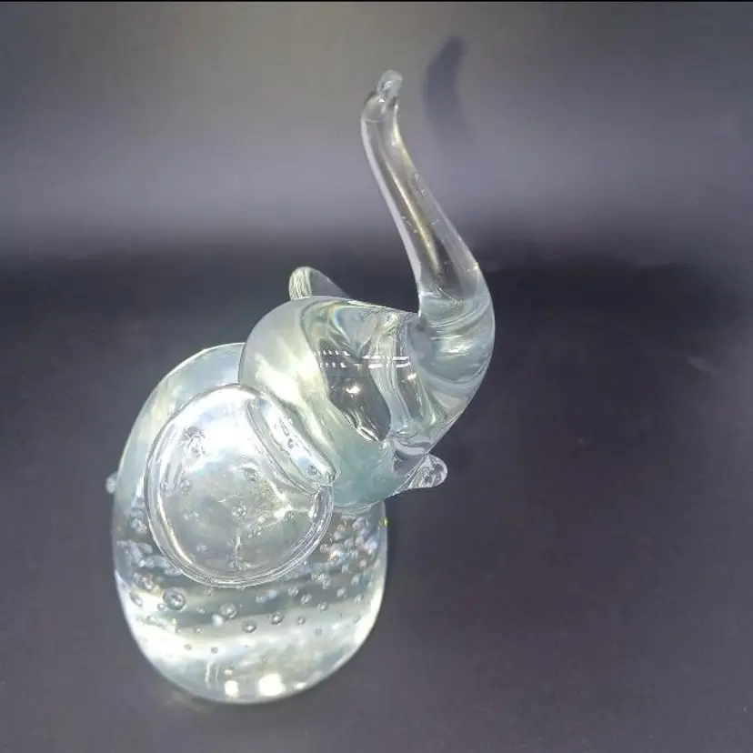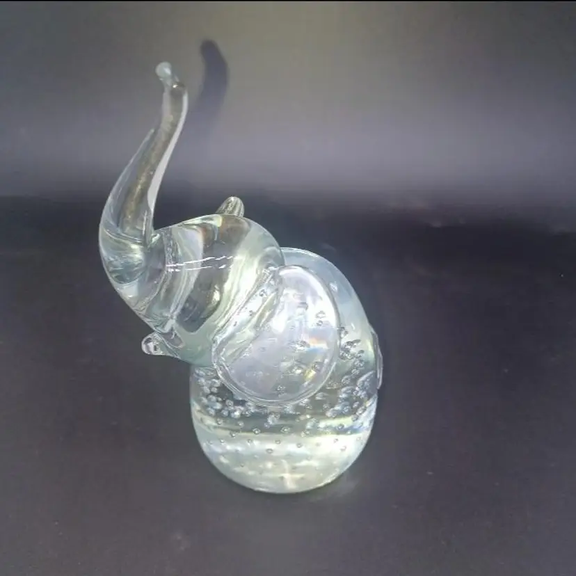 Beautiful clear glass elephant with nice controlled Bella. Contact bubbles, nice polished bottom. no manufacturing sticker, but does compare 2mto items with the manufacturing sticker could possibly also be Murano. Please see all pictures as they are the best description. All items from a smoke free home with pets experienced glass shipper Measures 4in to top of trunk