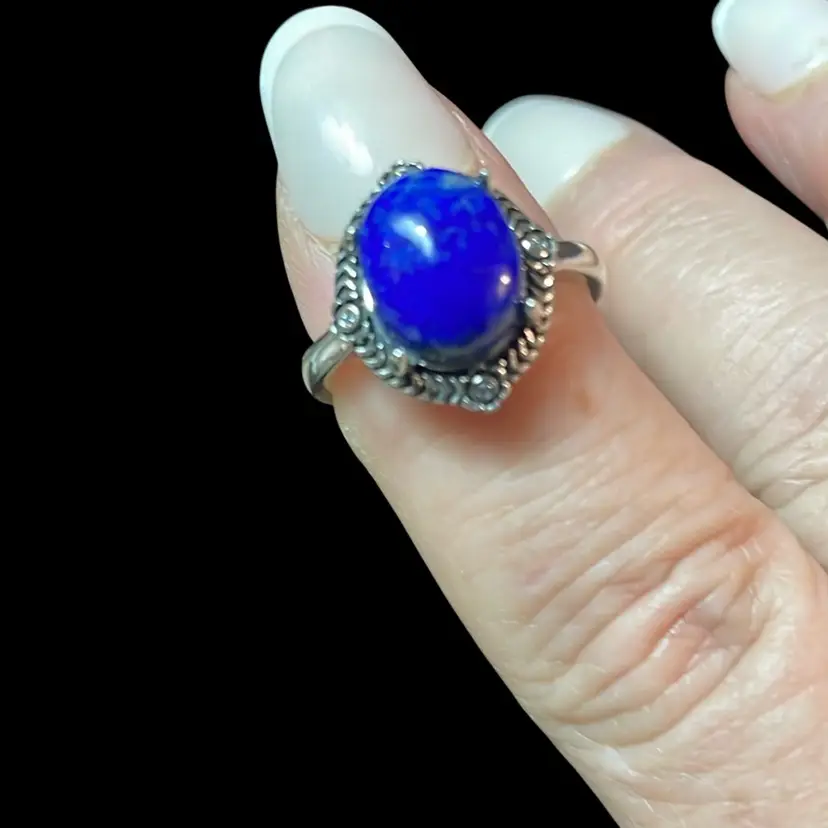 The gemstone is a deep-blue metamorphic rock known as lapis lazuli, which has been prized since antiquity for its intense color. The characteristic golden specks within the blue stone are caused by inclusions of pyrite. The stone is typically associated with wisdom, truth, honor, and power. The metal appears to be sterling silver, a common setting for lapis lazuli jewelry.