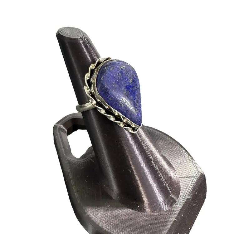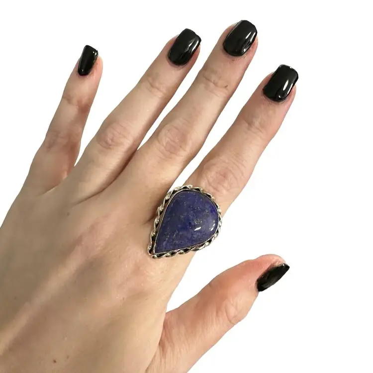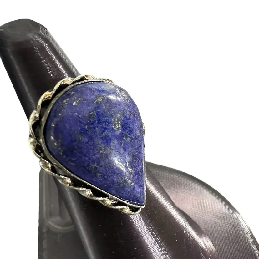 Lapis lazuli stone with thing sterling silver plated band A historic gemstone with an intense blue color and gold flecks. It's said to combine the powers of heaven and earth. Women's size 7, new Braided silver setting, chunky stone Boho, natural