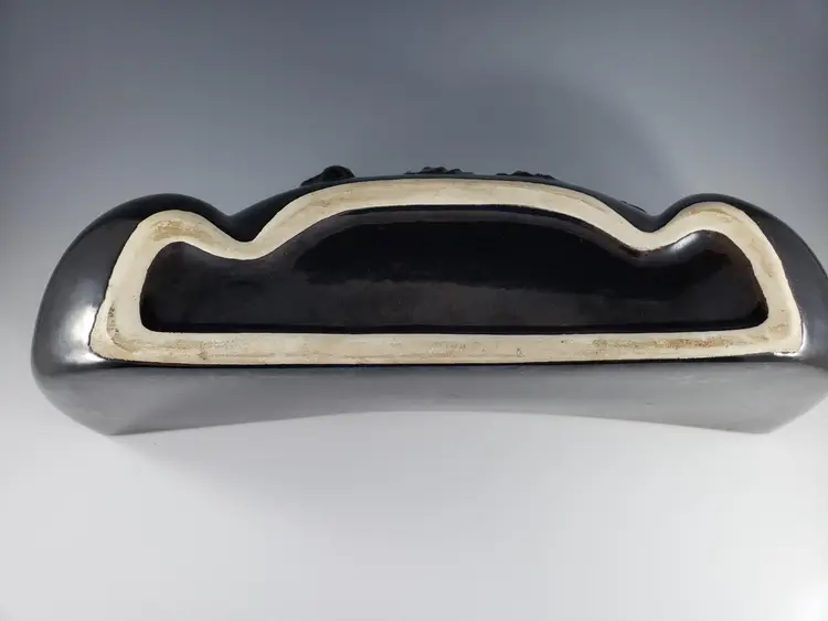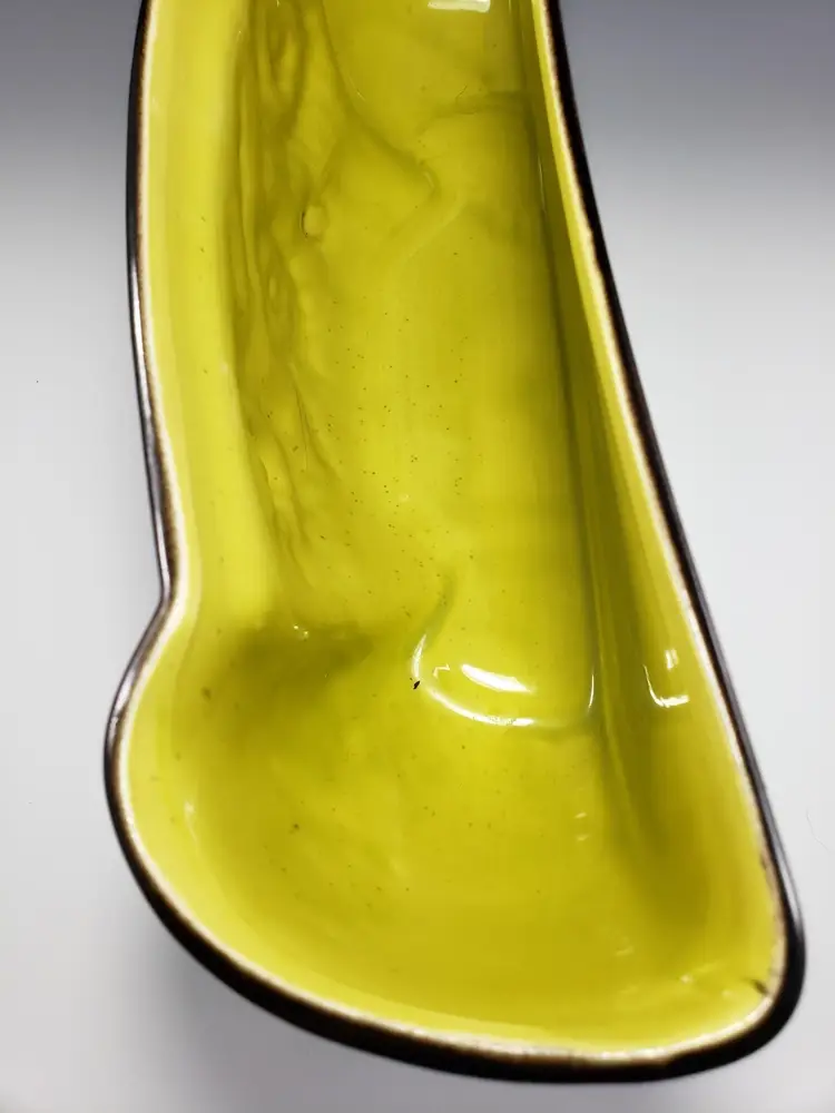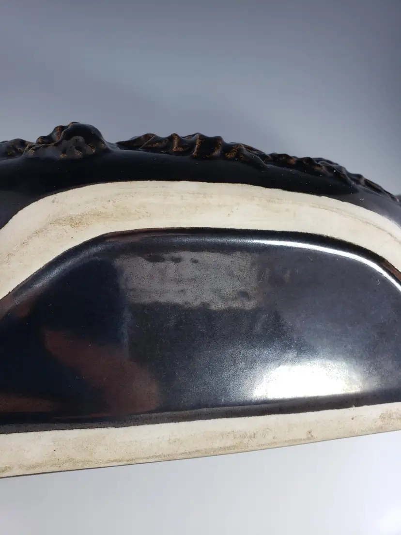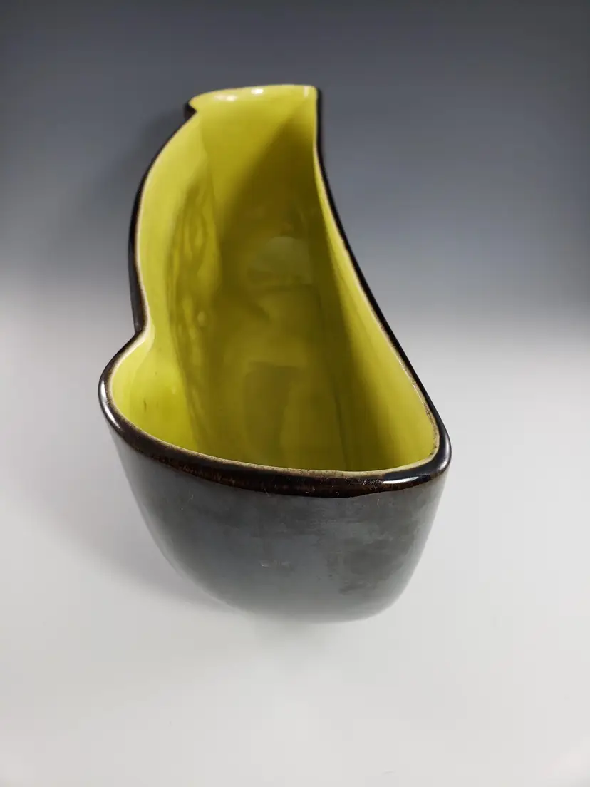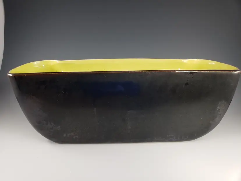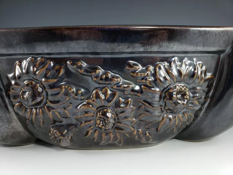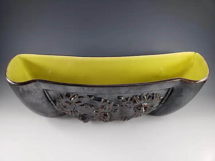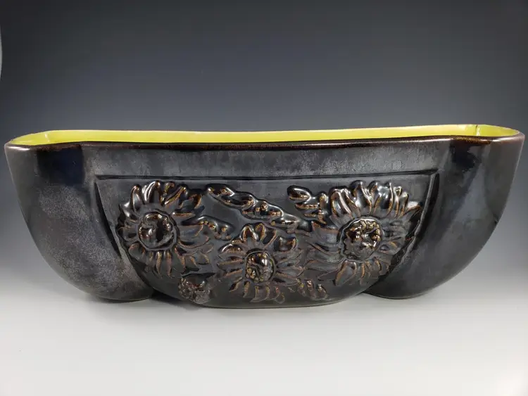Huge Red Wing Pottery planter and a rare find. This long planter features sunflowers on a brown background the color of dark chocolate. The interior is a brilliant yellow-green. The brown glaze appears to have some iridescent flakes in it and the flowers have had the glaze brushed off to make them two tone and add to the rustic look. I have never seen one in the color. The mark is shallow and very difficult to read but I believe the design number is 2018. This would be great for succulents.