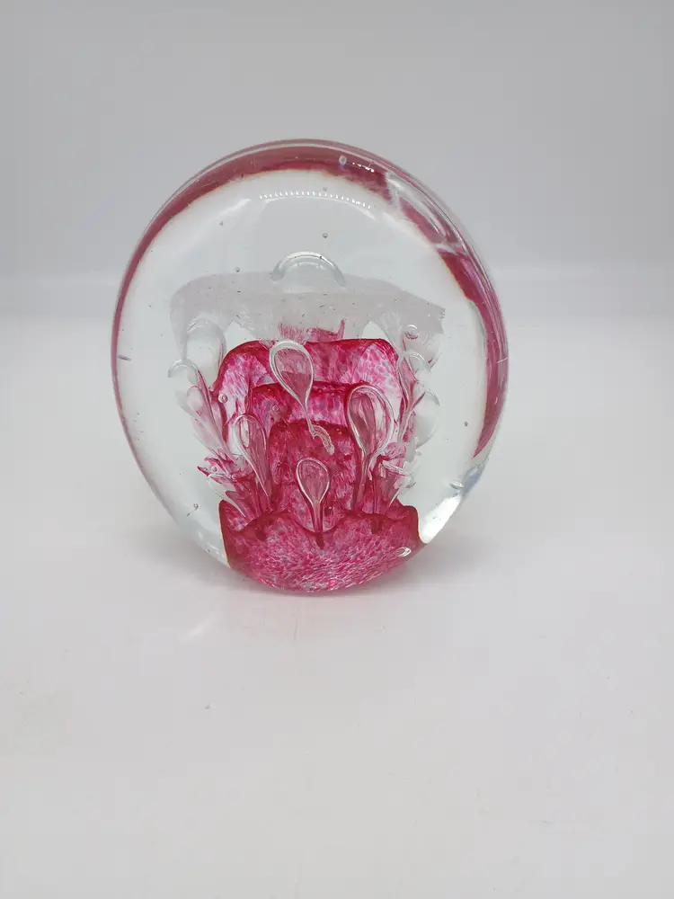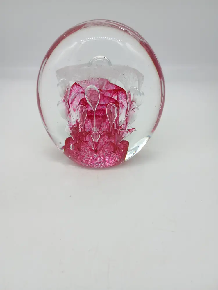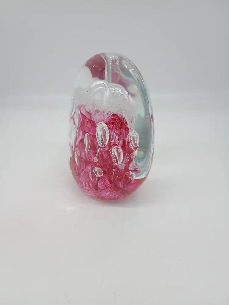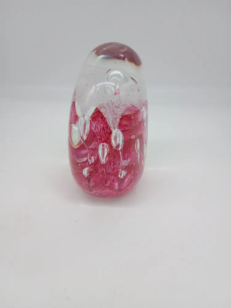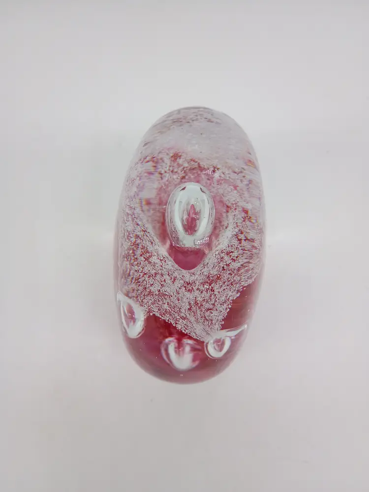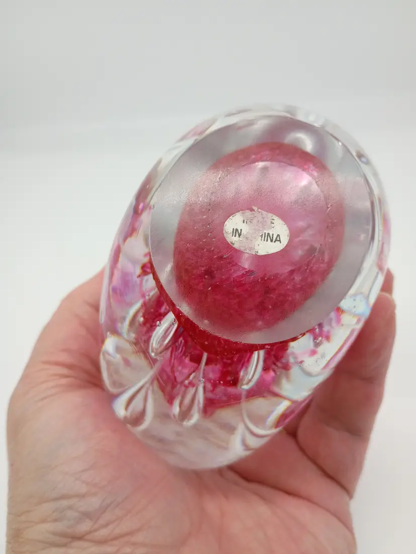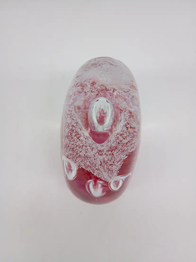 Large 5" Art Glass Paperweight Pink White & Clear Bubbles Abstract Design. Uncommon Oval Shape This is really big it is 5 inches tall 4.5 inches side to ide and 2.5 inches thick. Heavy beautifully worked glass . Good clarity no discoloration. This is preowned, This is an older label color mid 1980's early 1990's. No chips cracks or flea bites . No bruises or fractures. Really quality craftsmanship and symmetrical detail. Excellent condition. The pontil is polished clear and smooth and is precise in shape. Ships USPS domestically and International Shipping globally