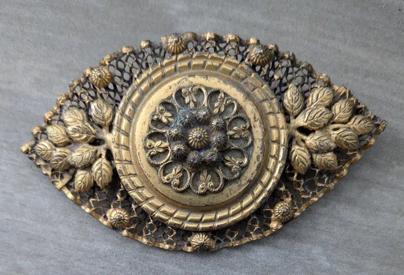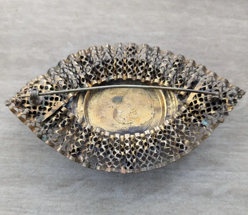 Circa 1930, this brooch is 3-1/2" x 2-1/4". Hinge clasp. Some light verdigris.