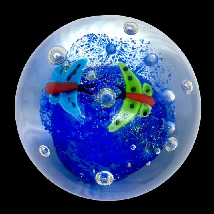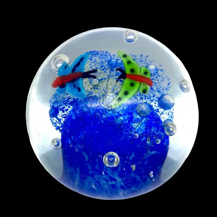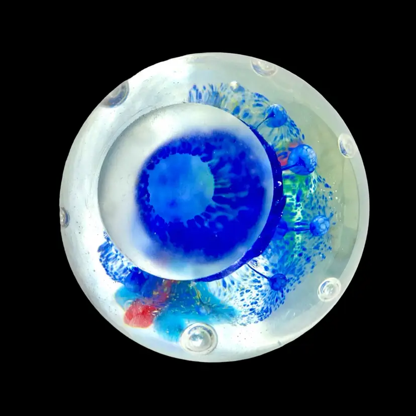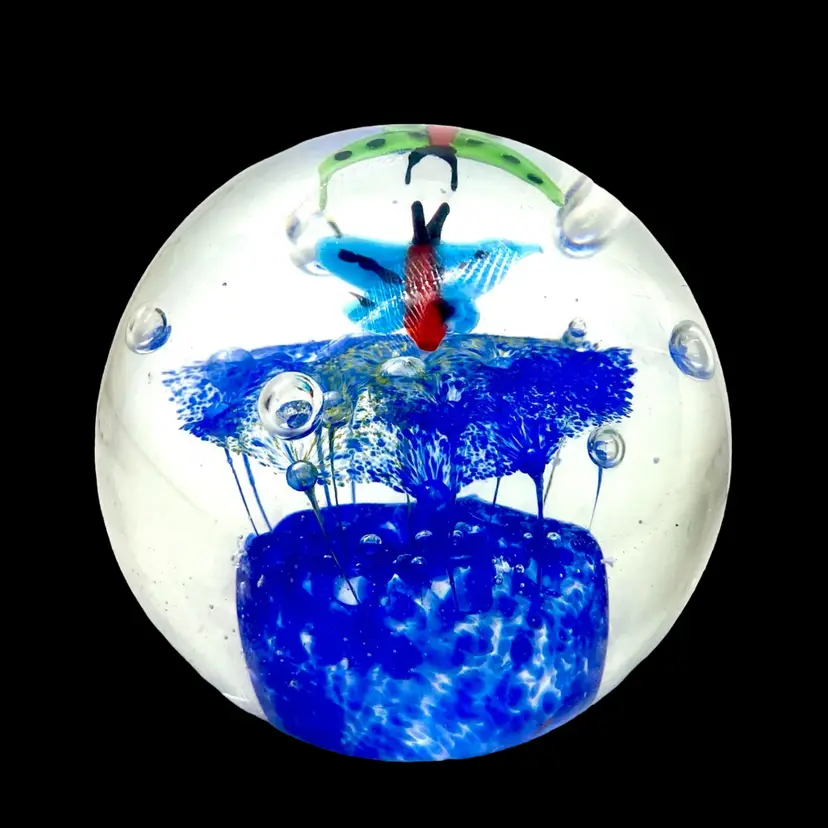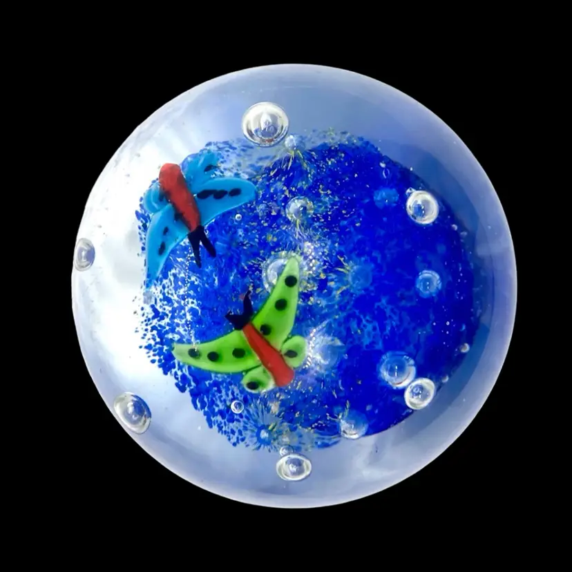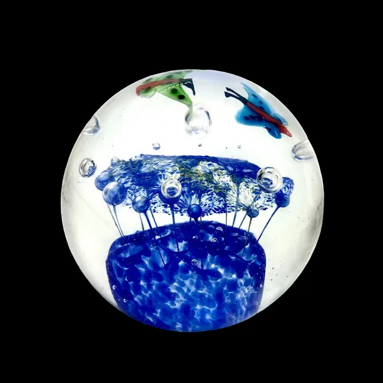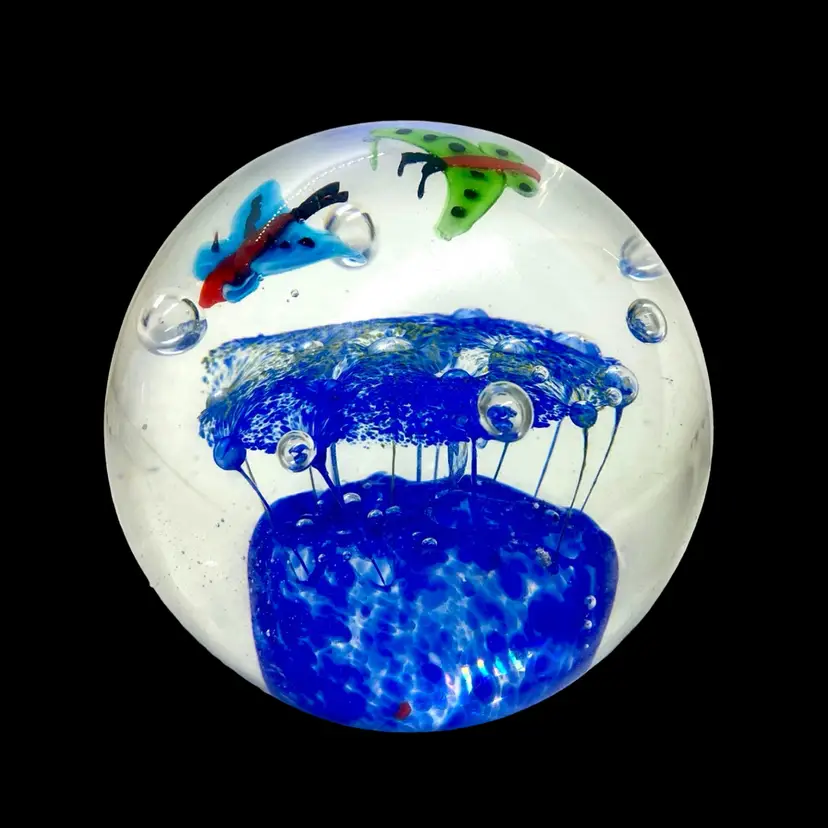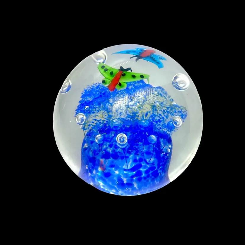This is a pretty paperweight which shows 2 butterflies above a flowered canopy. It measures approximately 3.5” in diameter and is in excellent condition with no cracks, bruises or scratches. The blue is much lighter and more transparent than it appears in the photos. The paperweight is unsigned.