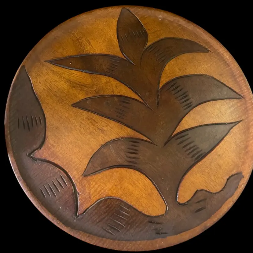 This item appears to be a vintage hand-carved wooden tray or bowl featuring etched depictions of a fish, a pineapple, and foliage. Style: It looks to be a teak or similar hardwood item, often characteristic of Mid-Century Modern or tropical-themed decor. Design: The deep, contrasting etched designs suggest it may be handcrafted.