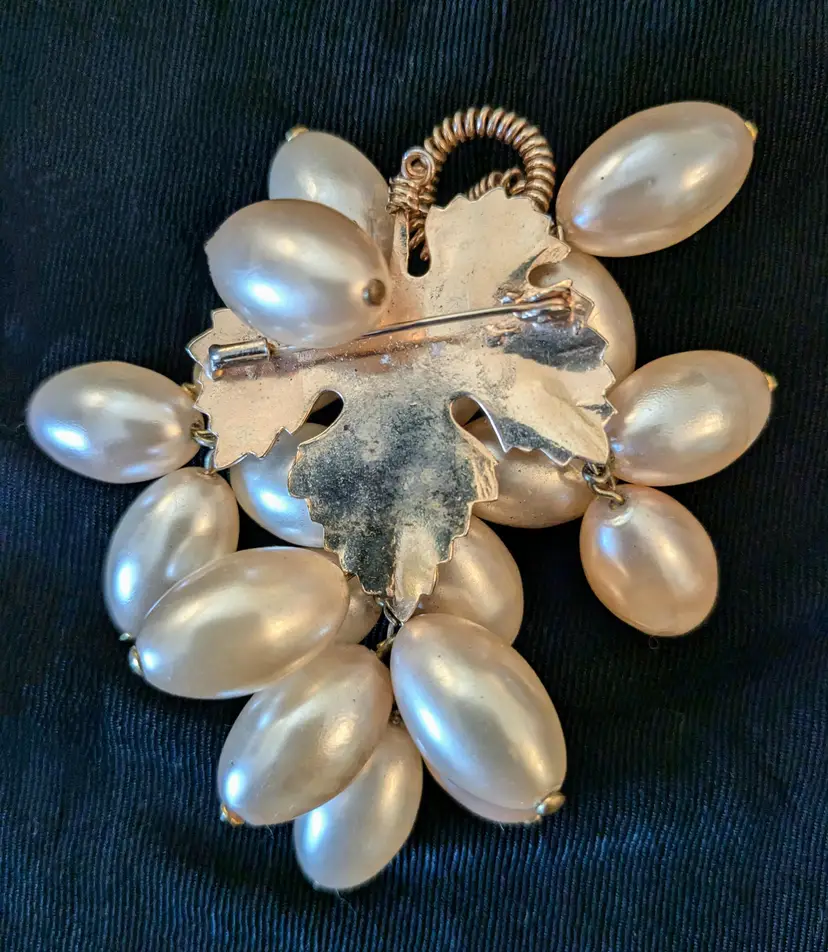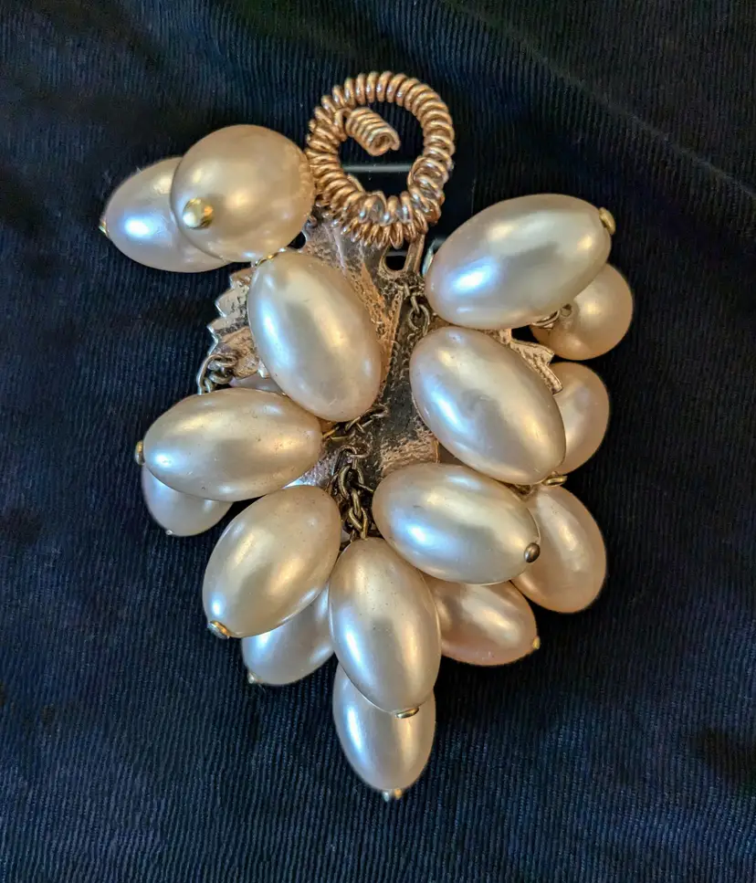 Perfect for the wine lover, a cluster of pearl grapes. Love how the pearls are mounted on a grape leaf setting, also how the stem is a springy coil