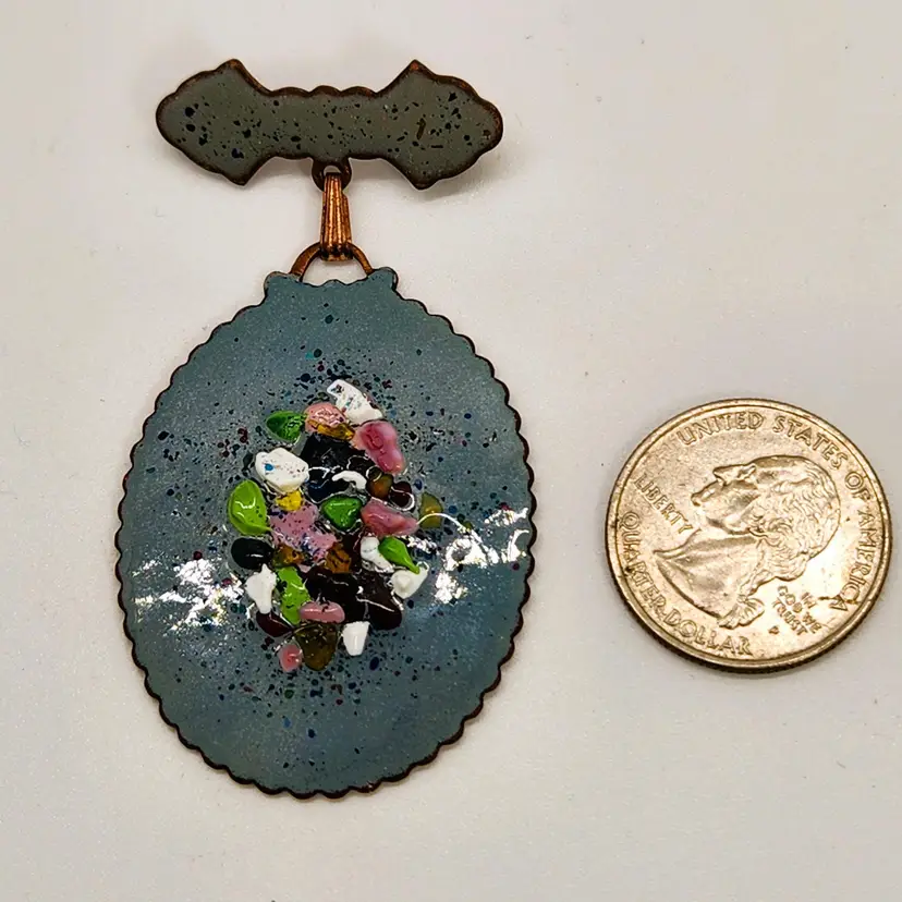 Make a statement with this large modernist enamel on copper brooch / pin. This is a bar & medal shape, 2 attached pieces with brightly colored glass frit on a steel grey background. It has a blue or a green undertone depending on what it is up against. This is a large brooch and could easily be adapted to hang as a pendant. Has a mounted C clasp closure which is sound. Great gift for the MCM or unique jewelry lover. Ships in a new jewelry gift box for gifting or storage.