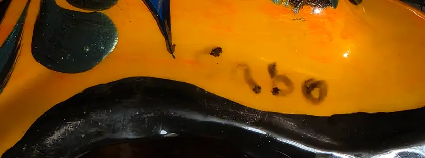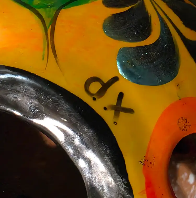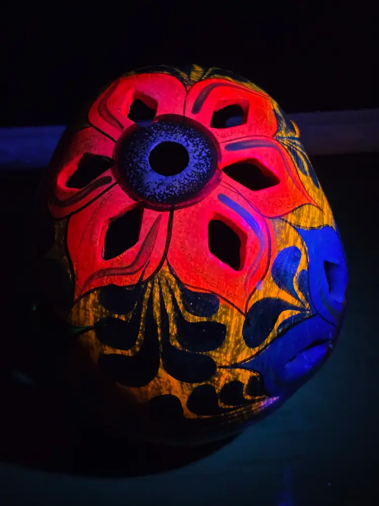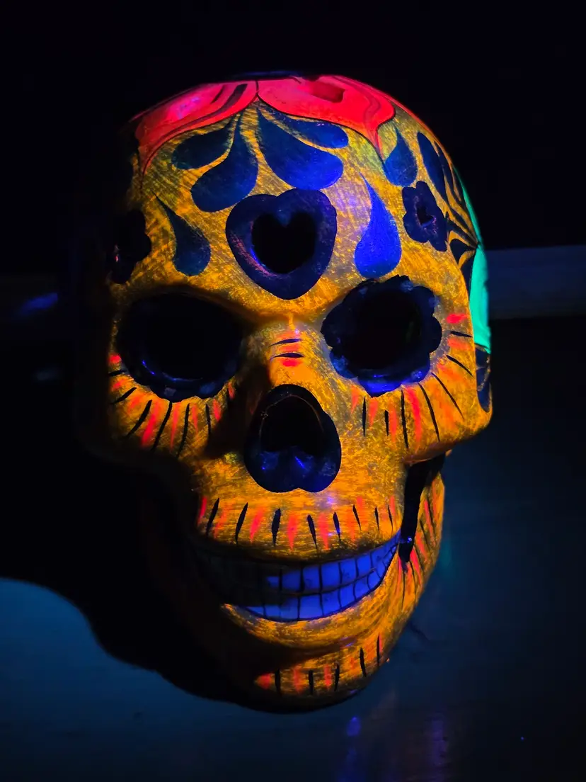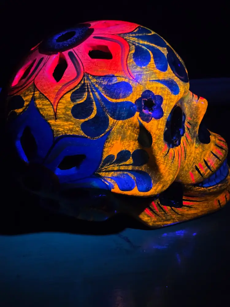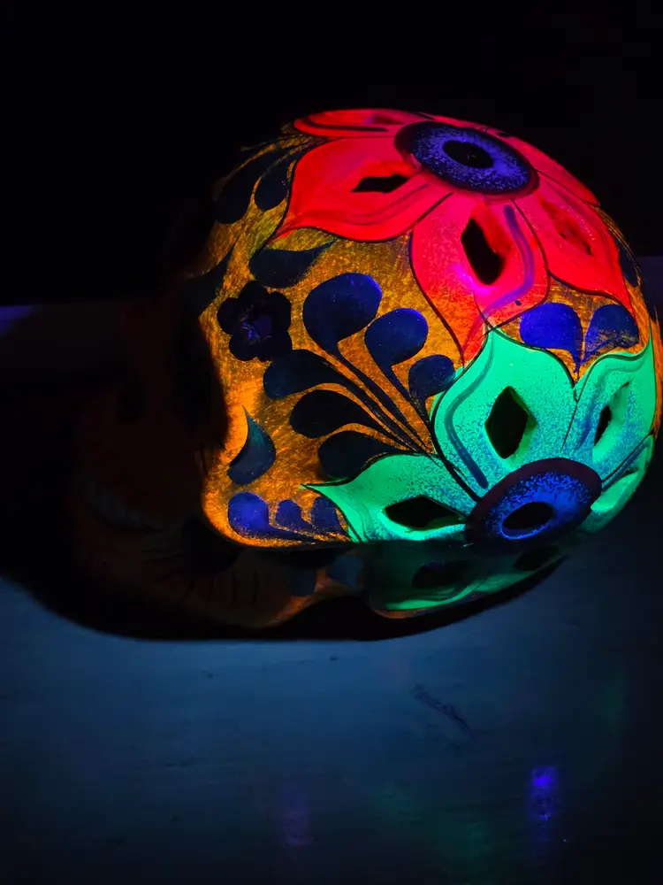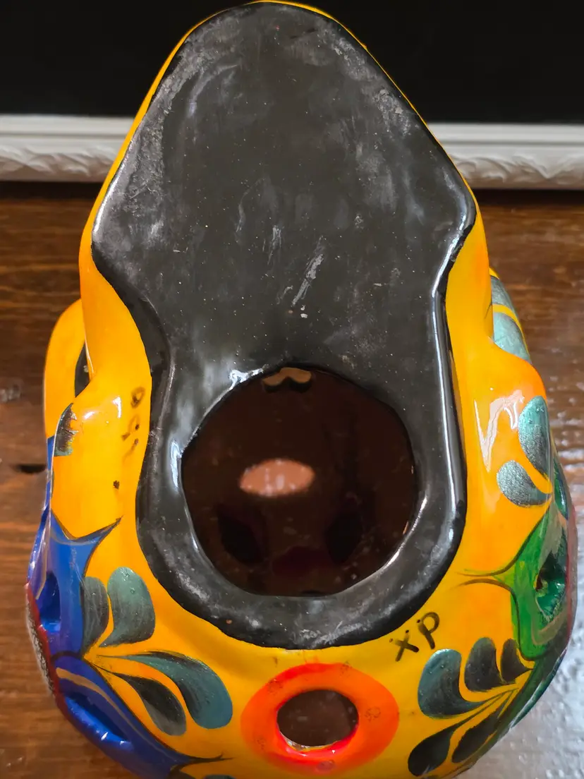 Large Day of the Dead Skull Signed by artist. This piece is in Amazing condition with no chips or cracks or scratches. Skull is orange in color with green, blue and pink floral design with red highlights. Piece has black highlights on eyes along with black and dark orange striped highlights around all facial features. Piece is Large in size which is approximately 6 inches height and 7 inches length from mouth to back of skull and has a 5 inch width. Piece does glow under UV light which makes it a very nice collective piece.