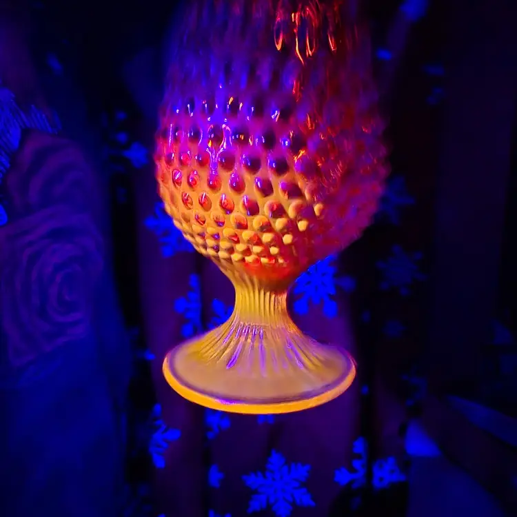 The vase features a teardrop shape with a ribbed pedestal design and a high gloss finish that glows in the dark.