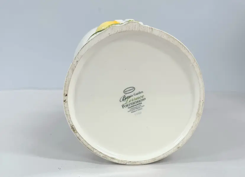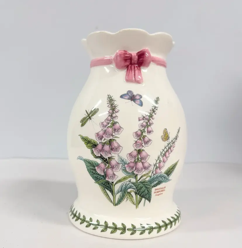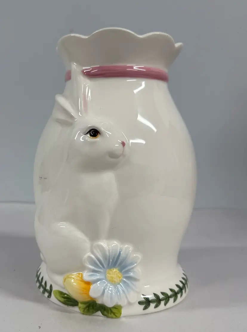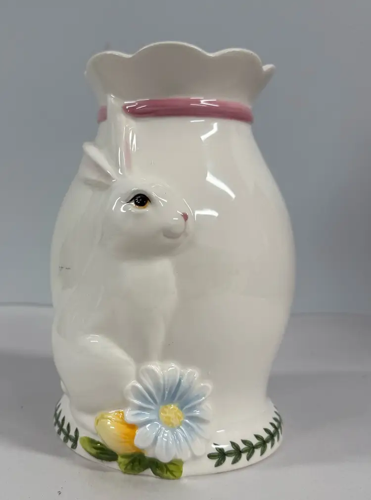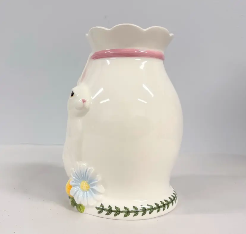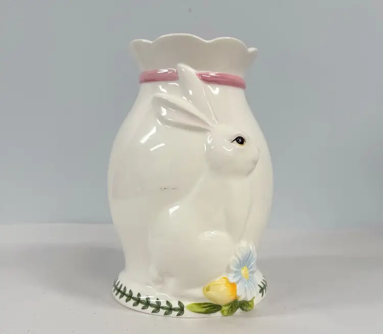 The Large Figural Bunny Vase from Portmeirion's Botanic Garden collection is a charming piece of English ceramic art pottery standing at 8" tall. The multicolor botanical design featuring a rabbit theme adds a touch of whimsy to any home decor, making it a perfect addition for those who appreciate detailed and unique pottery pieces from the 1990s. Made in the United Kingdom, this vase showcases the quality craftsmanship and artistic style that Portmeirion is known for, making it a delightful statement piece for any spring-themed display.