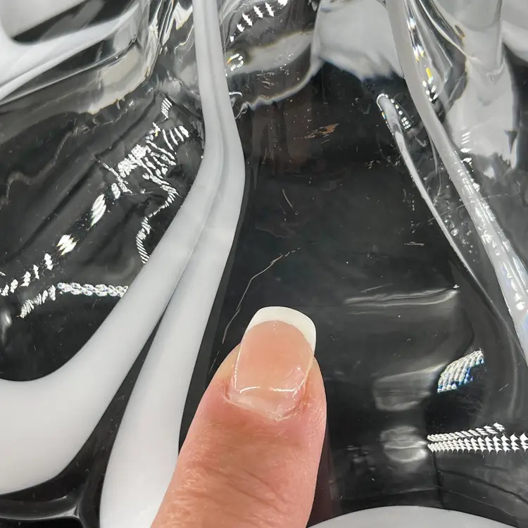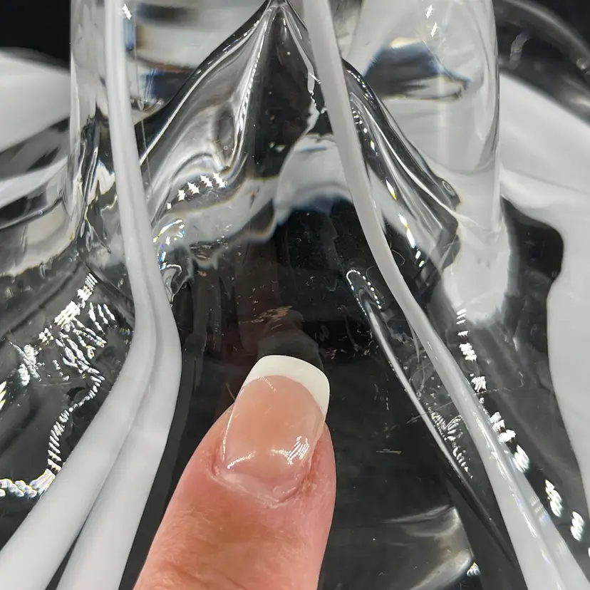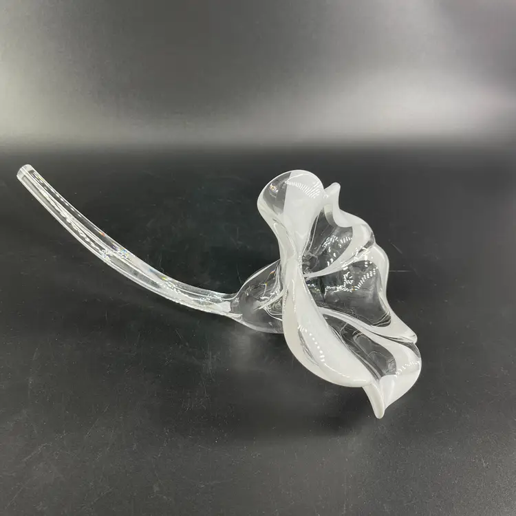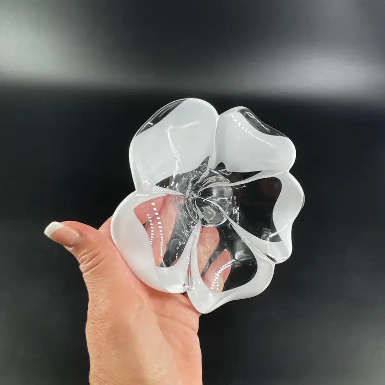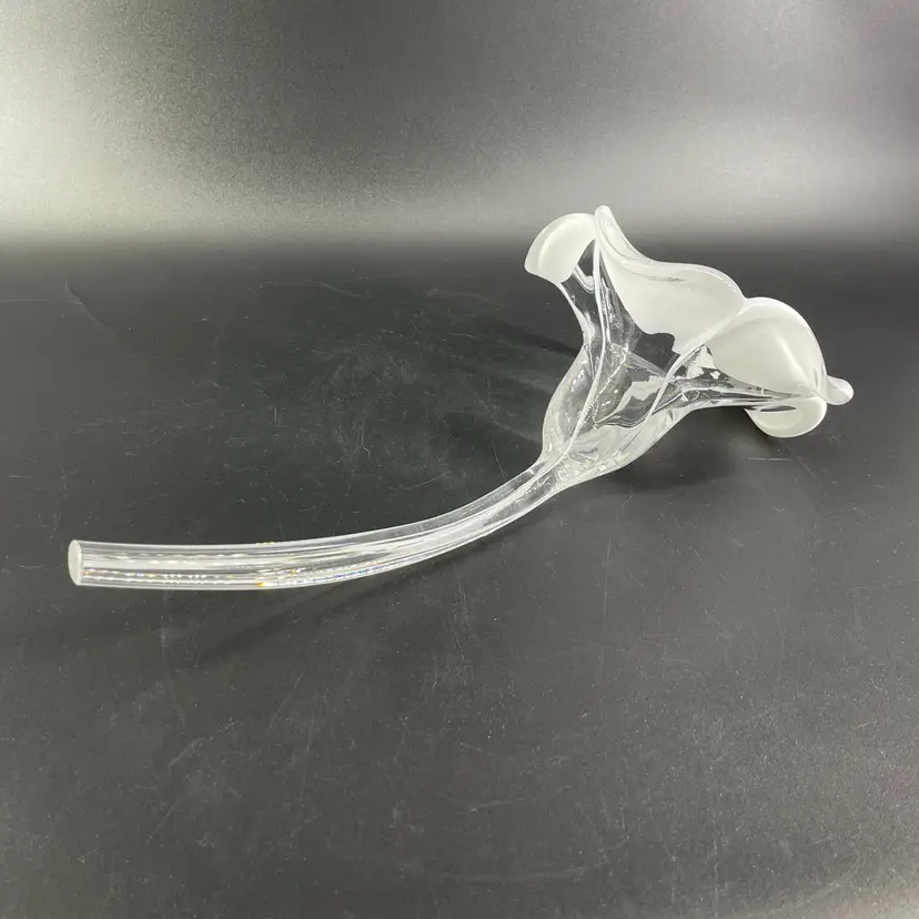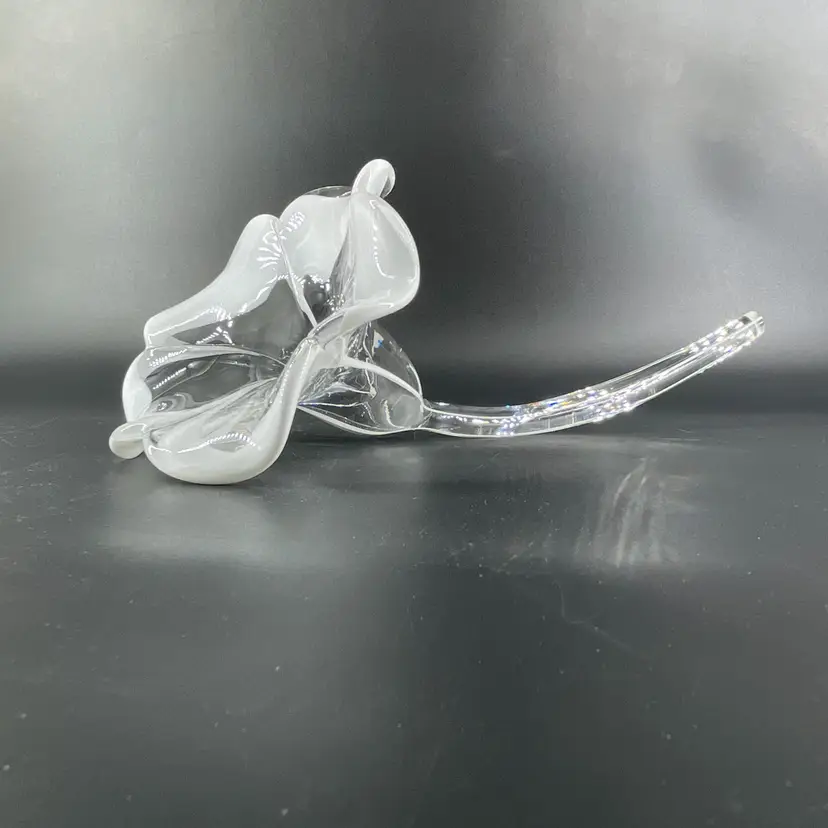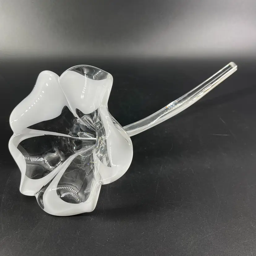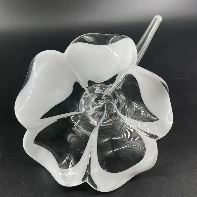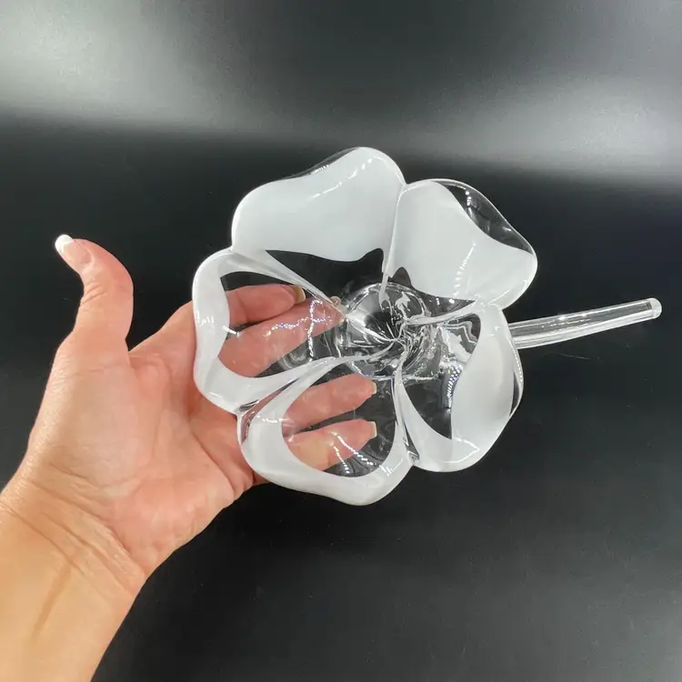 This stunning blown art glass long stemmed flower is 13.5" long (petal to tip) 6.5" in diameter at its widest (petal tip to petal tip) and weighs almost 2lbs. It is in great condition. There are no cracks, breaks, chips or repairs. There are a few superficial scratch marks. (See photos).