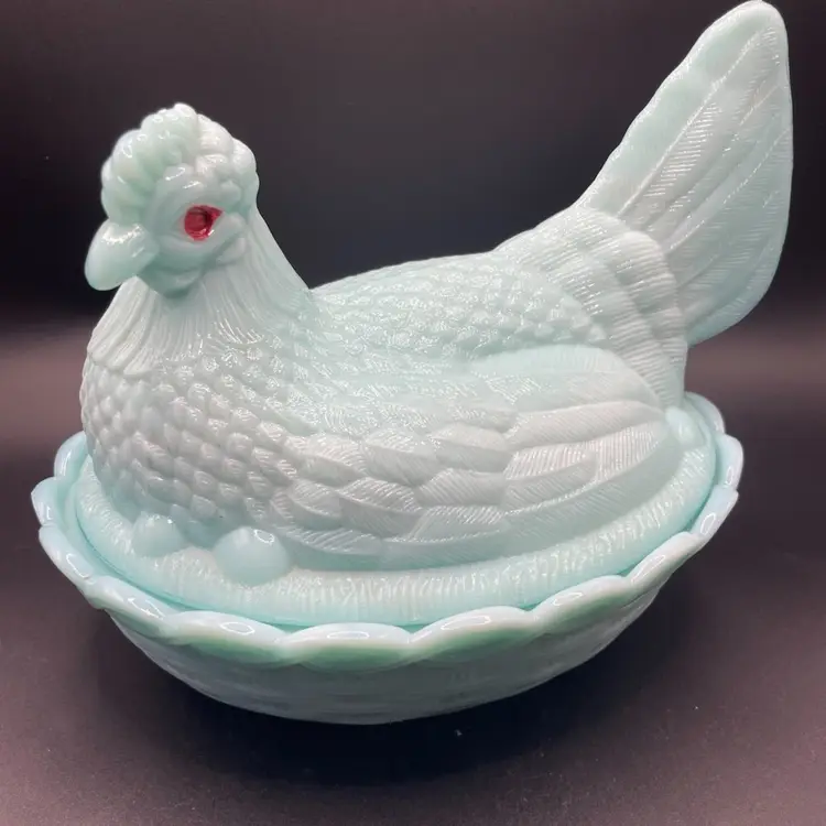 Possibly Jadeite as the color is a mint green milk glass. No markings. No cracks or chips. Heavy at almost 3lbs. Approximately 9” long and 6” wide