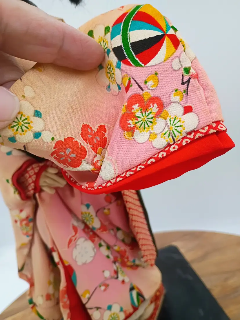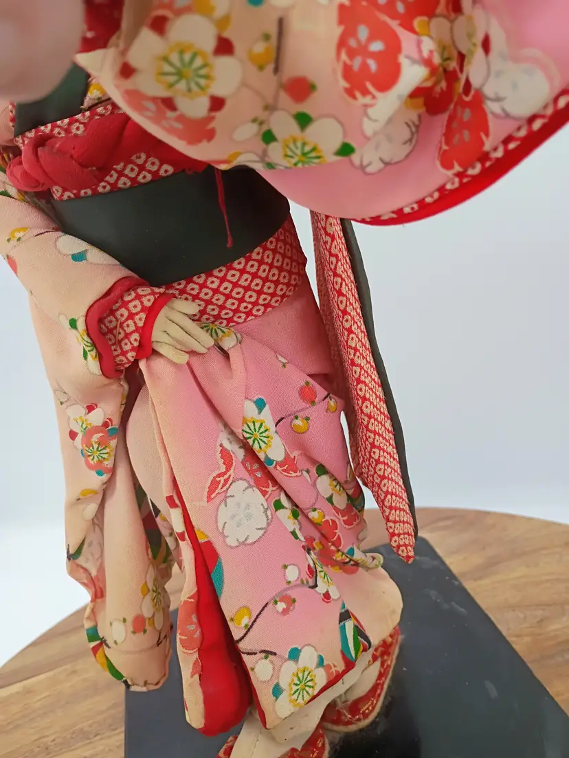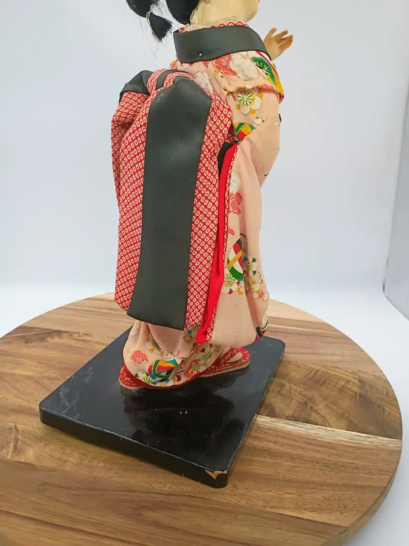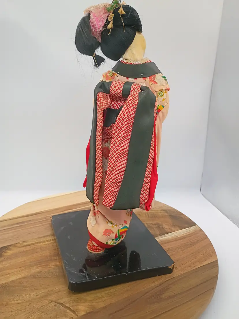 Large Japanese Geisha Standing Doll on Base Hand Painted Face Hand Sewn Kimono . Her Kimono features hot air balloon pattern on outermost layer. Very detailed and intricate. Pure Silk. She is 14" Tall . Her base is 7 inches side to side and 6 inches front to back.This is preowned. Part of my personal collection. No rips or tears no odors . There is slight age spotting on face this is from the glue used to secure the material to the underlayer of the head, its more noticible allong hair line. Hair style intact very slight flyaways. Dress is intact but there is significant age fading to the silk used in the kimono see last few photos for difference. Overall the fading is uniform .The Shoes are both present and intact. The lacquared base is intact and doll is securely attached. There is some minor wear especially on bottom edge. This doll is at least 40 yrs old. VG condition.. Ships USPS