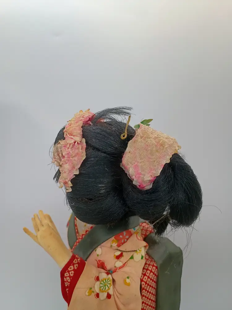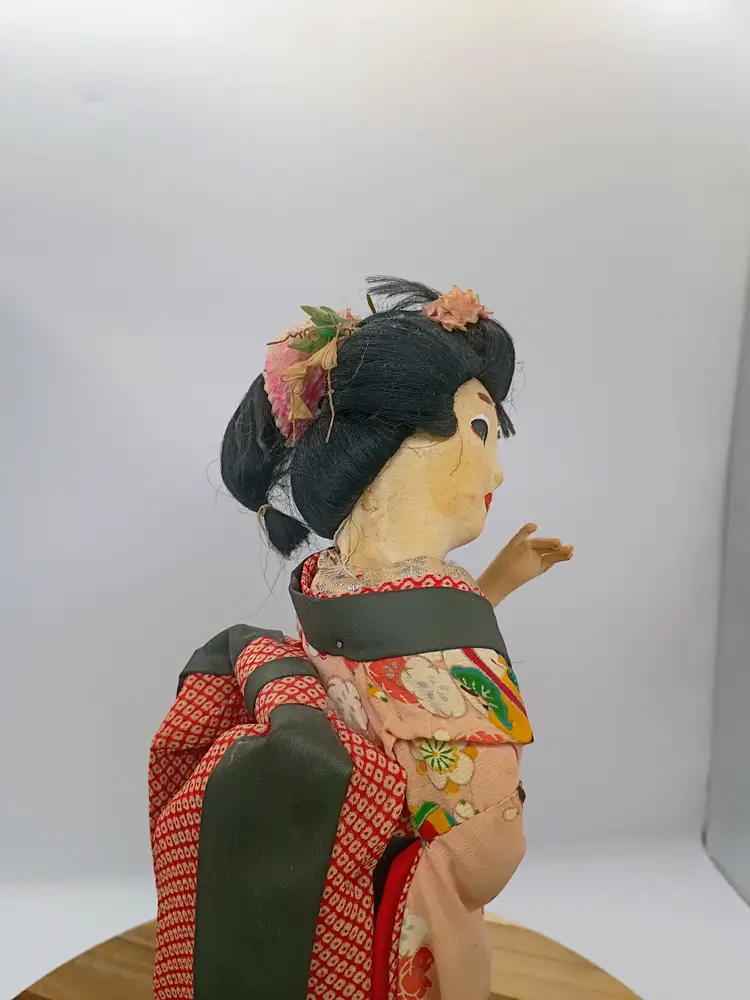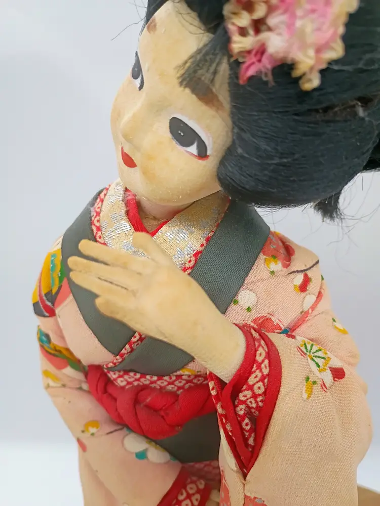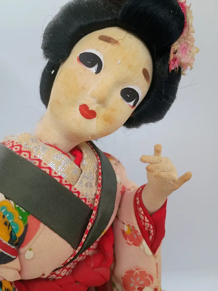 Large Japanese Geisha Standing Doll on Base Hand Painted Face Hand Sewn Kimono . Her Kimono features hot air balloon pattern on outermost layer. Very detailed and intricate. Pure Silk. She is 14" Tall . Her base is 7 inches side to side and 6 inches front to back.This is preowned. Part of my personal collection. No rips or tears no odors . There is slight age spotting on face this is from the glue used to secure the material to the underlayer of the head, its more noticible allong hair line. Hair style intact very slight flyaways. Dress is intact but there is significant age fading to the silk used in the kimono see last few photos for difference. Overall the fading is uniform .The Shoes are both present and intact. The lacquared base is intact and doll is securely attached. There is some minor wear especially on bottom edge. This doll is at least 40 yrs old. VG condition.. Ships USPS