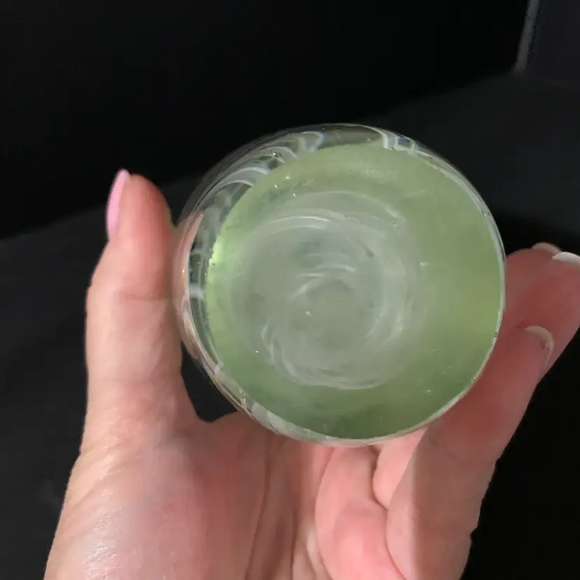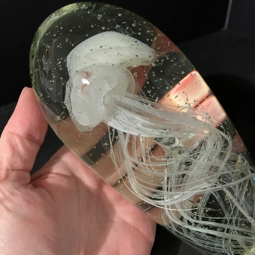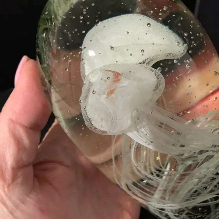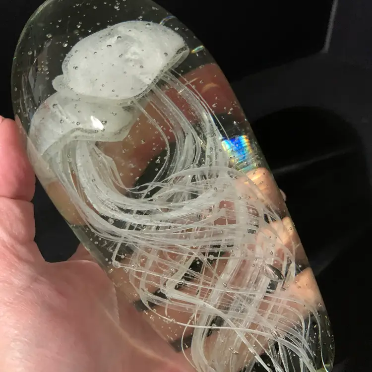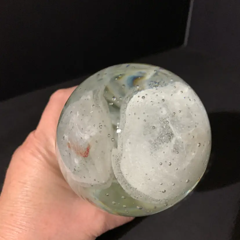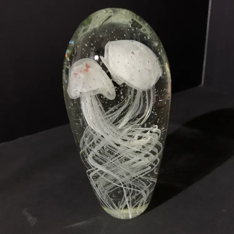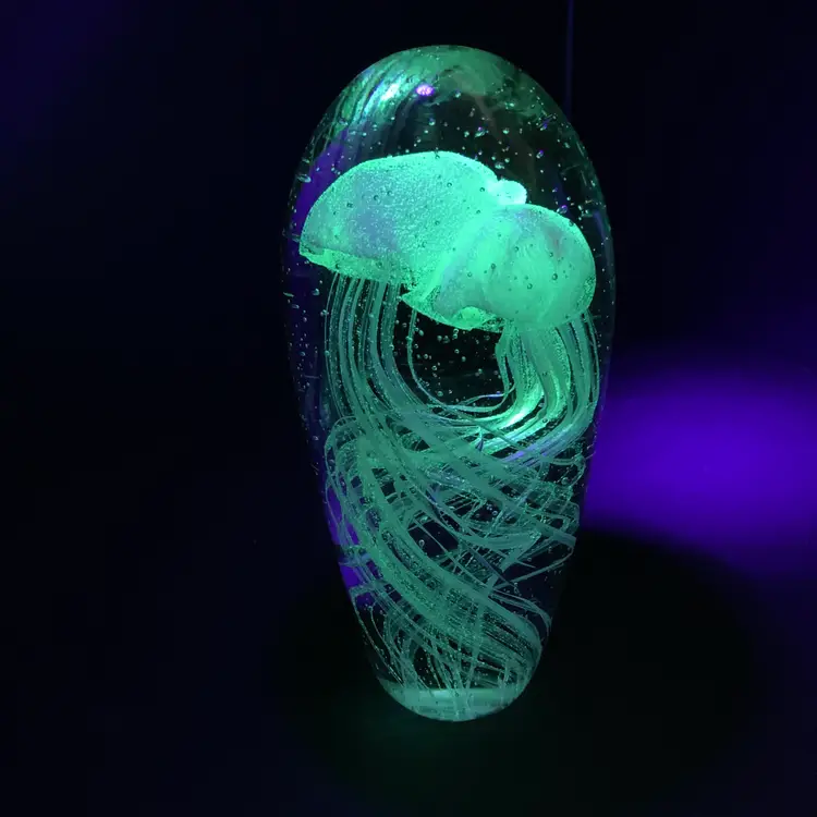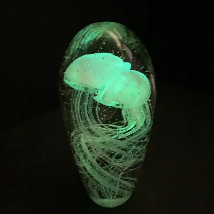 Not only does this glow, it glows in the dark! The last two photos show the paperweight under UV light and shows what it looks like in the dark. No chips or cracks. Measures 3 inches wide and 7 inches tall. Weighs 58 ounces. If the actual postage ends up being less than what you paid, you will be refunded for anything over one dollar.