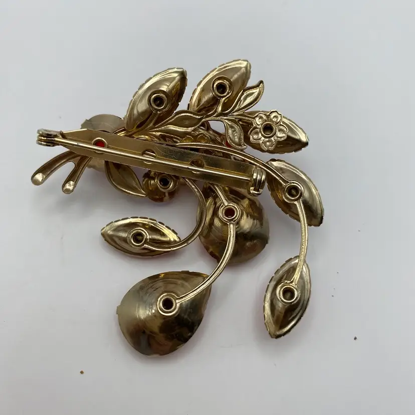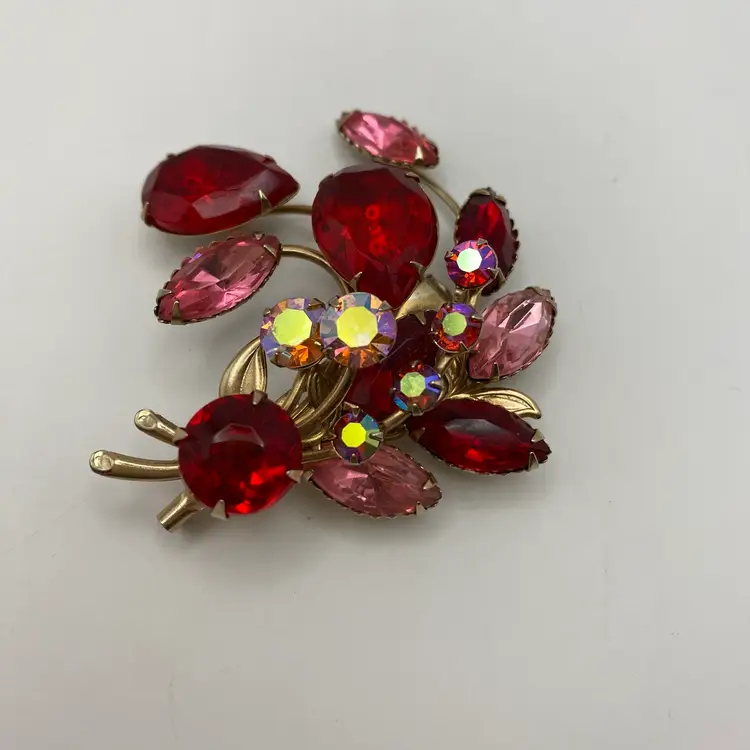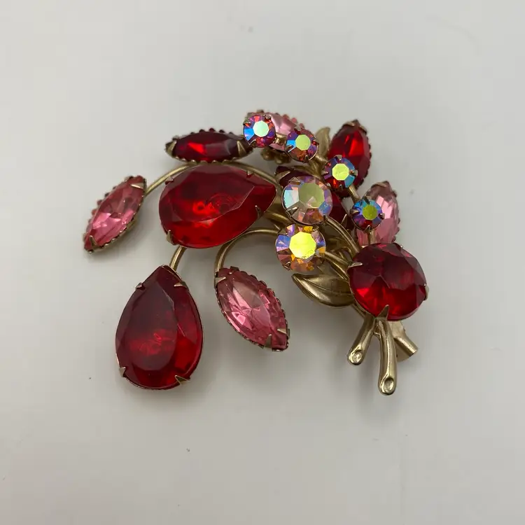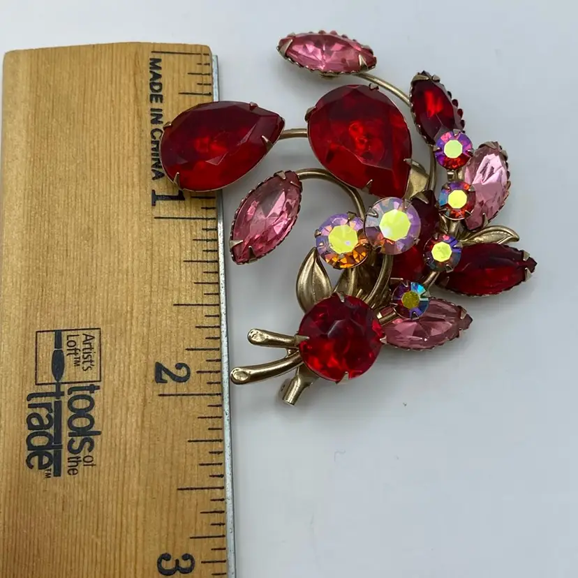 Large Jewels Pin BroochFlower Burst Spray Red rhinestones and Aurora Borealis Rhinestones