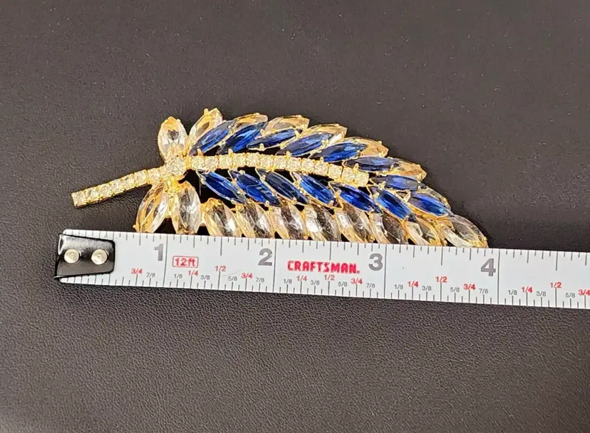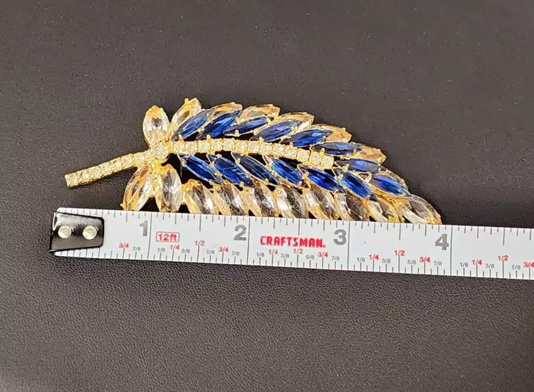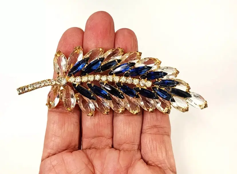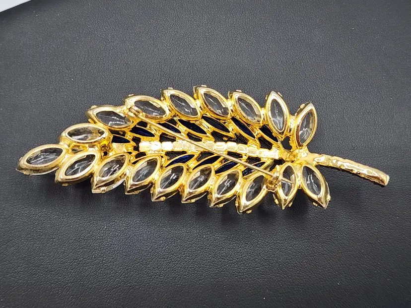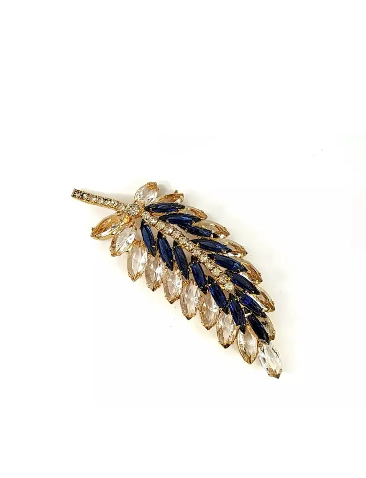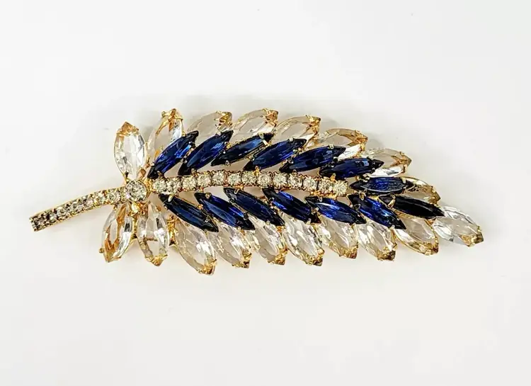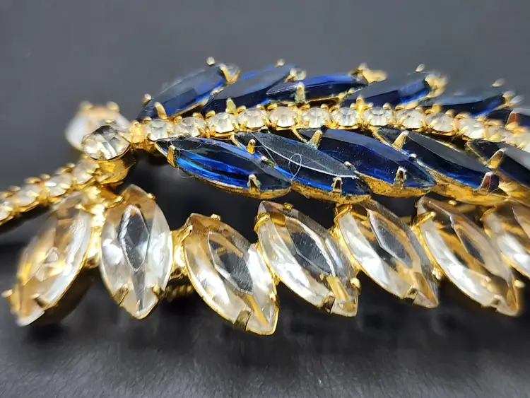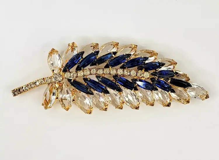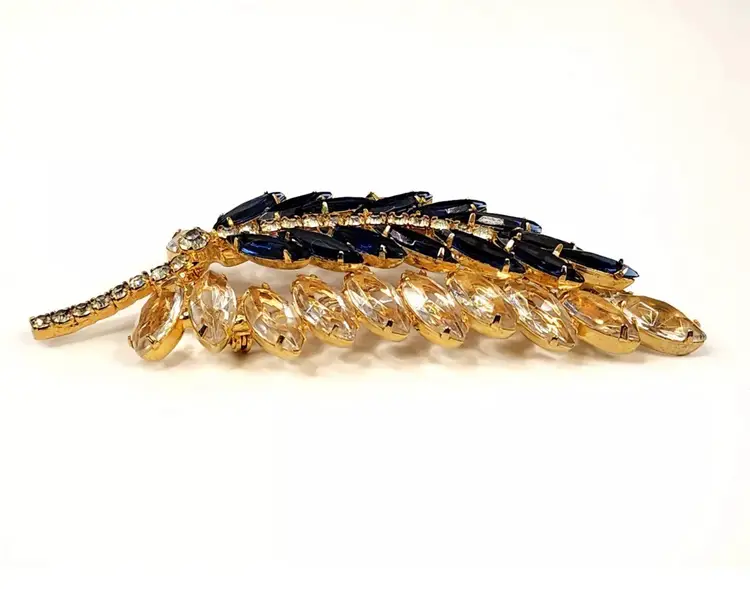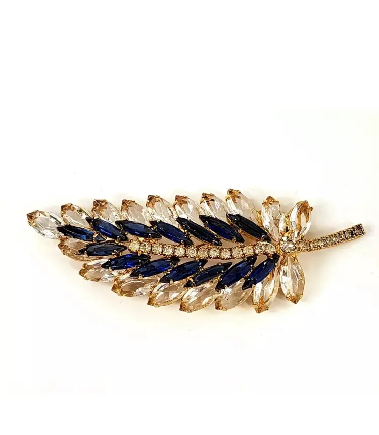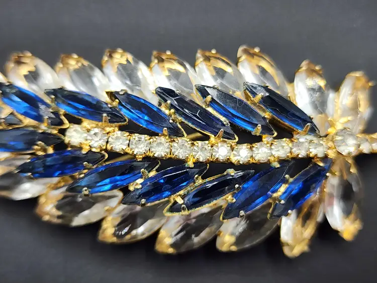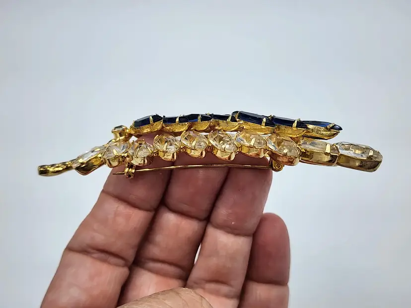 Juliana brooch with clear and navy nkue navettes, gold tone, 4" long. Confirmed on Juliana website, model #3269. Condition: very good.