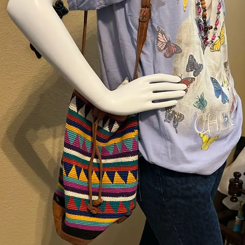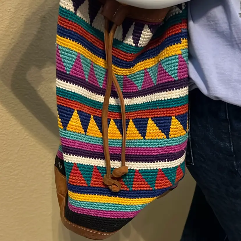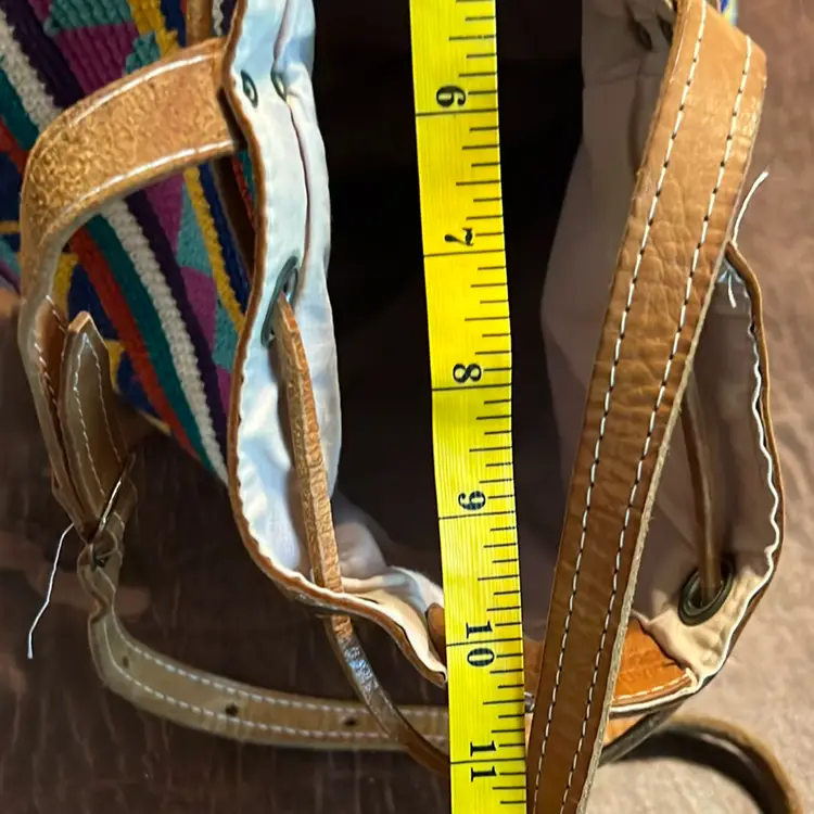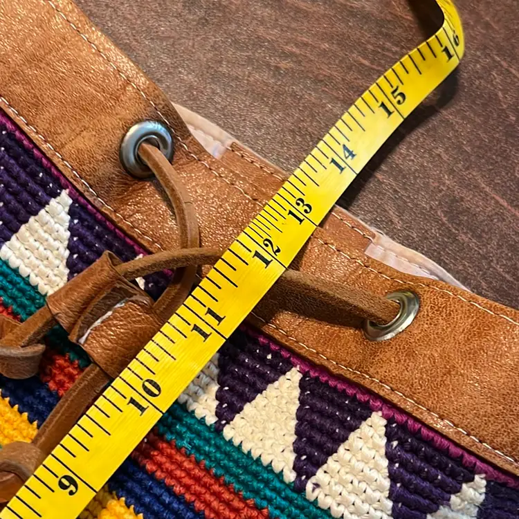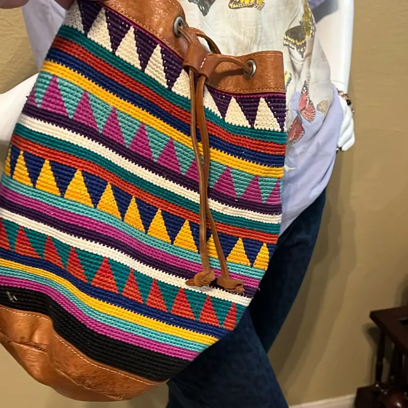 Large, leather and cotton woven vintage bag from the 90s in good condition. Some water staining on the bottom leather of the bag. Otherwise in great condition with no rips or tears in the woven material. Great vibrant colors cinches at the top with a 10 inch opening.
