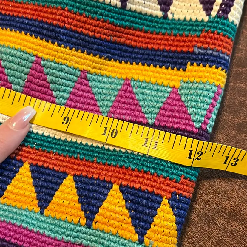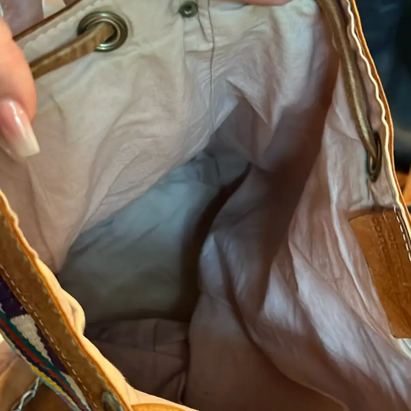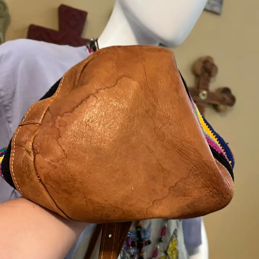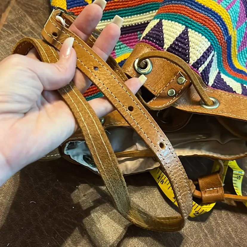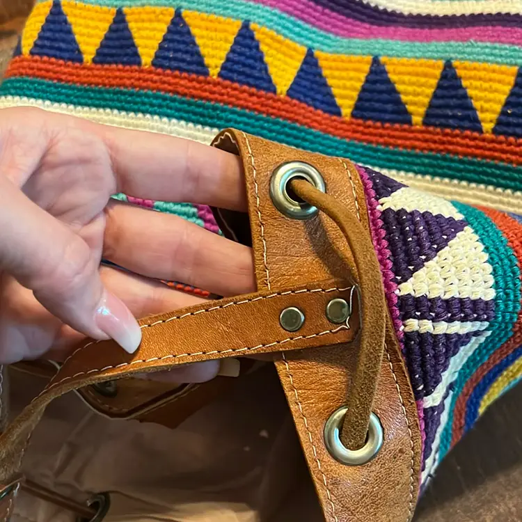 Large, leather and cotton woven vintage bag from the 90s in good condition. Some water staining on the bottom leather of the bag. Otherwise in great condition with no rips or tears in the woven material. Great vibrant colors cinches at the top with a 10 inch opening.
