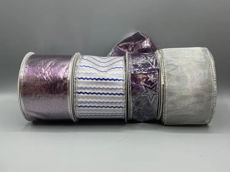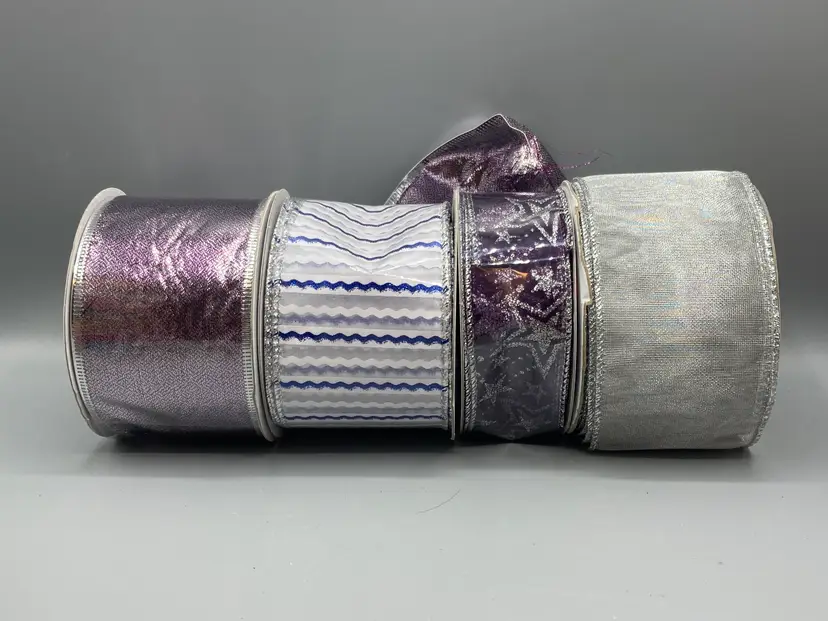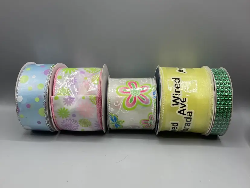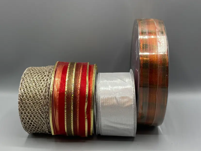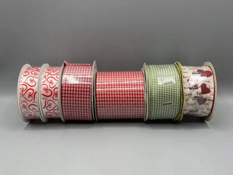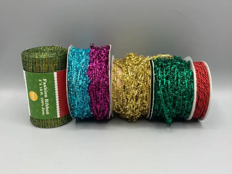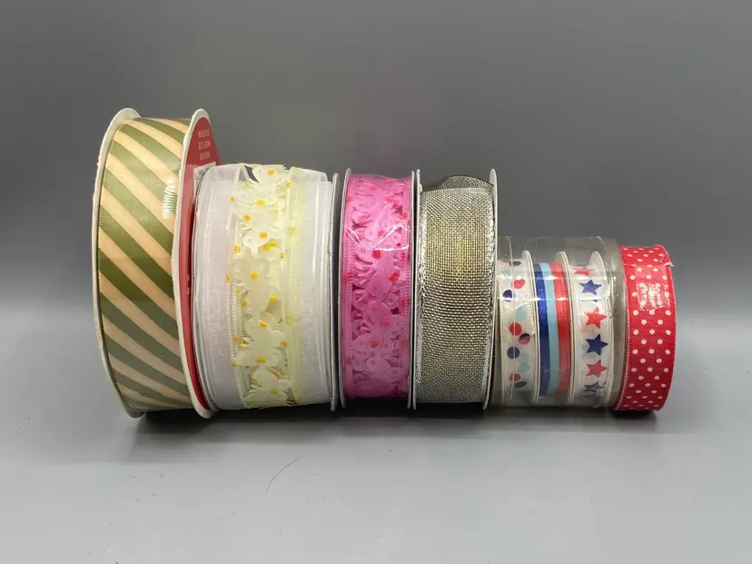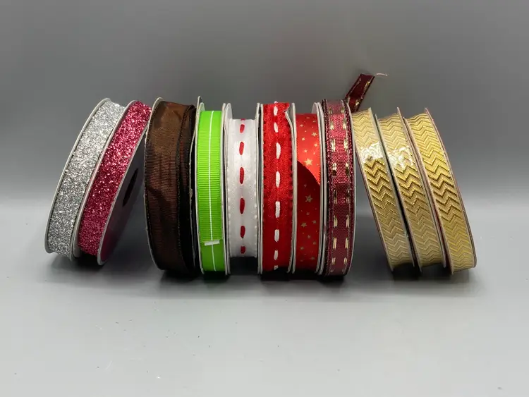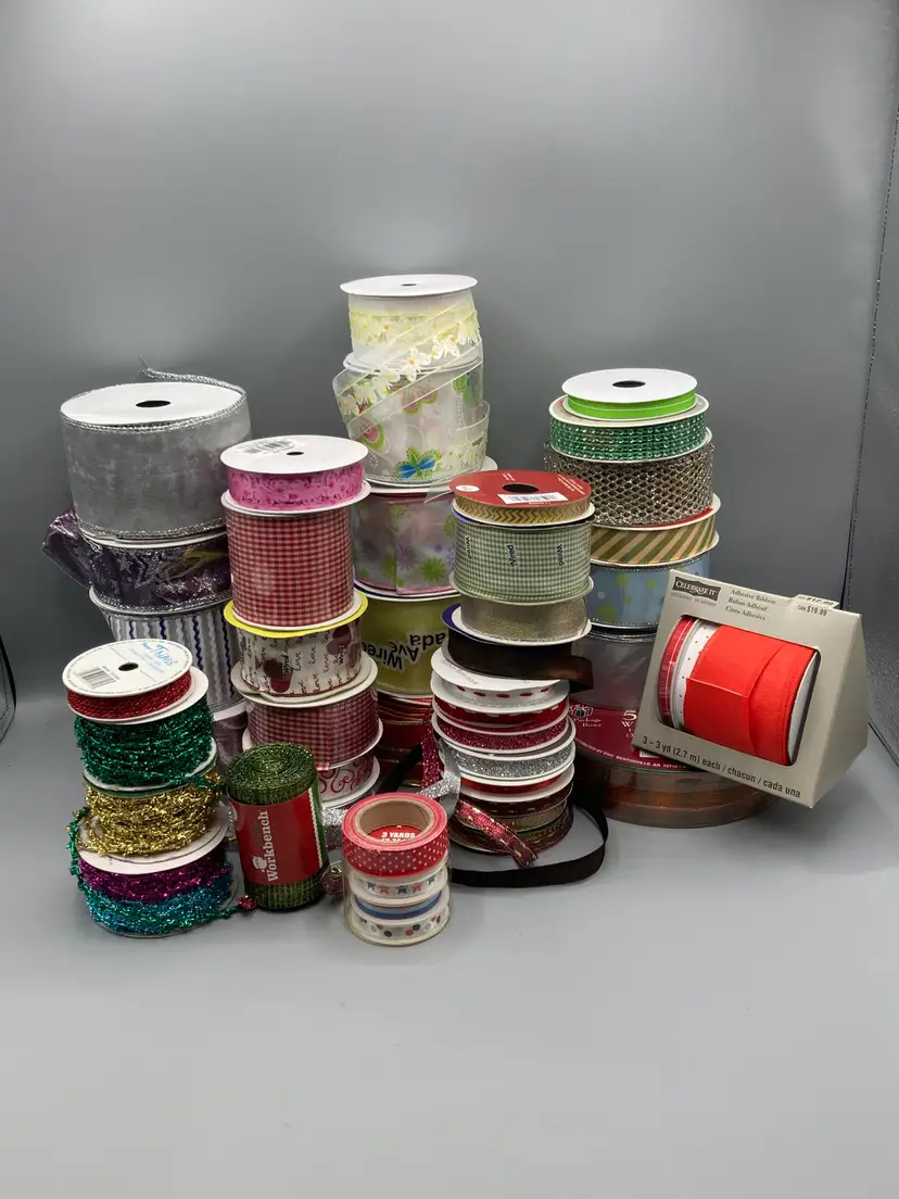 This lot contains 42 rolls of new and partially used rolls of wired and unwired ribbon.