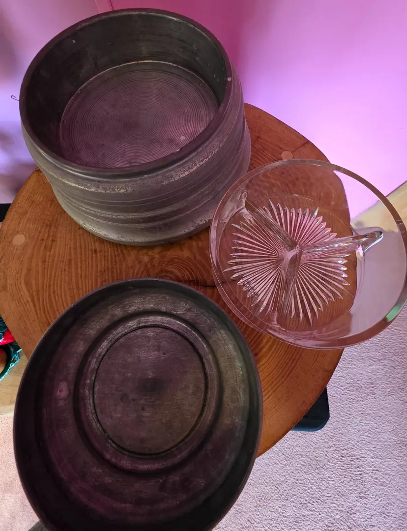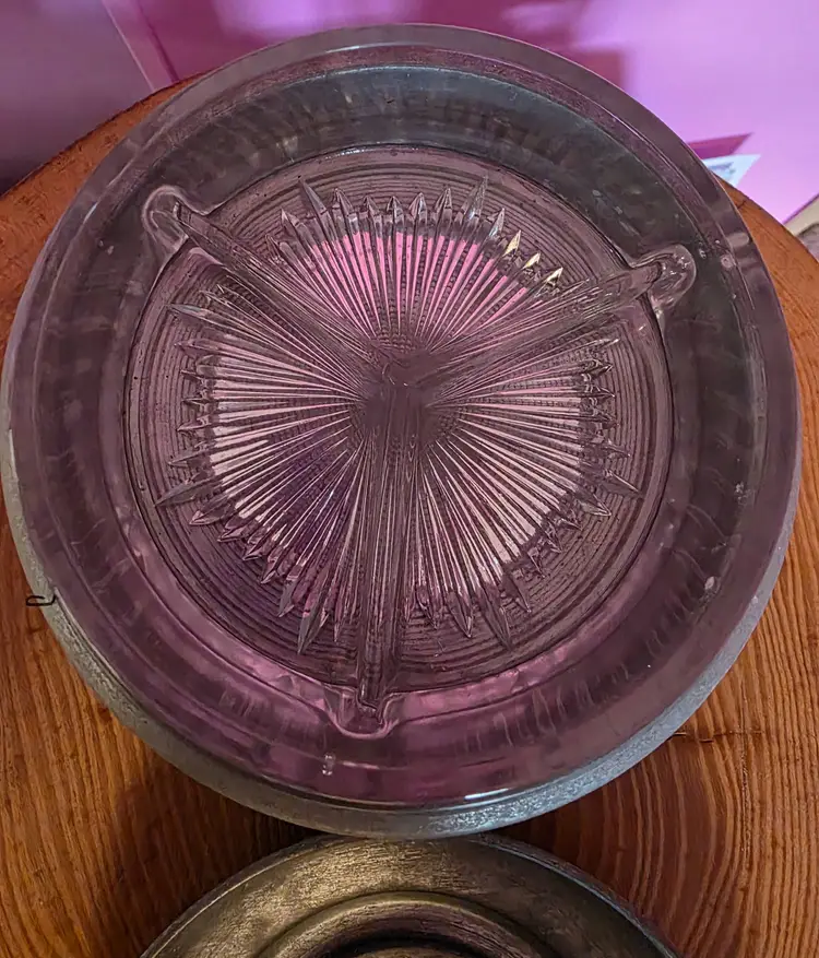 Large Metal Trinket/Jewlry Holder With Flower Pattern. I believe it was a music box that no longer works, however base does still spin. Has a removable glass insert divided into 3 separate sections. Lid is about 6" wide 7" wide at the base and 4" Tall.