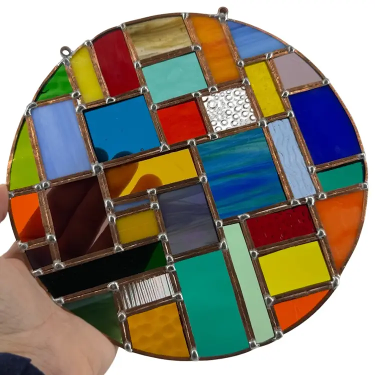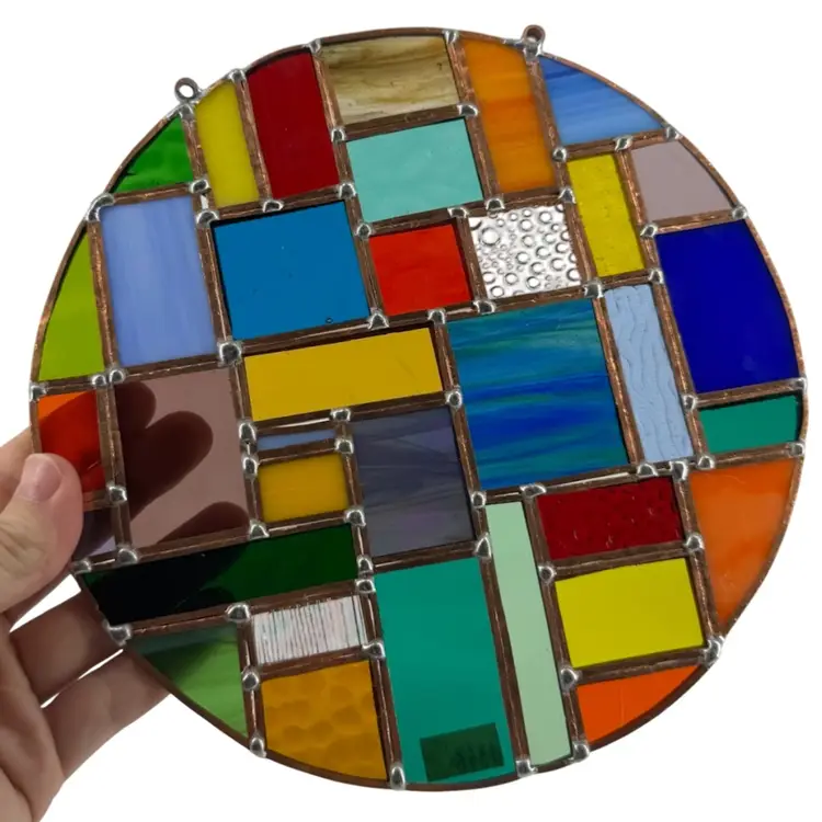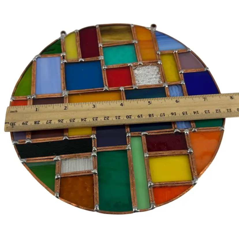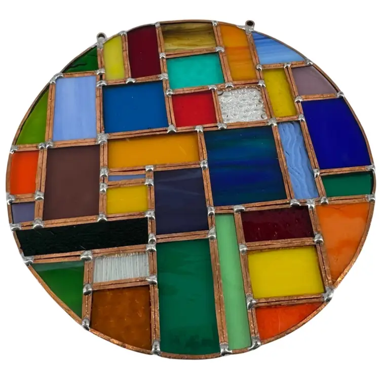 Wall hanging featuring a mosaic design of different colored square/rectangle art glass pieces, finished with copper edges and soldered together by metal. Includes two soldered rings at top to hang on a wall. No chips, cracks, breaks. No signatures. Art piece measures approximately 7.5” x 7.5”.