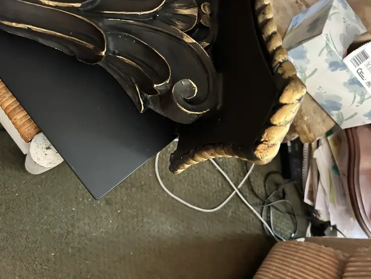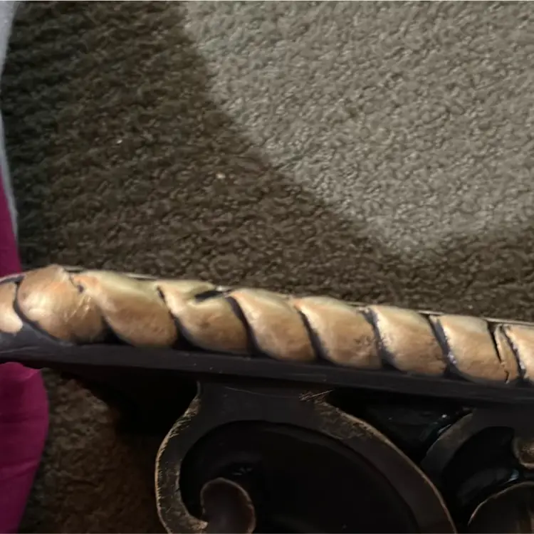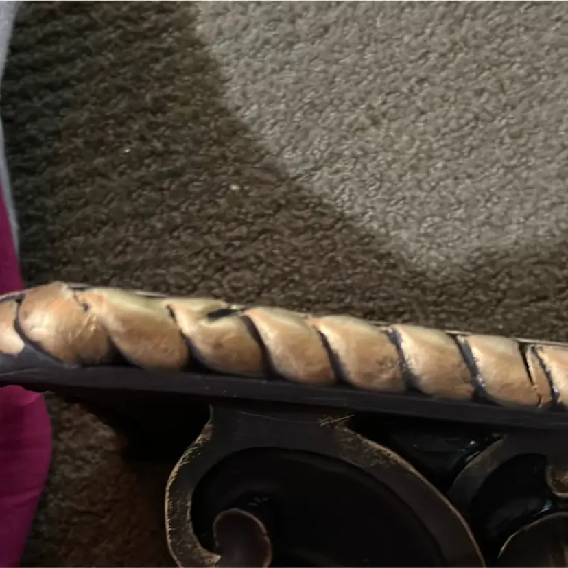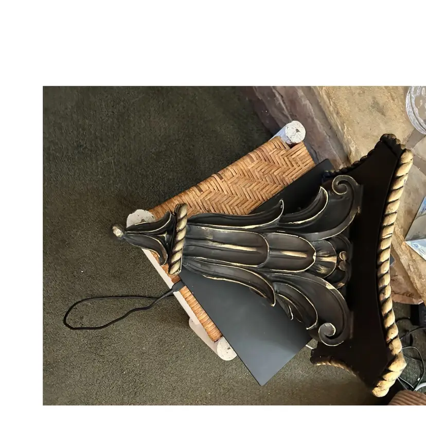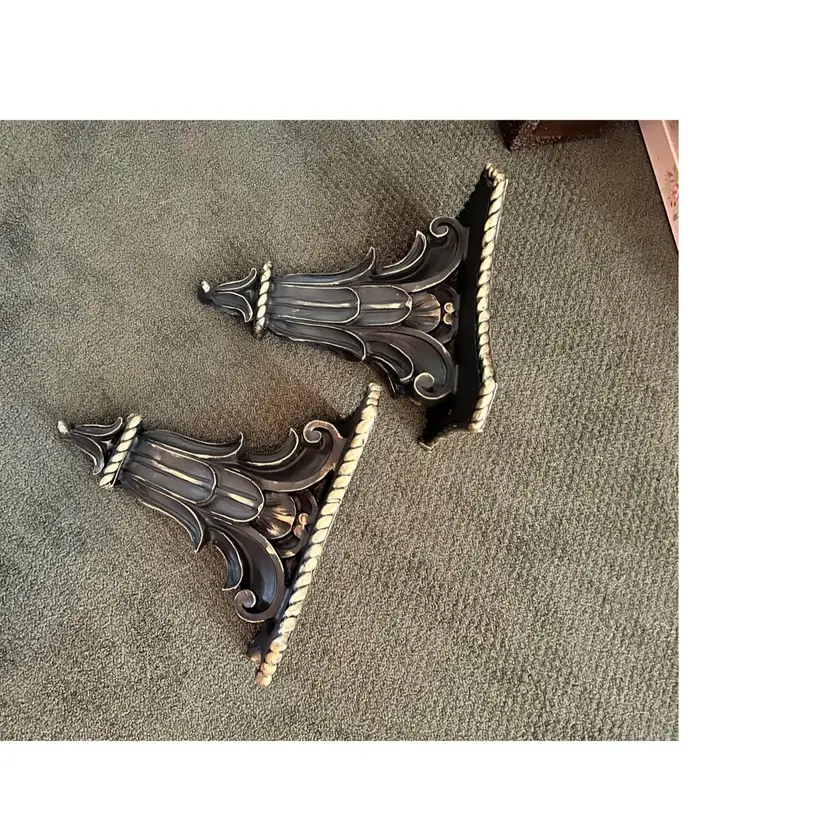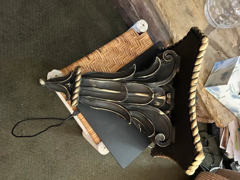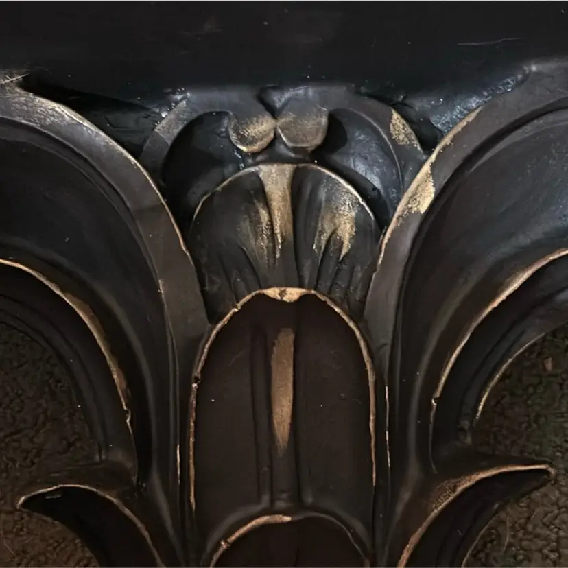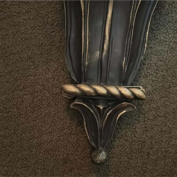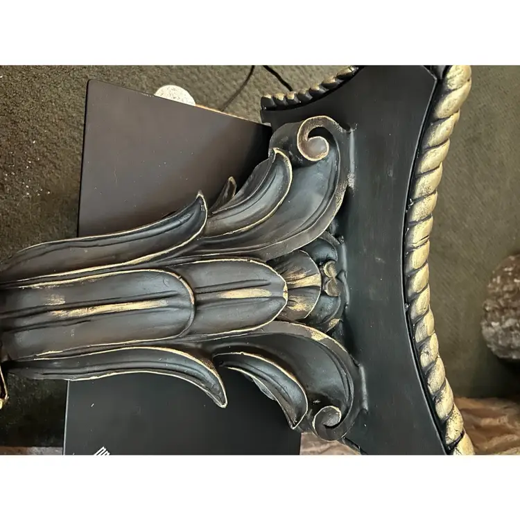14x13x5". Hand painted matte finish black with gilded gold wax. Shelf on top is 12". Handmade rope molding at top and bottom. Some imperfections of clay, pictures show. Made of resin. Can sell separately. $28 each. Or both for $52