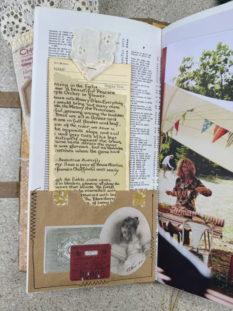 This journal has 2 signatures and the journal dimensions are: 6"x11.5". This Aldi grocery bag turned into one of the most fun projects I've worked on to date! The 2 signatures have a total of 68 writing surfaces. The journal has tall tags and tucks with Tim Holtz and Edith Holden ephemera pieces included.