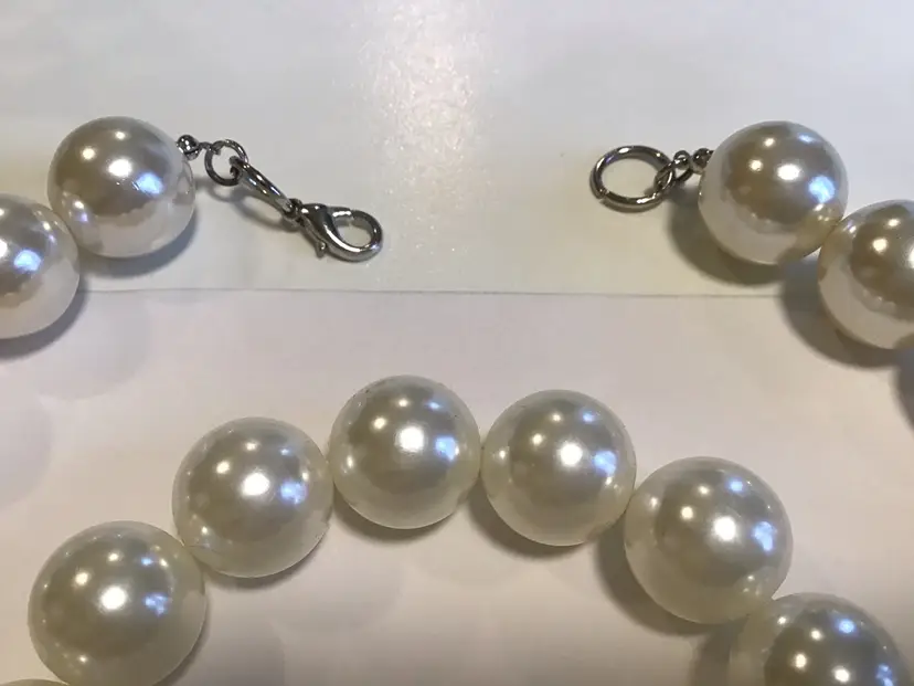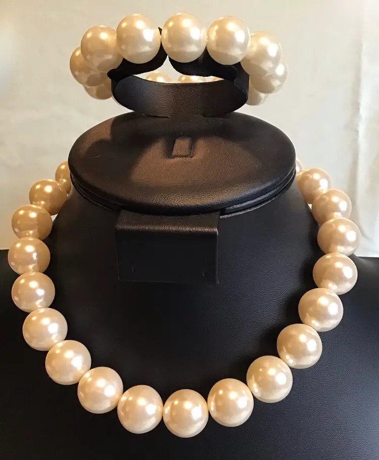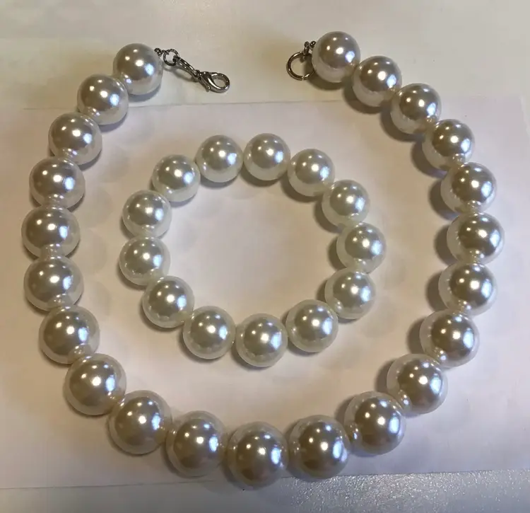 18mm faux Pearl necklace 16-1/2”, silver tone & 15mm stretch bracelet 7” super condition. #659