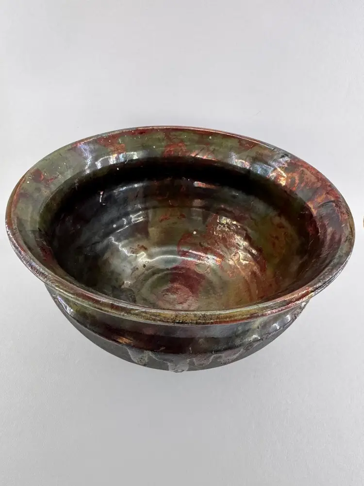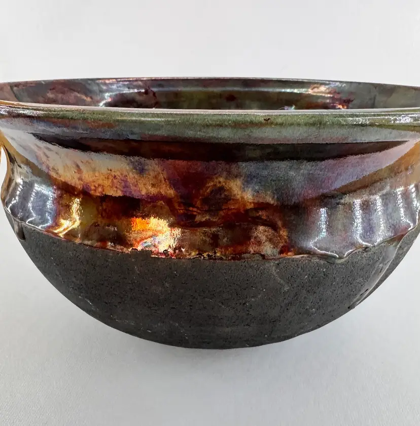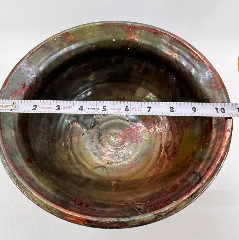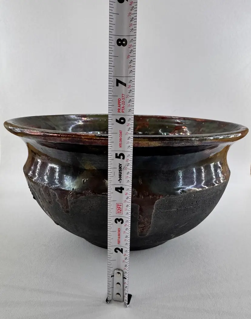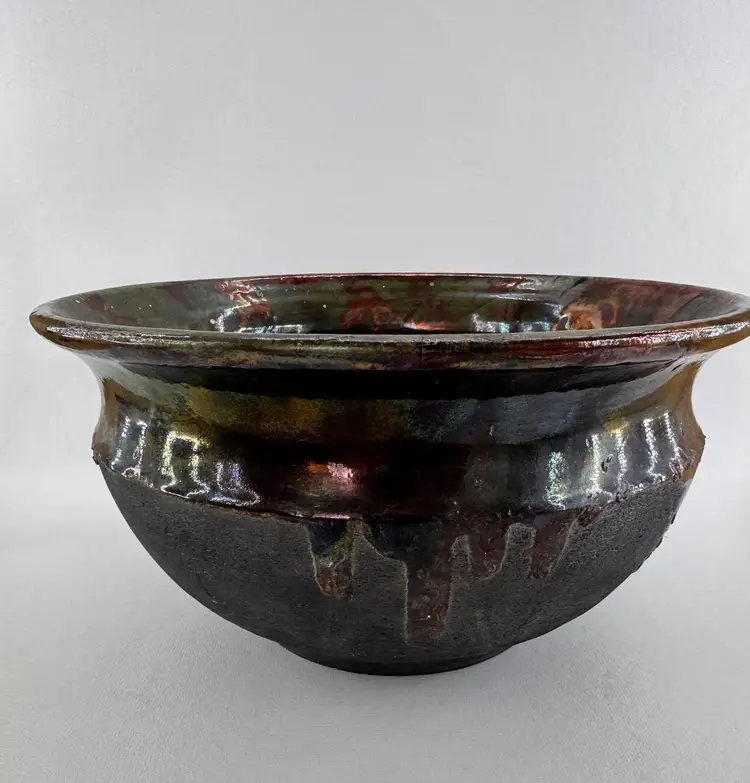 Stunning raku pottery bowl. There is a small crack on one side, as seen in two of the photos. Stands approximately 5 1/2 inches tall and 10 1/2 inches wide