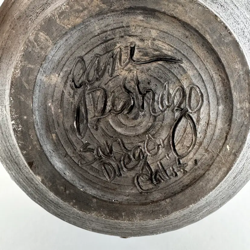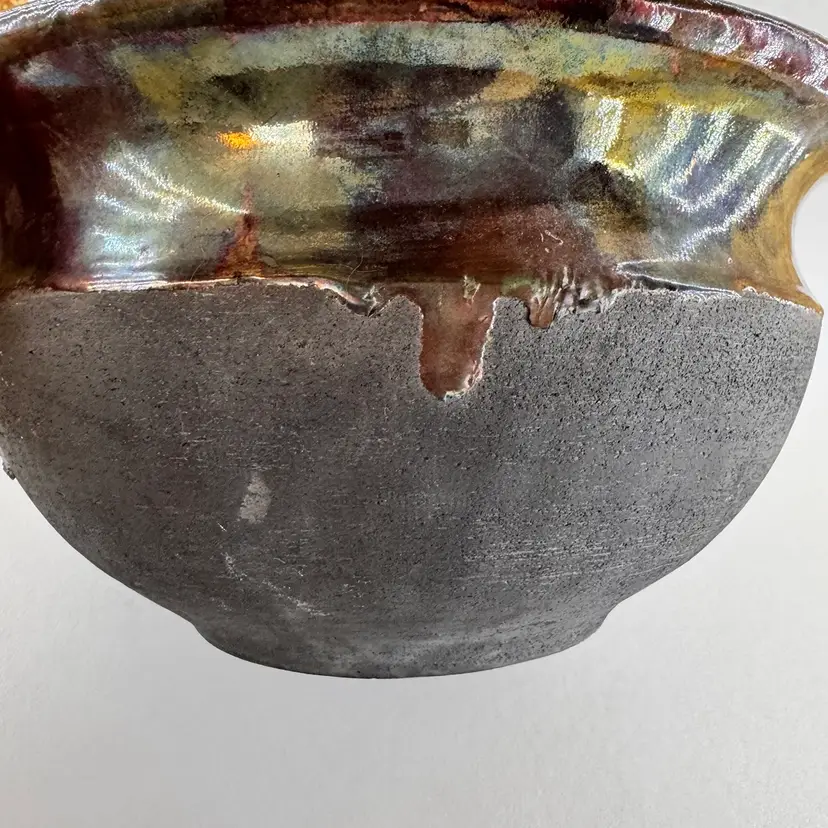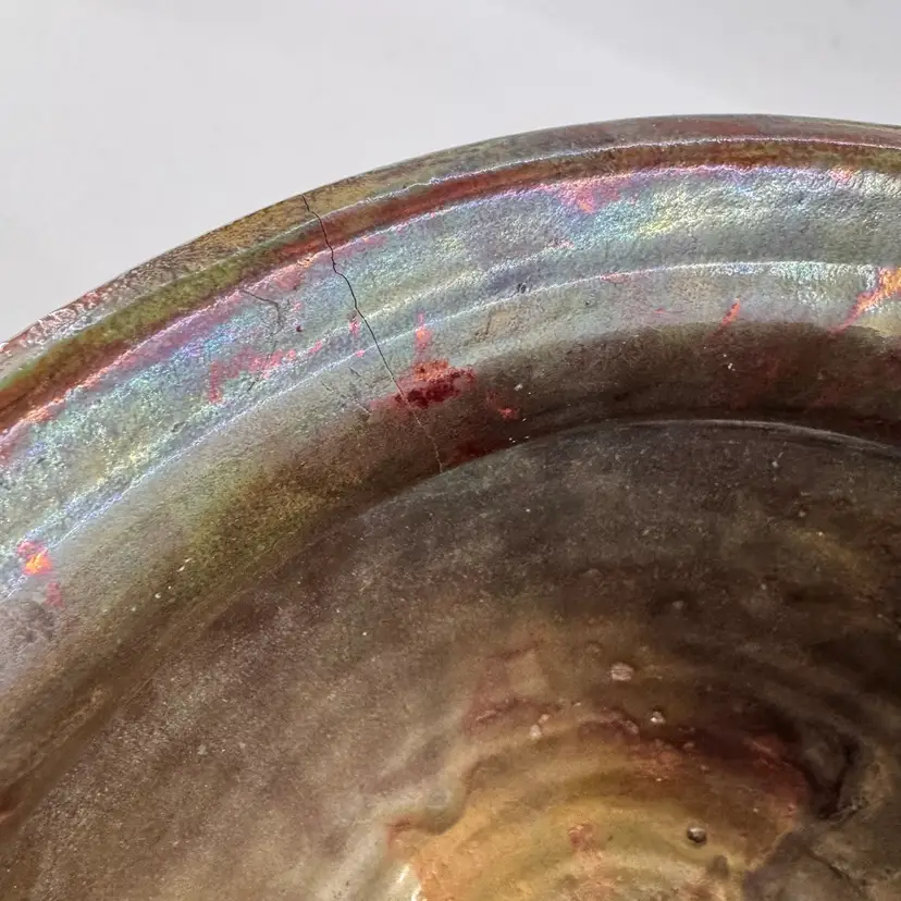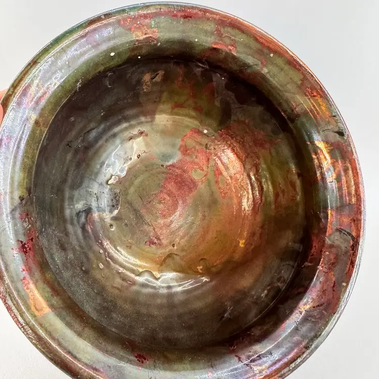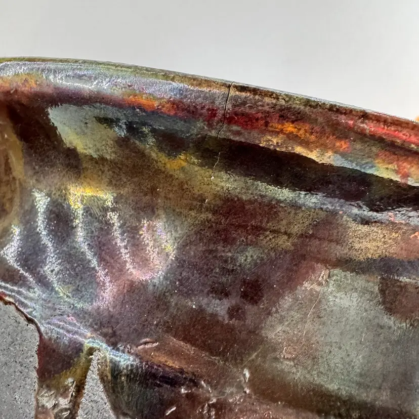 Stunning raku pottery bowl. There is a small crack on one side, as seen in two of the photos. Stands approximately 5 1/2 inches tall and 10 1/2 inches wide