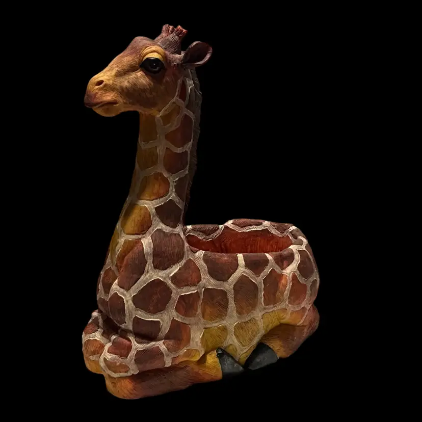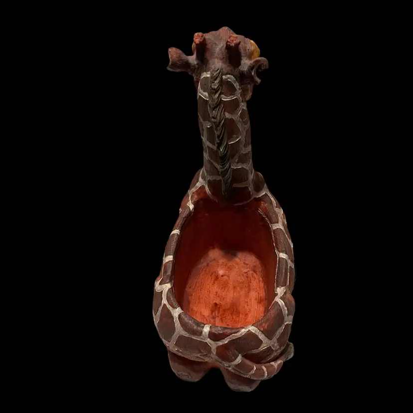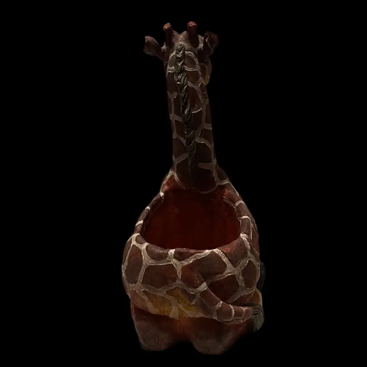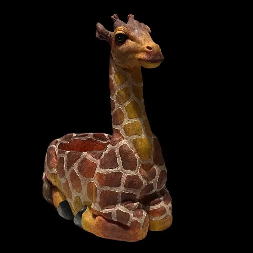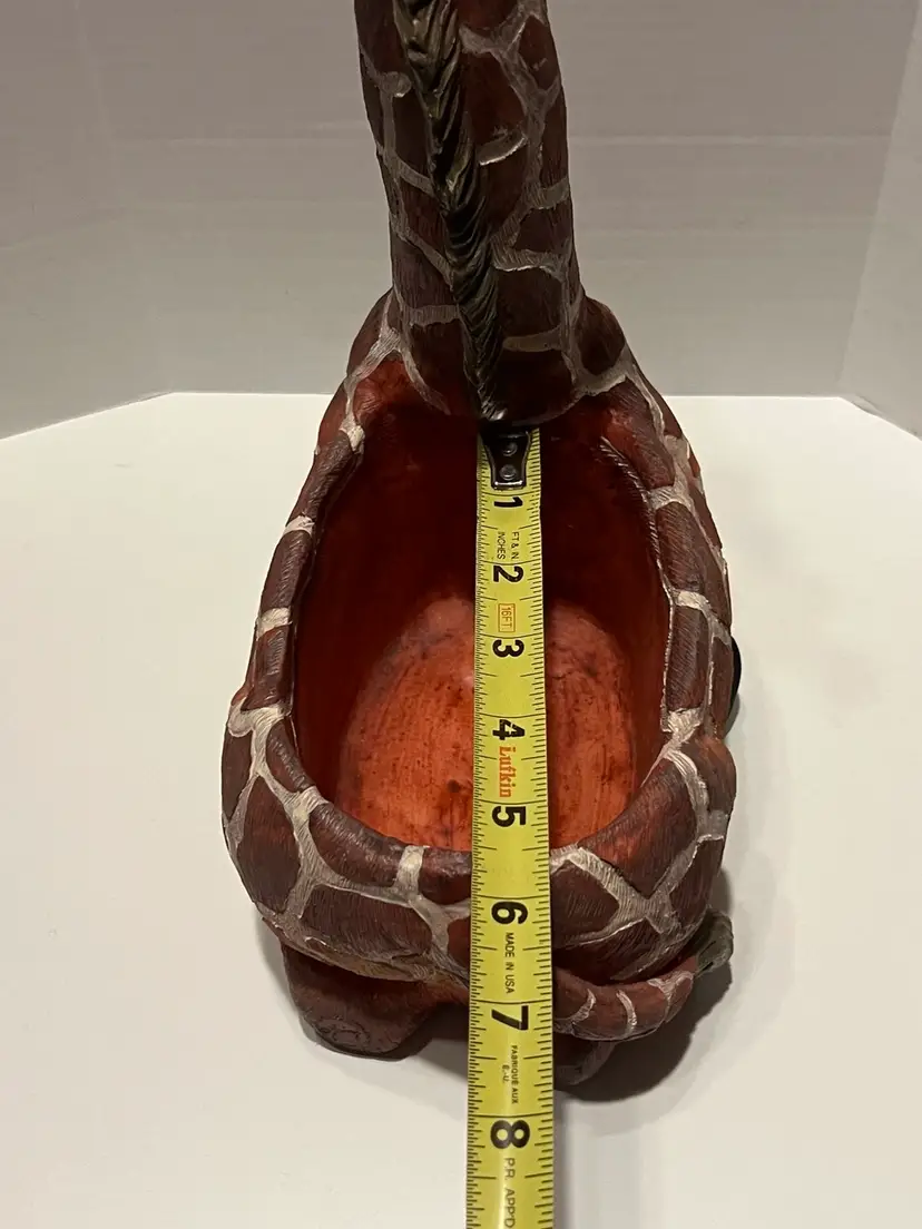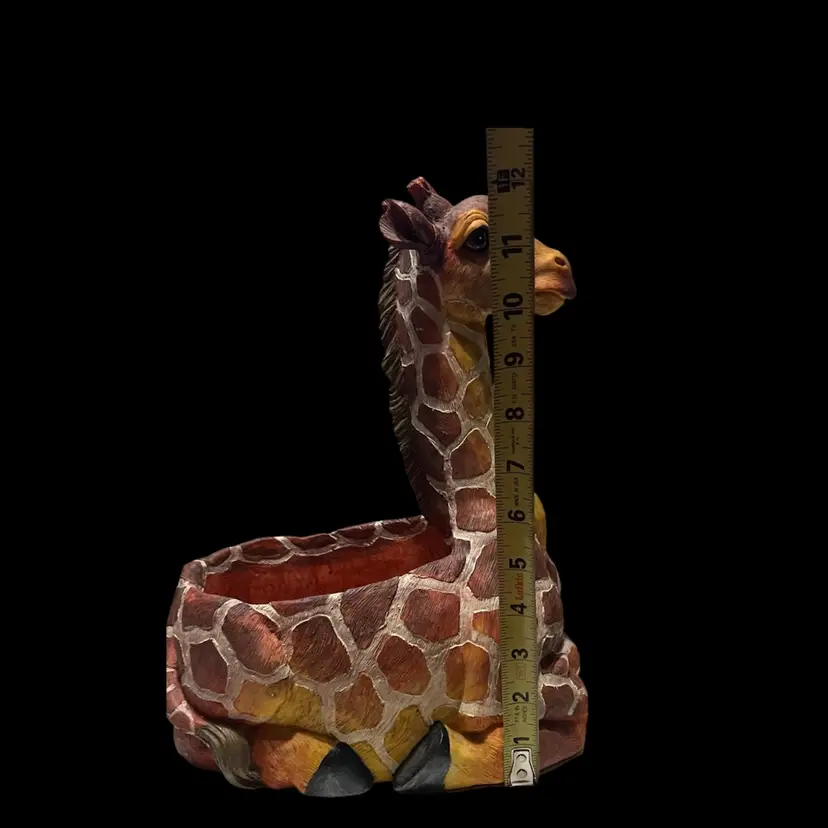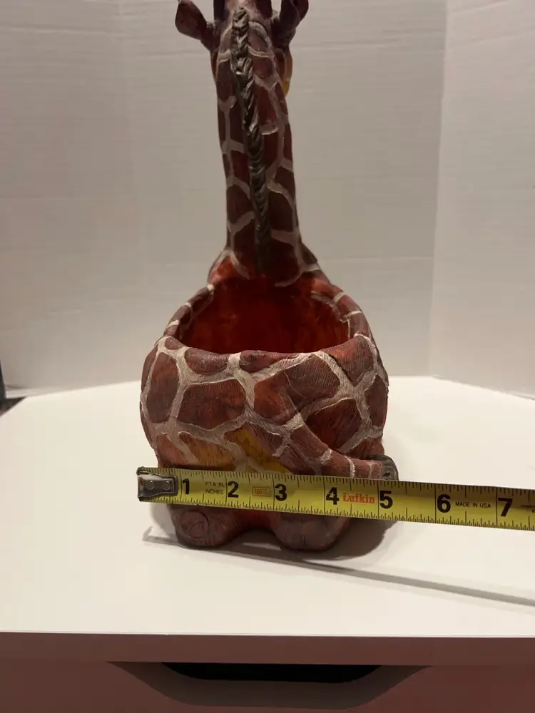 This precious giraffe would be great for any age; baby gift, to put on your deck,on your carport, or in a window sill. It is made of a resin. There resin isn’t smooth; it a really nice texture. The eye is very nice not sure if it’s resin or glass but definitely not painted. Planter hole is approximately 5” x 5.75”.
