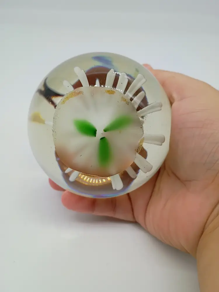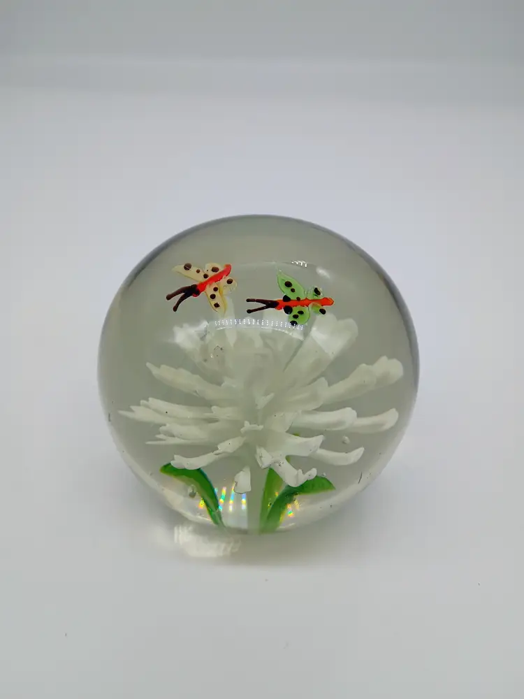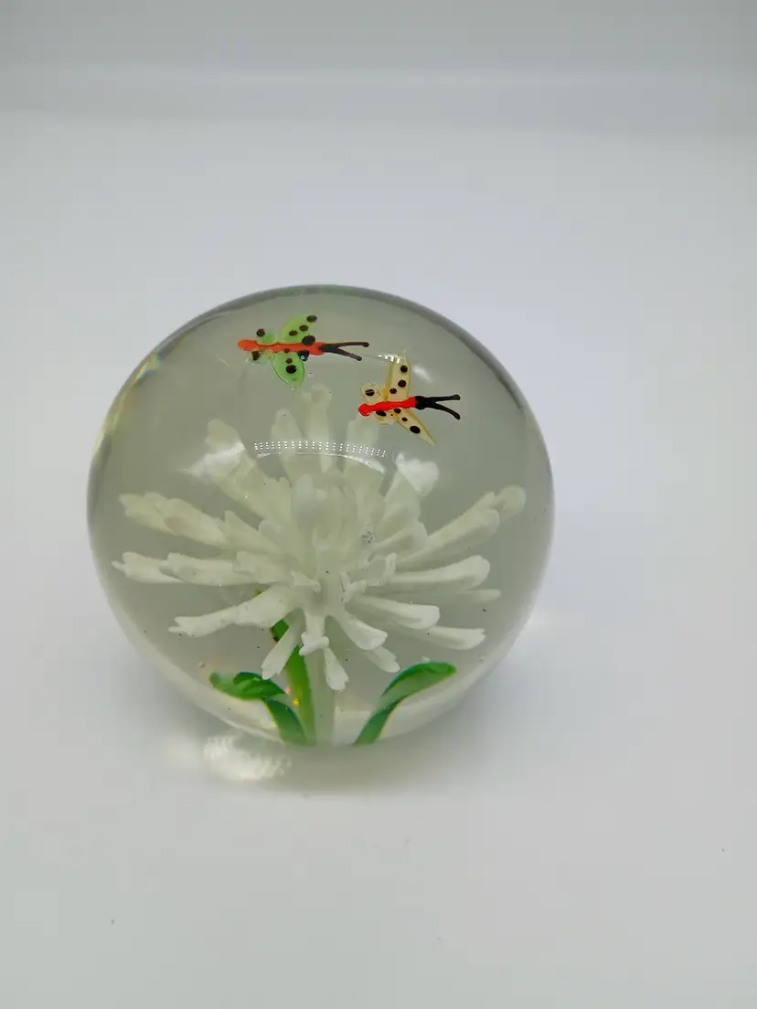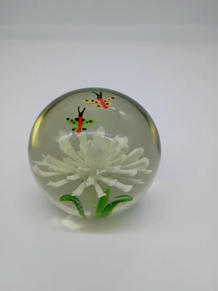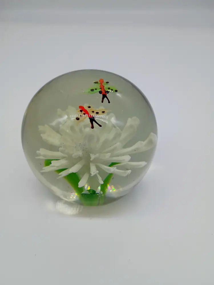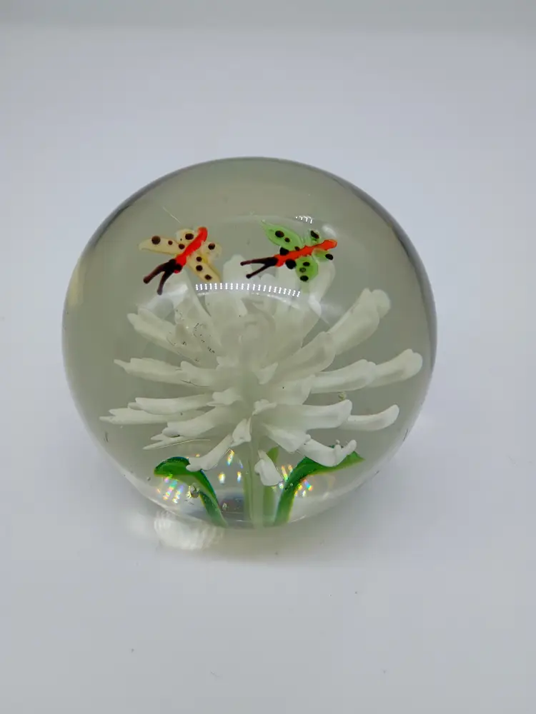 Large SILVESTRI Art Glass White Flower & Butterfly's Paperweight 3” Vintage . Circa 1990's. Very nicely with a centered white flower and green leaves and 2 butterflies in clear glass sphere. Heavy solid glass for it's size. This is preowned. No Chips cracks or flea bites, no bruises or fractures. Smooth cloudy bottom. This had a Silvestri sticker but it came off during cleaning. Excellent condition. Ships USPS domestically and UPS/USPS International Shipping globally