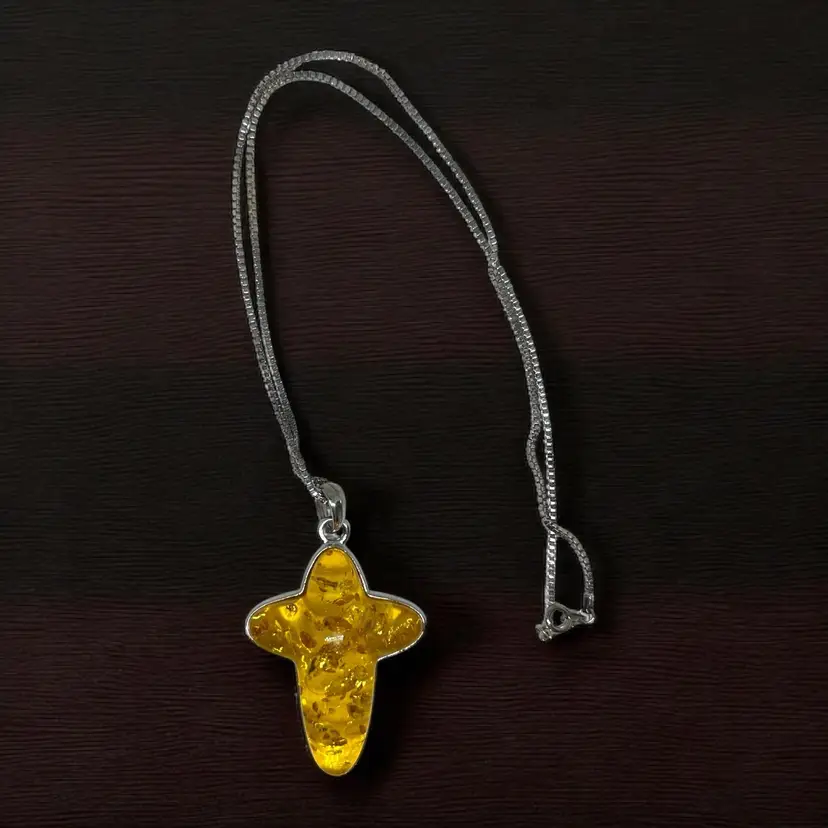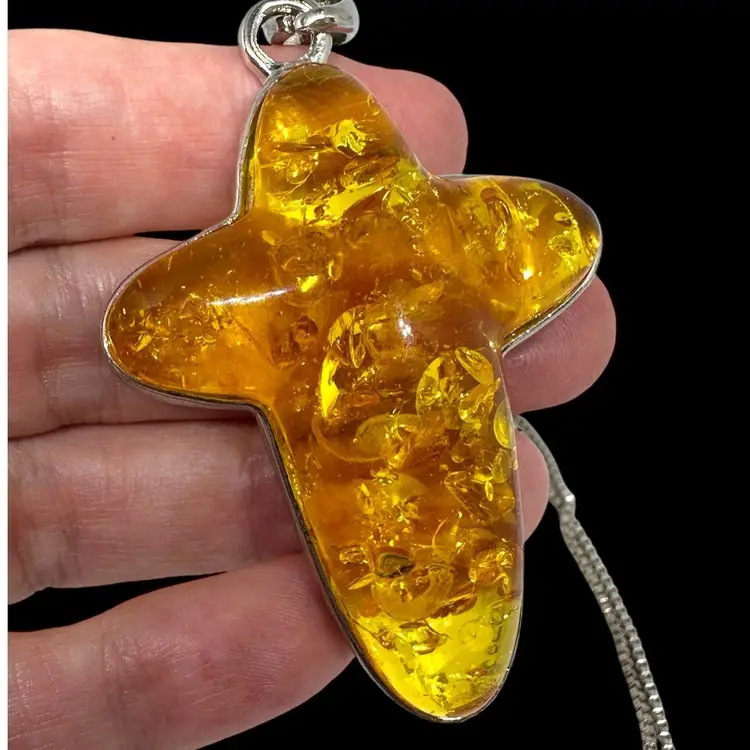 Large sun spangled Baltic Amber Cross pendant with silver box chain. Pendant is 2 1/2 inches in length. Chain is 24 inches in length. Tested. Authentic Amber