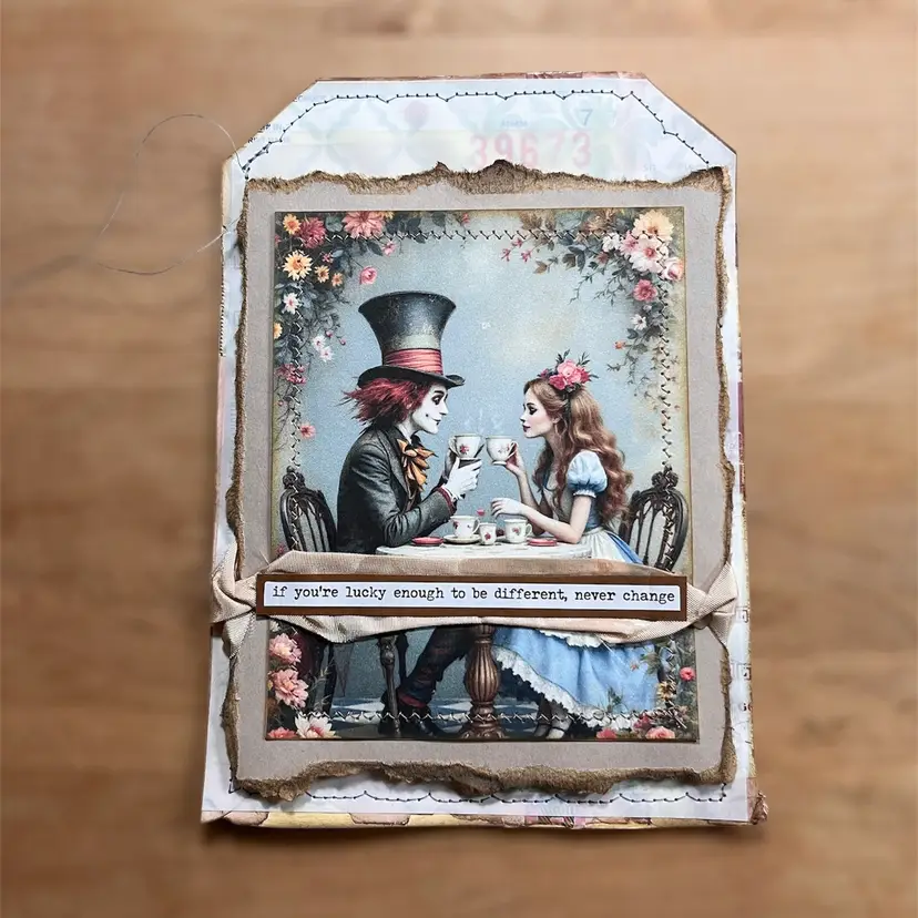This is an Alice in Wonderland inspired large tag with the words “if you’re lucky enough to be different never change”. This may not be a direct quote from the book, but it fits so well doesn't it? The quote was something I needed to hear so it really spoke to me when I created this tag.