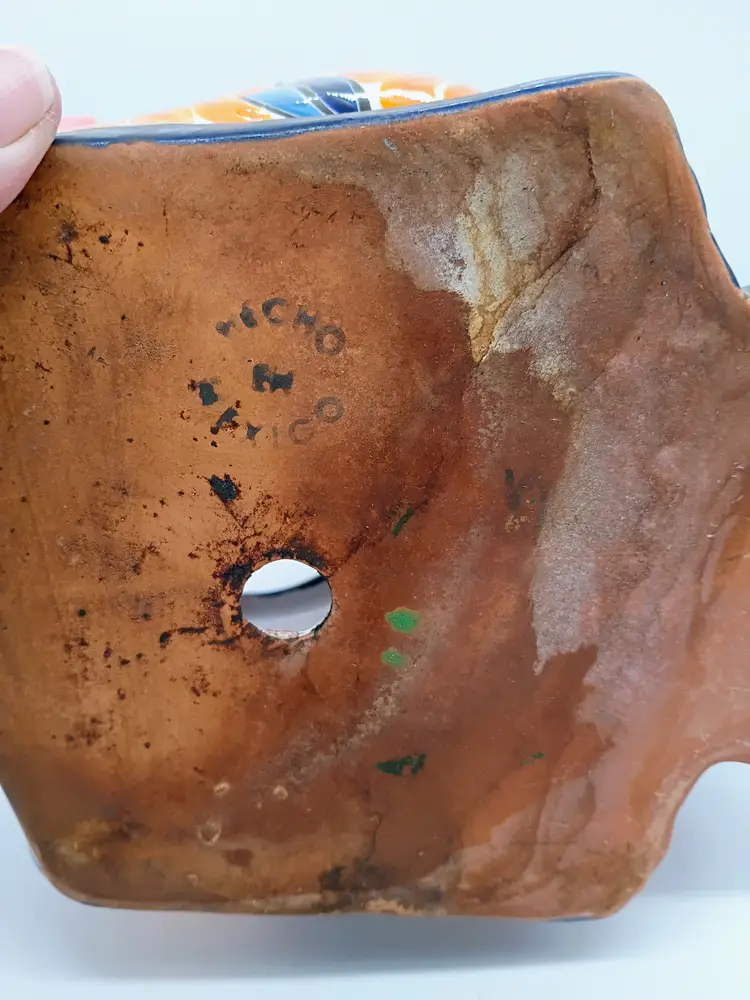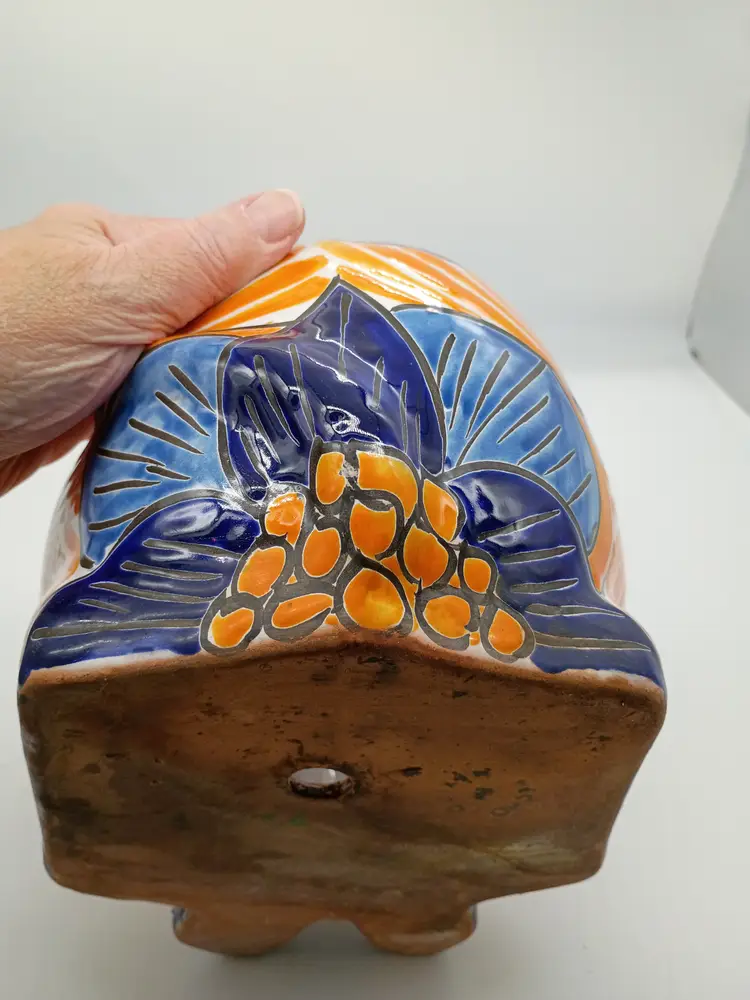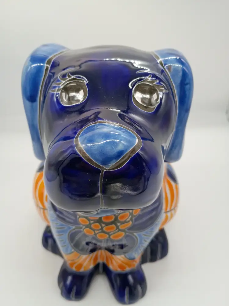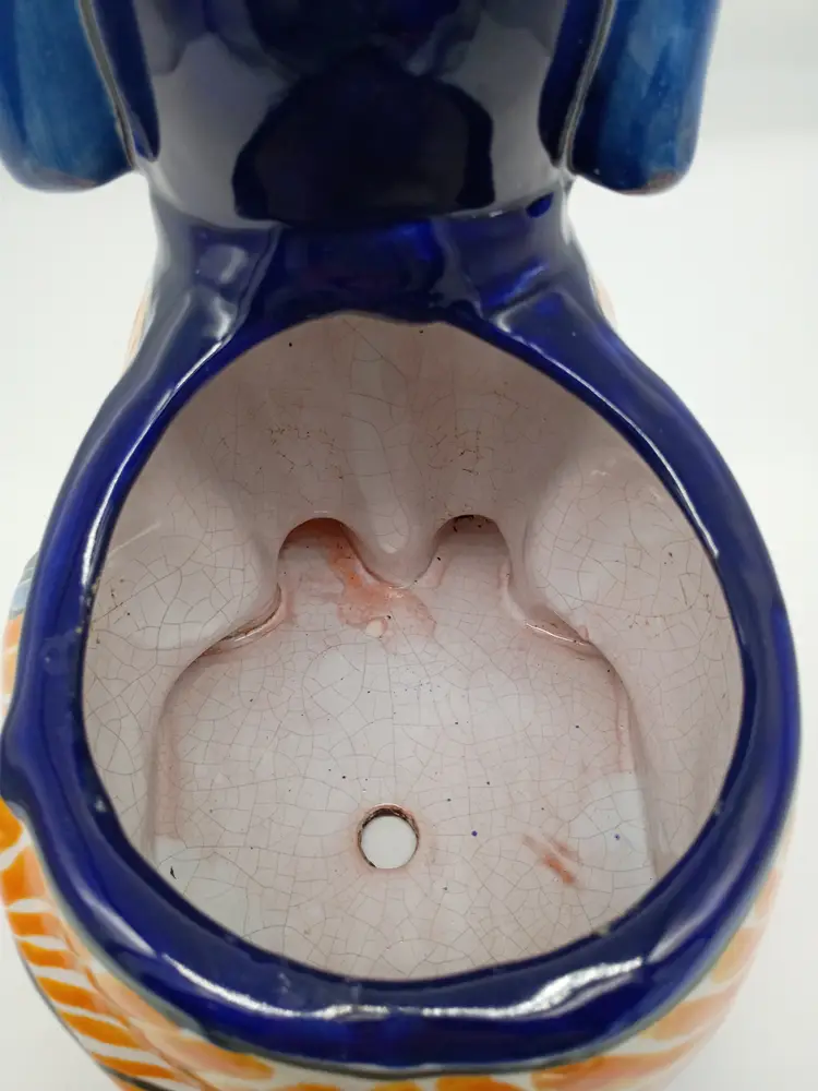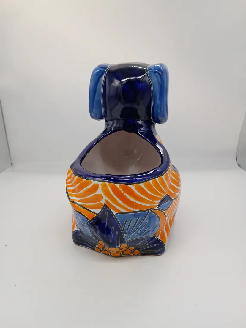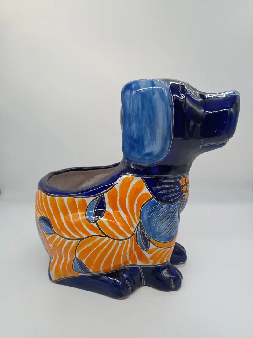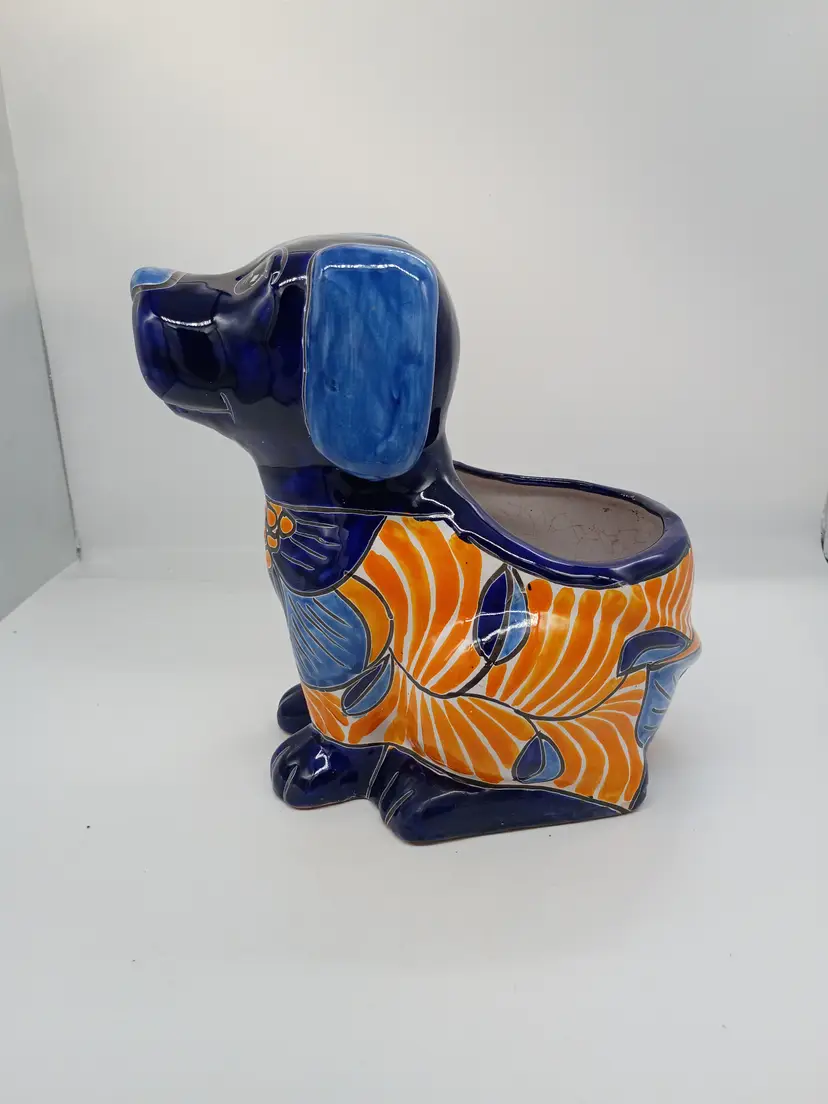 Large Talavera Mexicn Pottery Puppy Dog Planter Cobalt & Orange Floral Pattern. This is 10 inches tall and 11.5 inches long and 7.5 inches wide. This is preowned. No chips cracks or flea bites. This is a large size and can hold a fairly substansial plant or arrangement. No chips or cracks no flea bites, glaze has some interior crazing as expected with use. Has been cleaned free of dirt on inside. Excellent condition. Ships USPS