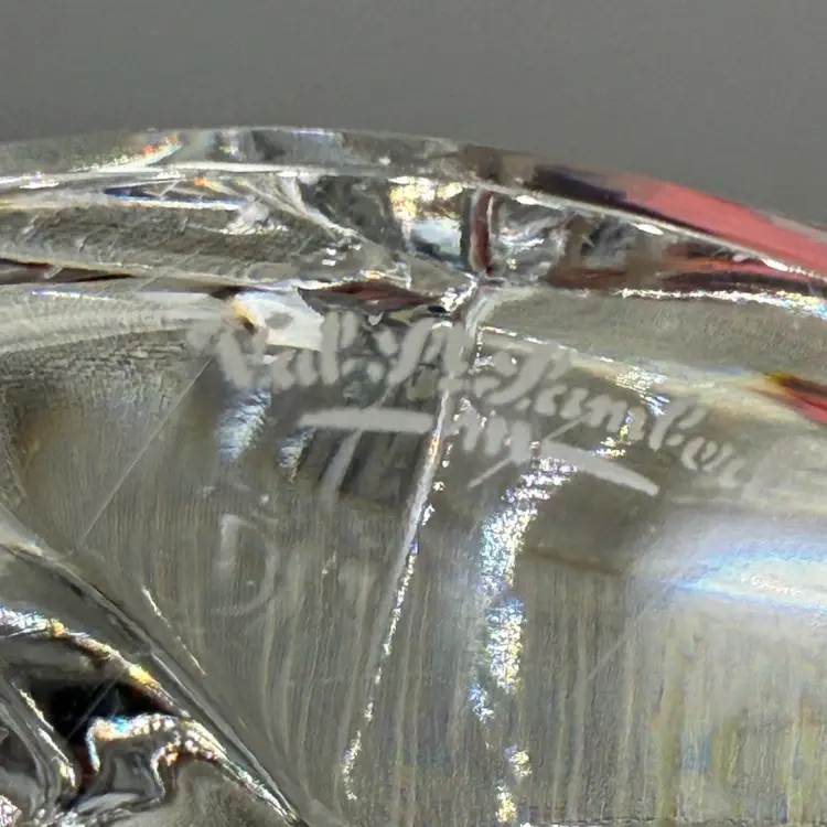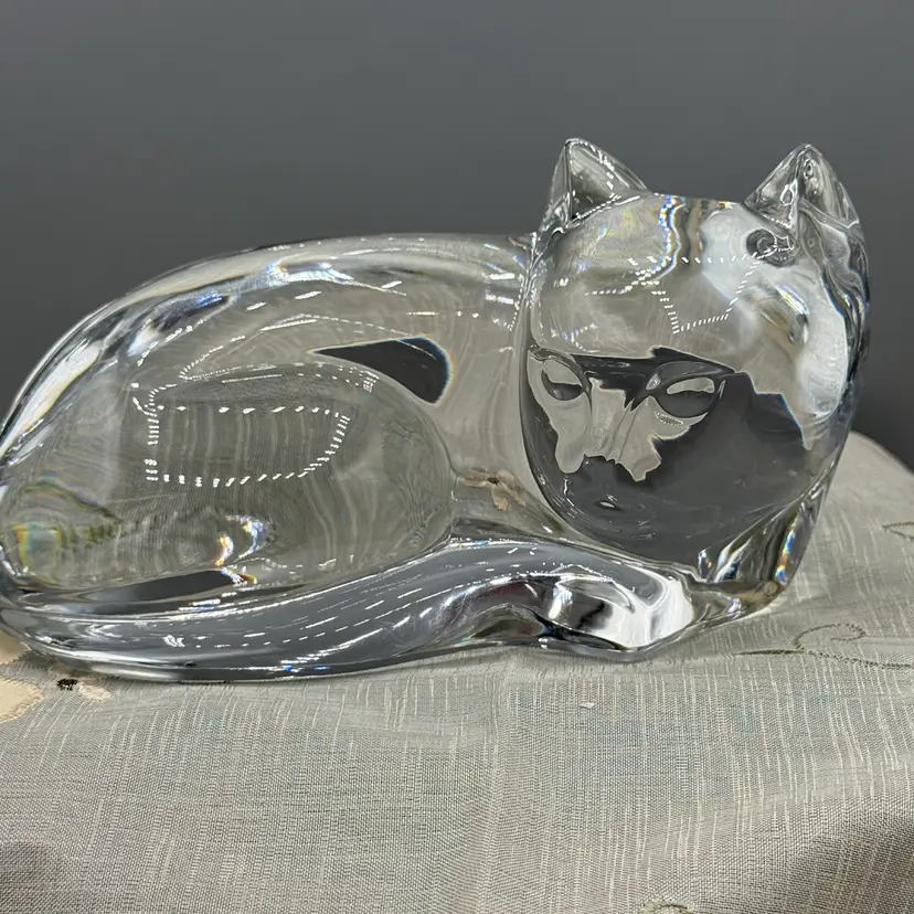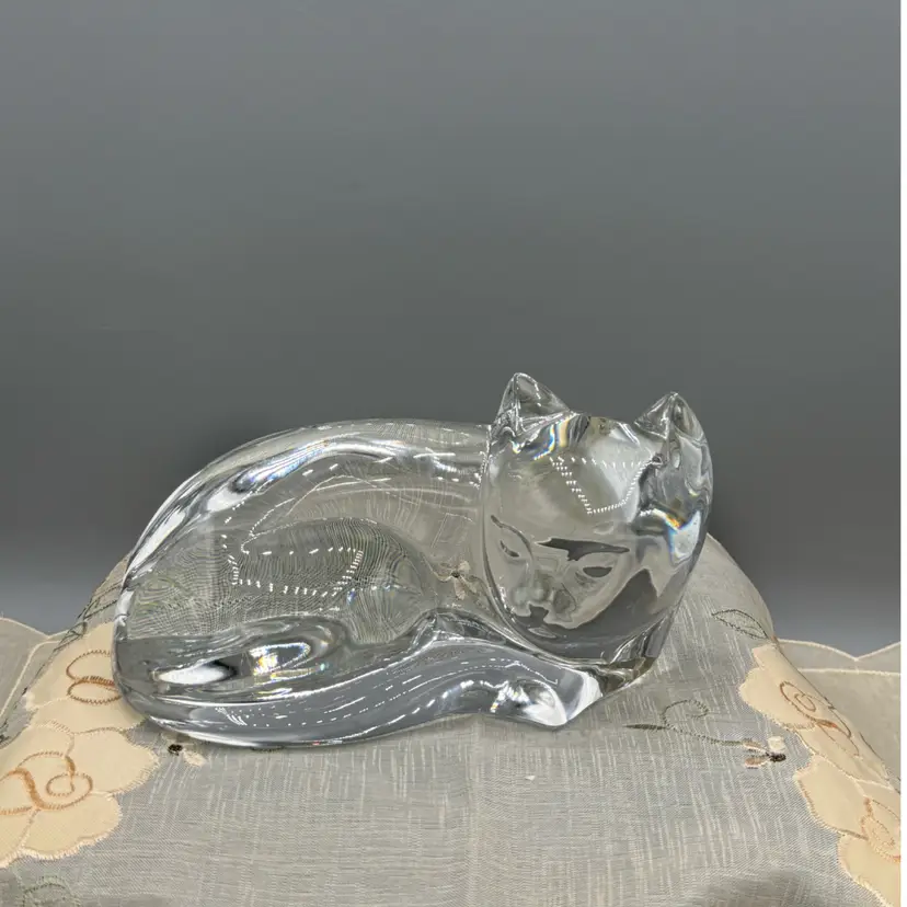 crafted by the renowned Belgian glassworks Val Saint Lambert in the 1980s. Designed by artist Katherine De Sousa, the piece features a stylized "curled up" or "sleeping" pose with graceful, minimalist curves that beautifully catch the light. This is the large version of the model, measuring approximately 6.5” inches in length and weighing nearly 2 lbs of high-quality, clear crystal.