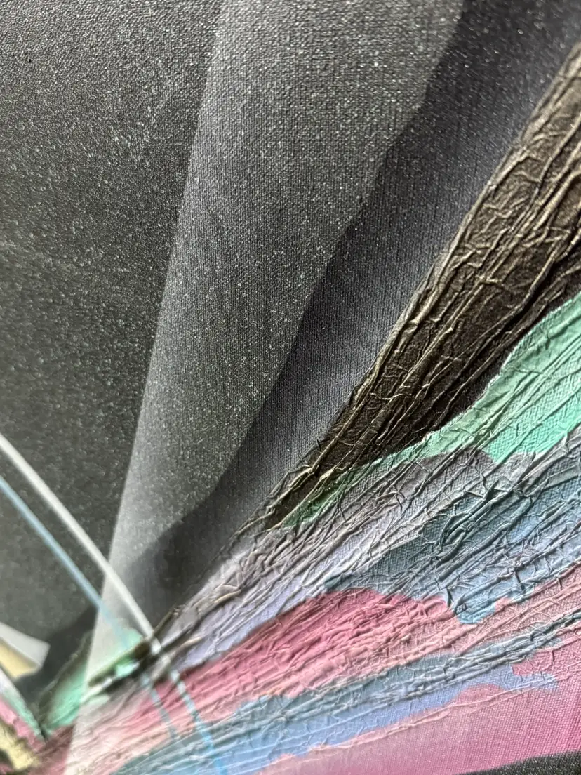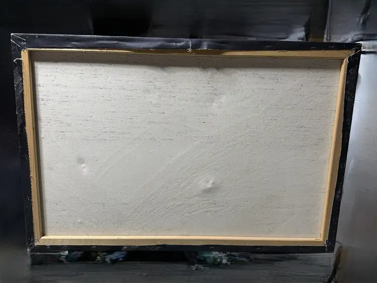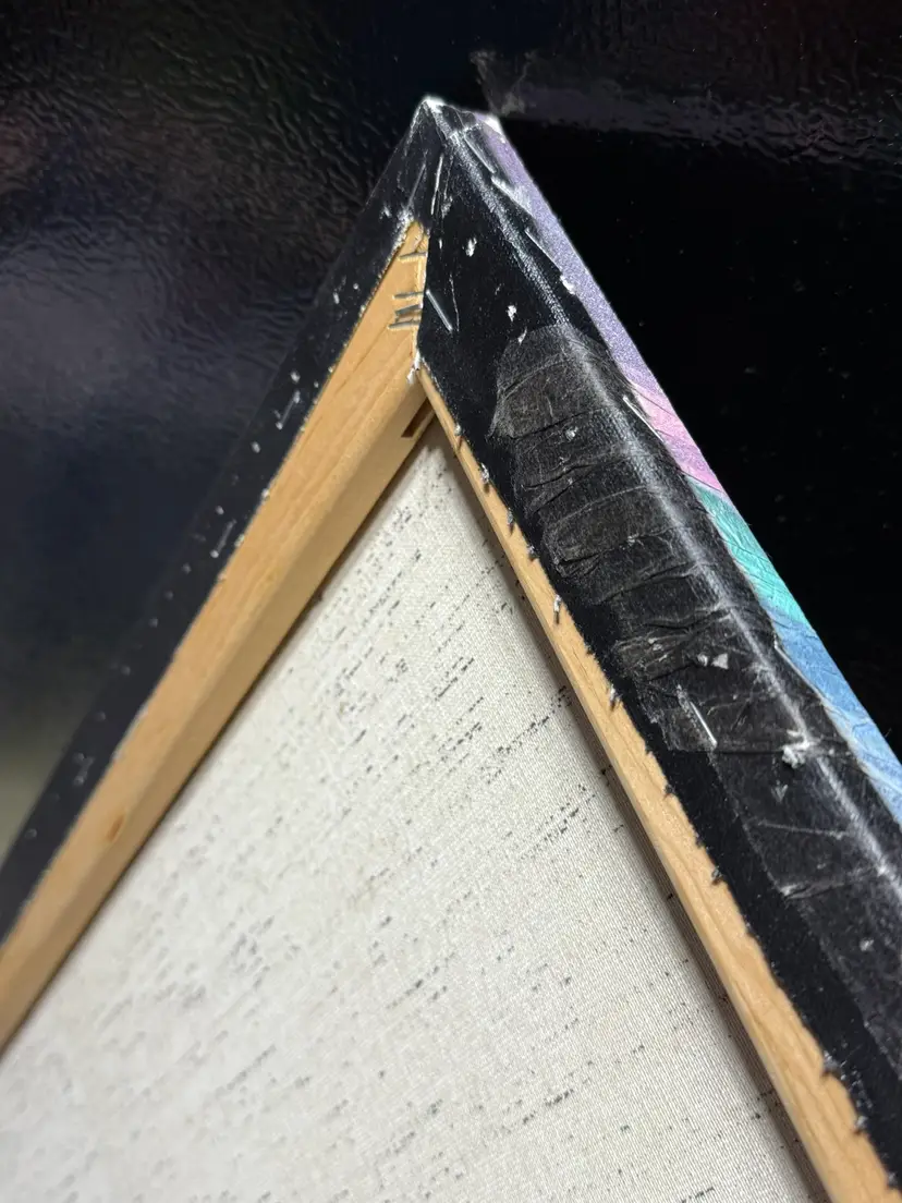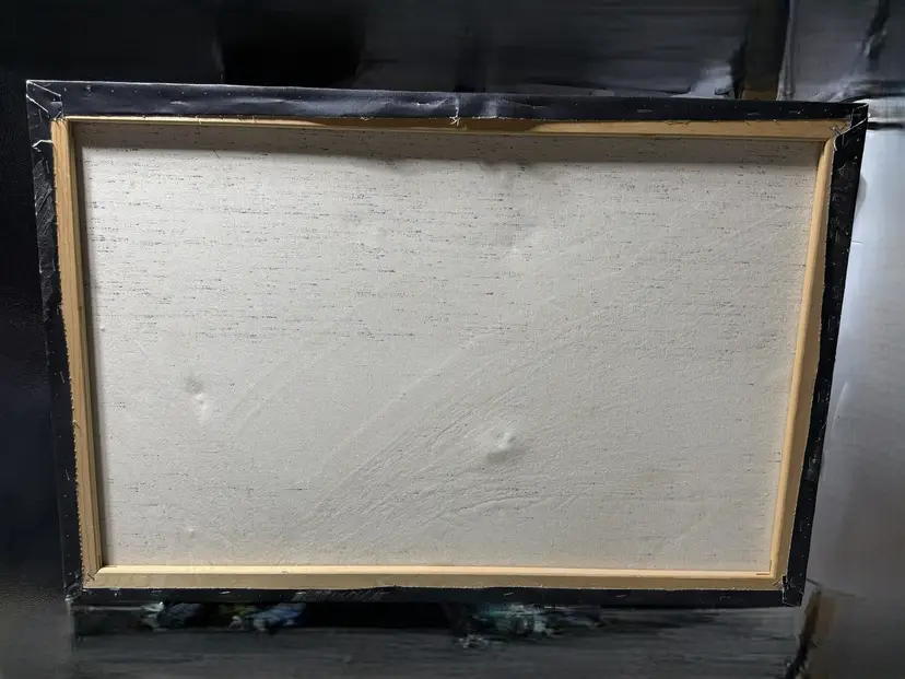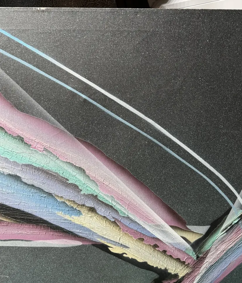Talk about a statement piece! This is a striking, colorful flashback to the era of excess. It measures 24 x 36". Please see the photos, as they are part of the description. There are some flaws, as shown in the last few pictures. One photo shows how the media is lifting a bit in a spot, and the back shows that there are some "dents" in the canvas that are not very noticeable from the front.