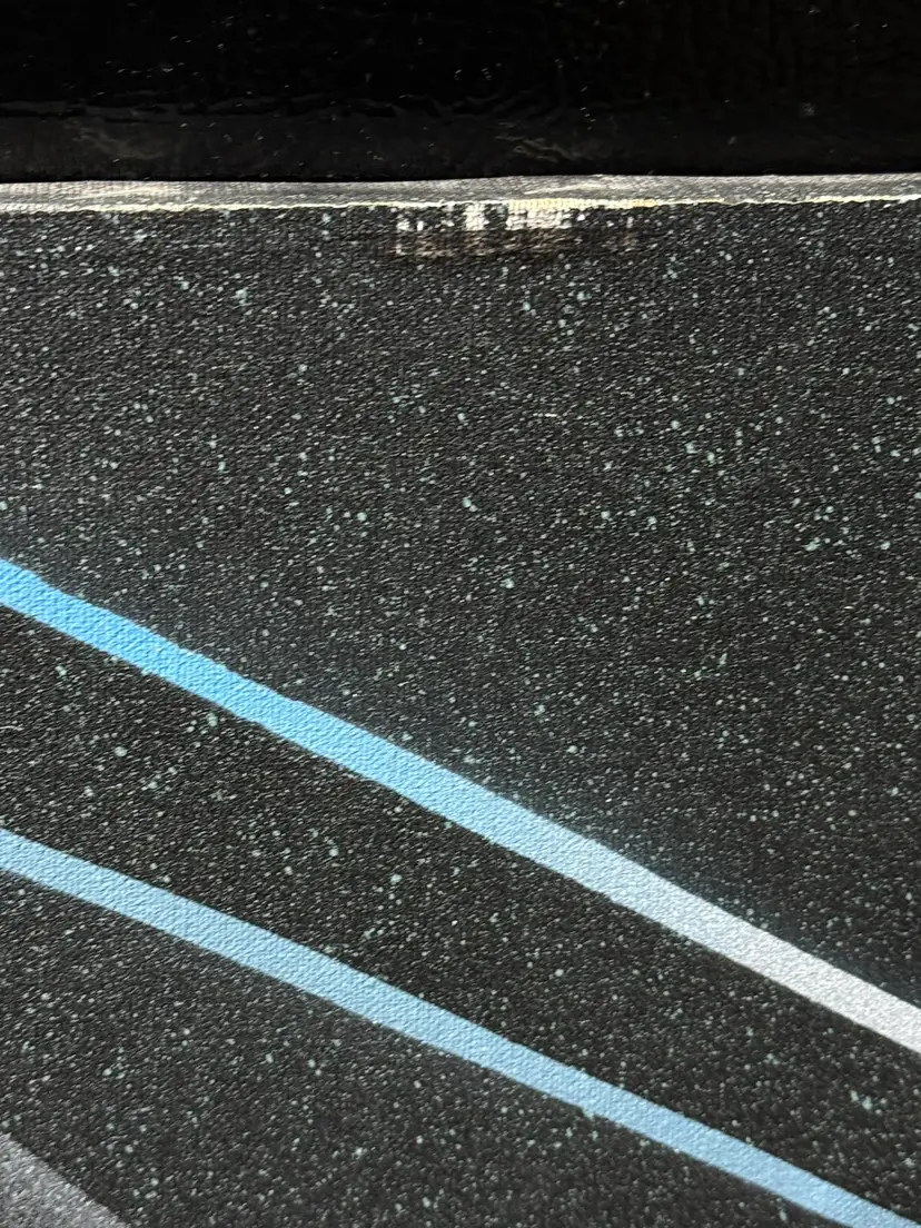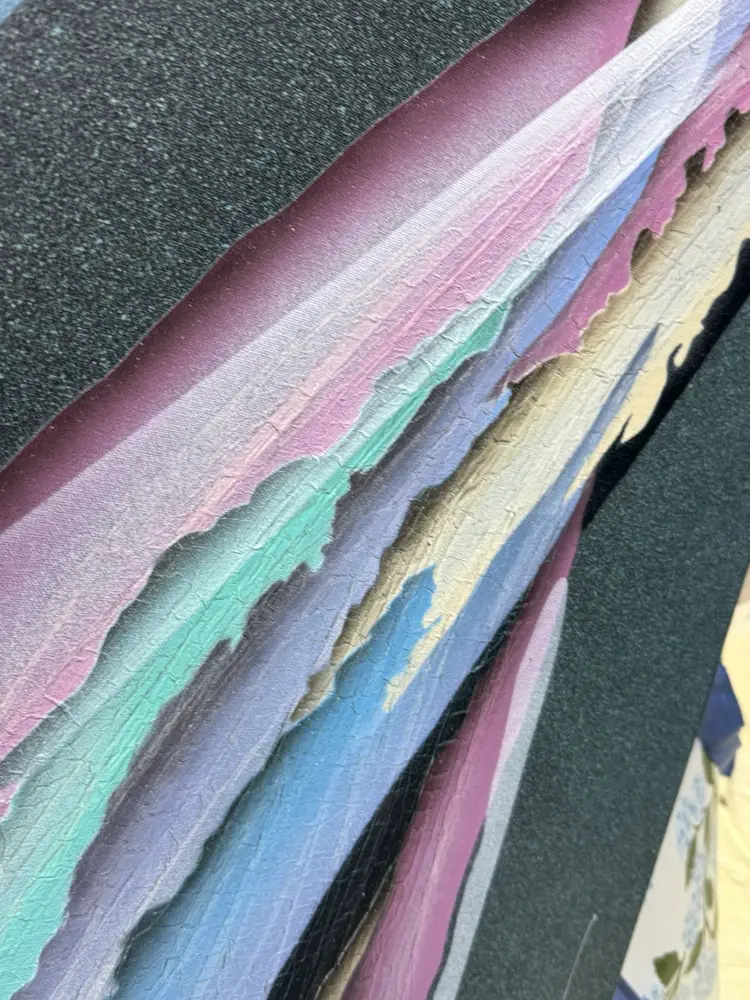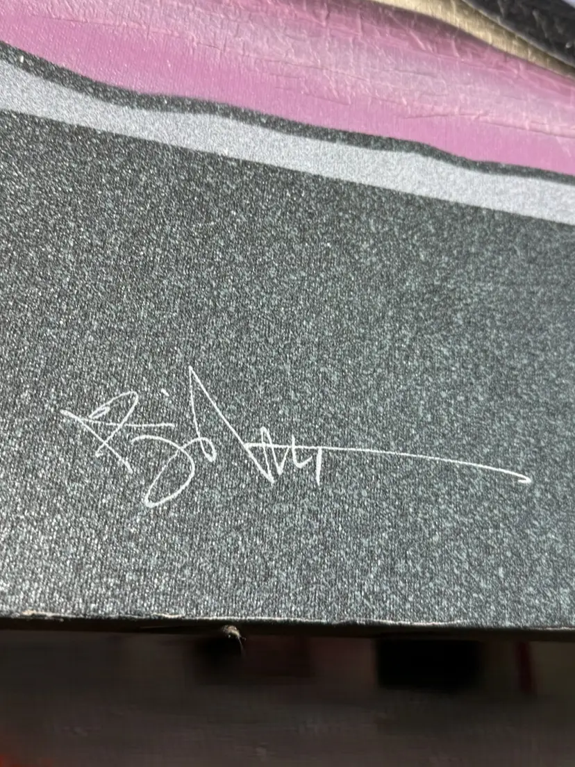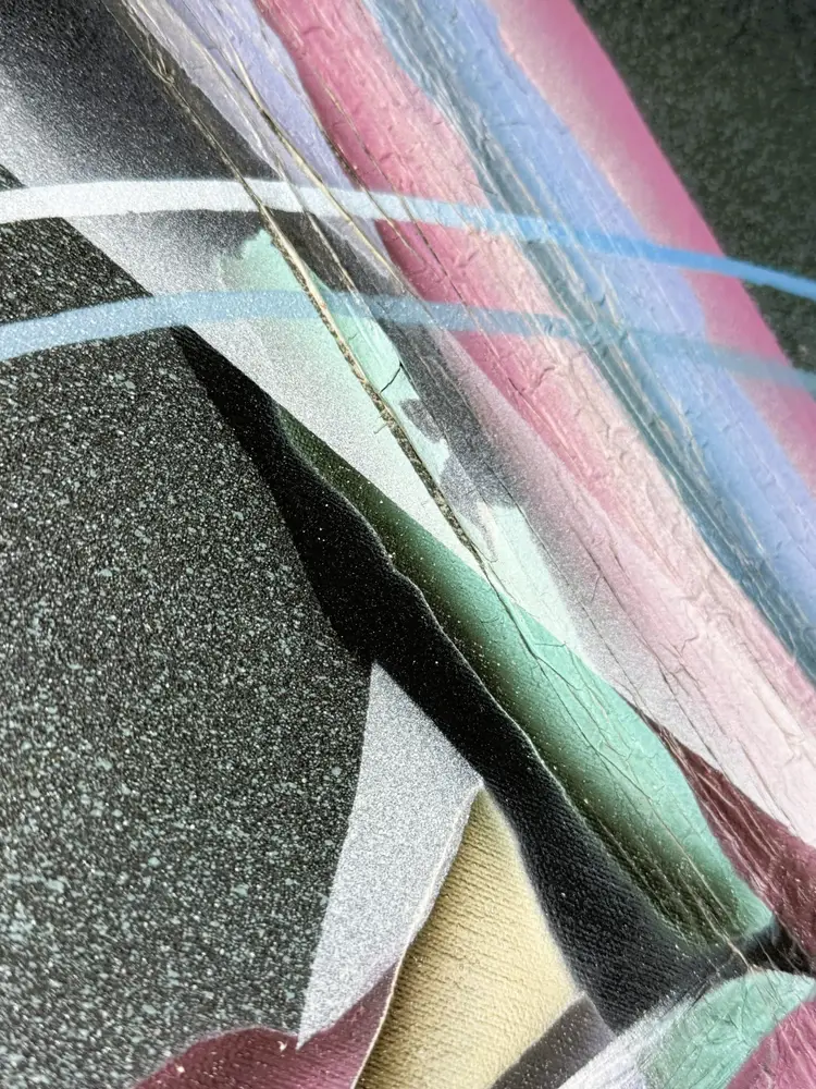 Talk about a statement piece! This is a striking, colorful flashback to the era of excess. It measures 24 x 36". Please see the photos, as they are part of the description. There are some flaws, as shown in the last few pictures. One photo shows how the media is lifting a bit in a spot, and the back shows that there are some "dents" in the canvas that are not very noticeable from the front.
