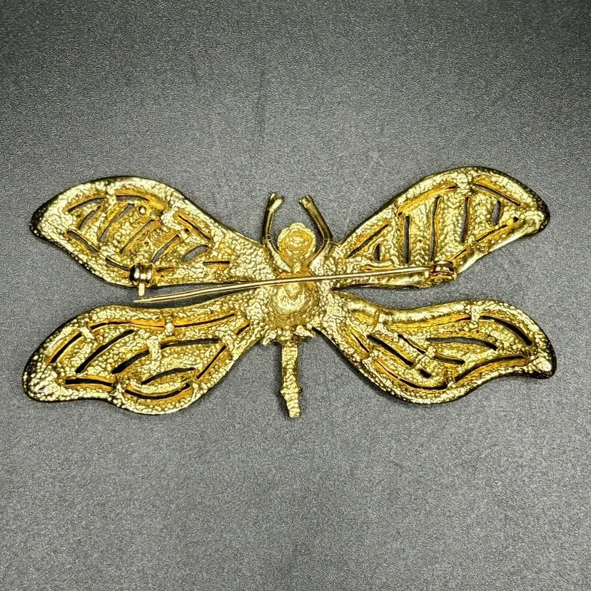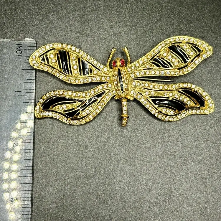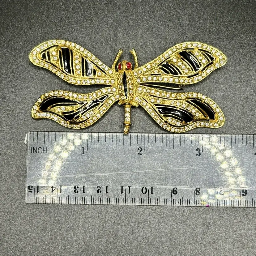 Beautiful oversized Large Dragonfly brooch White, black and red rhinestones Black enamel on gold tone Unmarked 3.5" wide