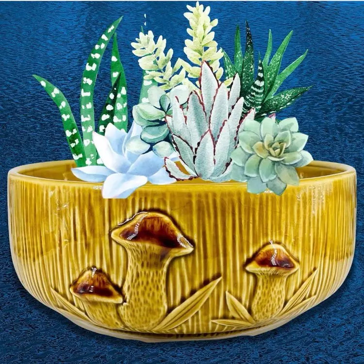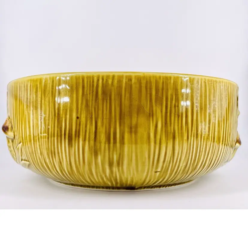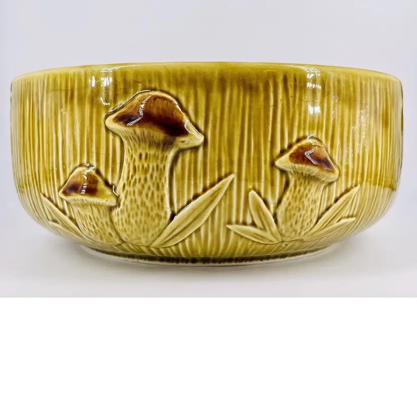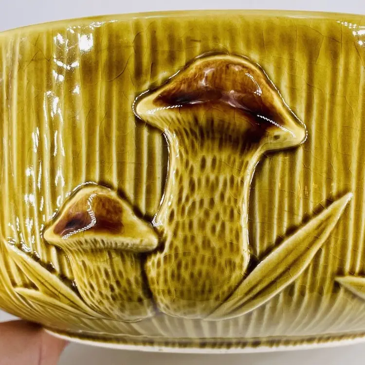 This item is in excellent condition. No chips or cracks. Slight crazing. Three mushrooms on each side. See images for details. Measures 8 1/2" in diameter by 3 3/8" tall Weighs 2lbs 5oz