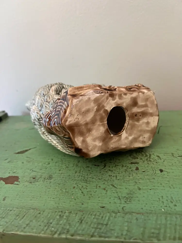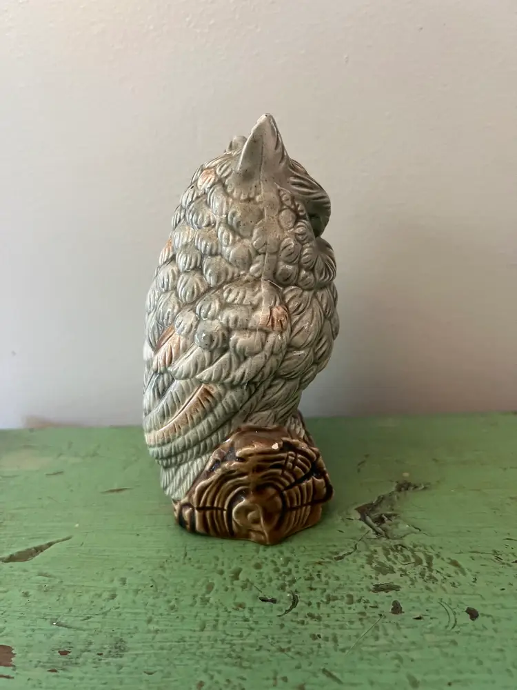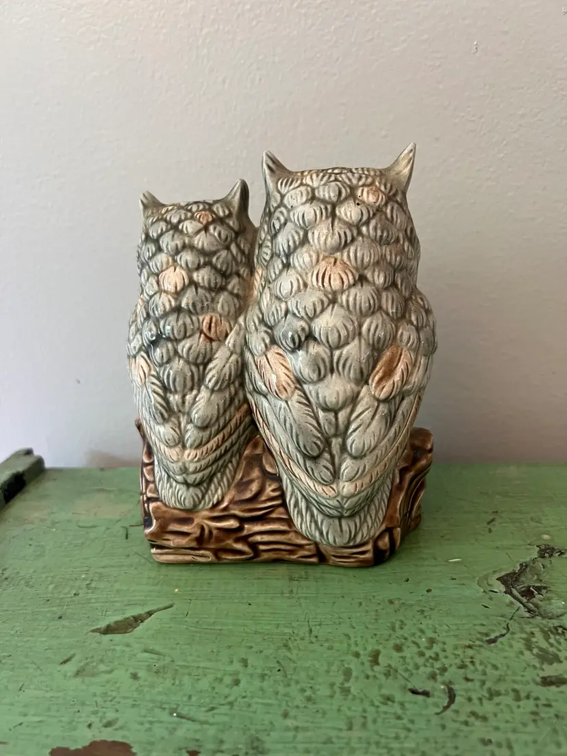 Large Vintage Owl Statue. Ceramic Hand Painted wise owls on a branch. Ceramic with high gloss glaze 6" tall x 5" wide. Good condition. A couple small chips in the glaze .