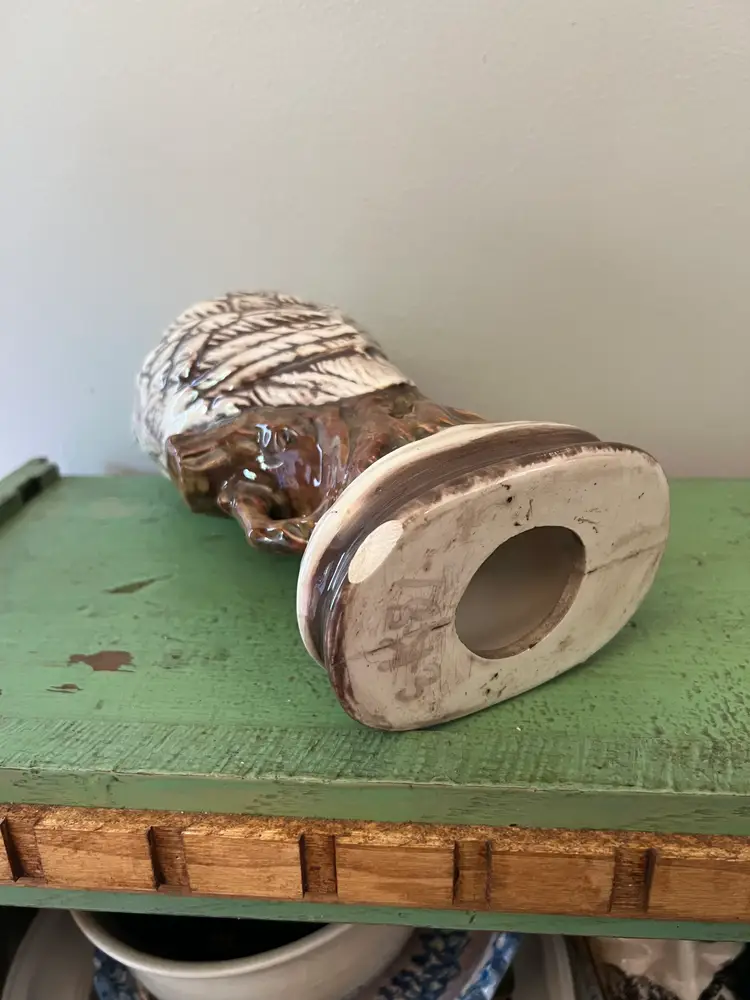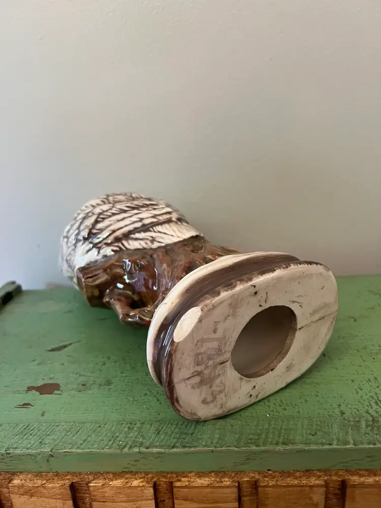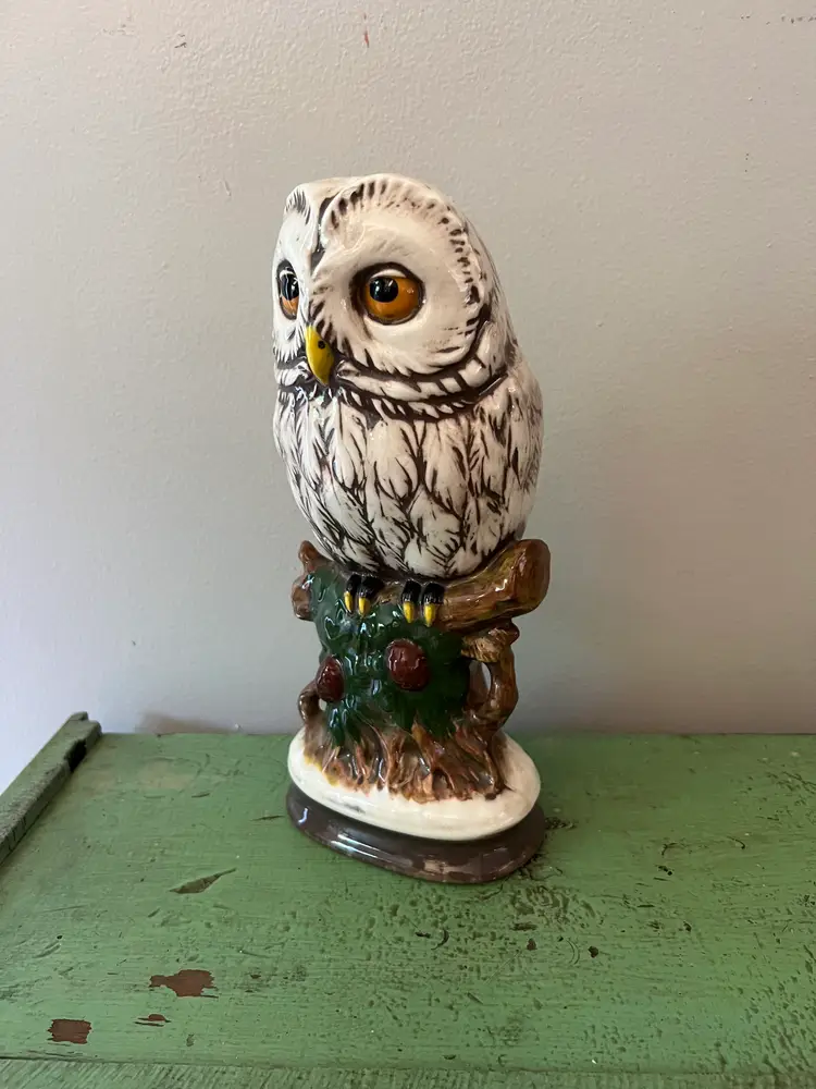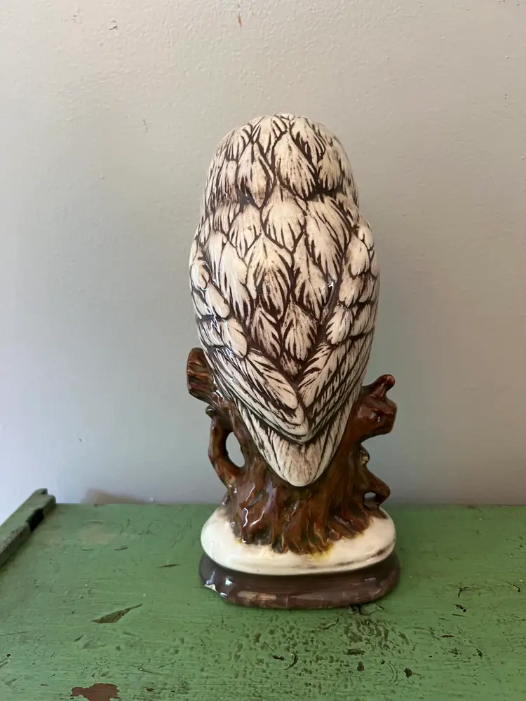 Large Vintage Owl Statue. 10.75" tall. 2lbs 3 oz before packaging. 1970s Ceramic Hand Painted Owl. Great wide eyes- Snowy White Owl. wise owls on a branch. Good condition. There is a chip on the bottom rim. Please see last photo
